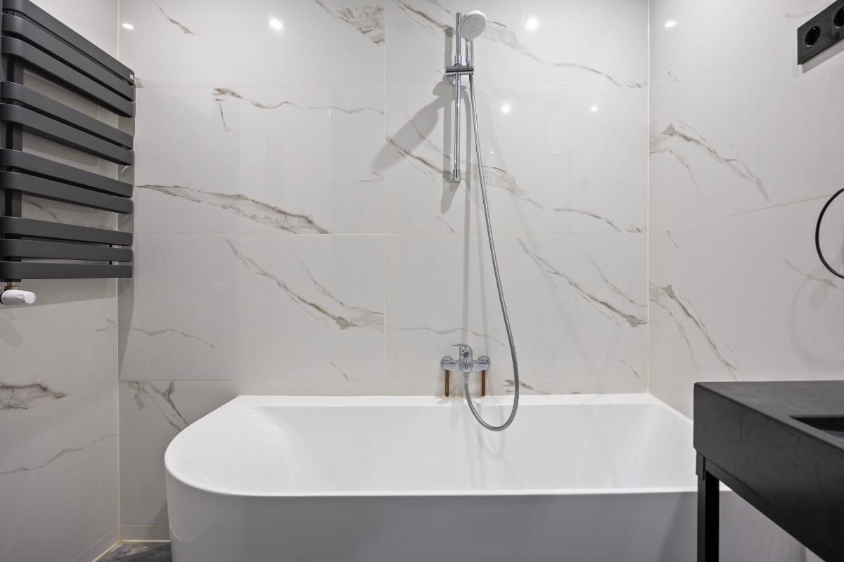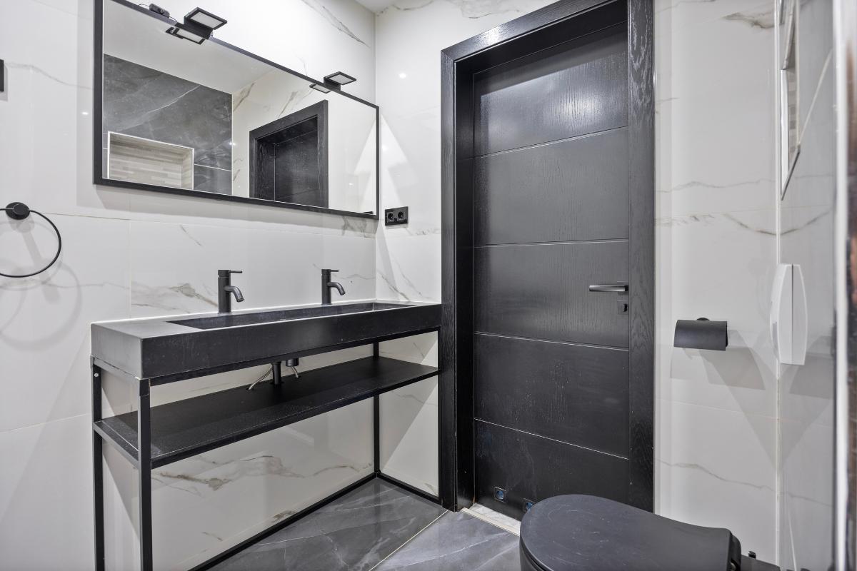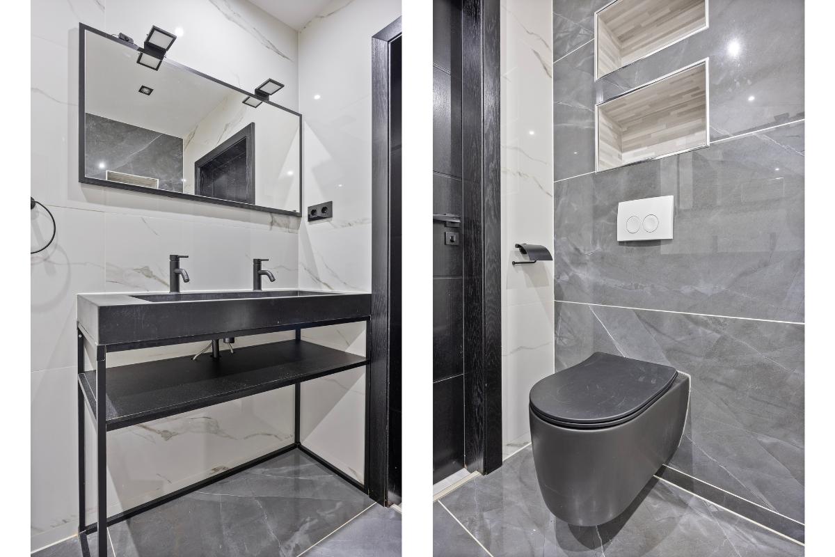De moderne badkamer is voorzien van een douche/ligbad, toilet en wastafelmeubel.
