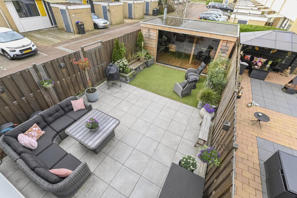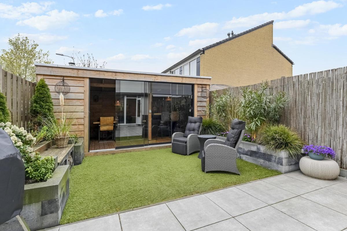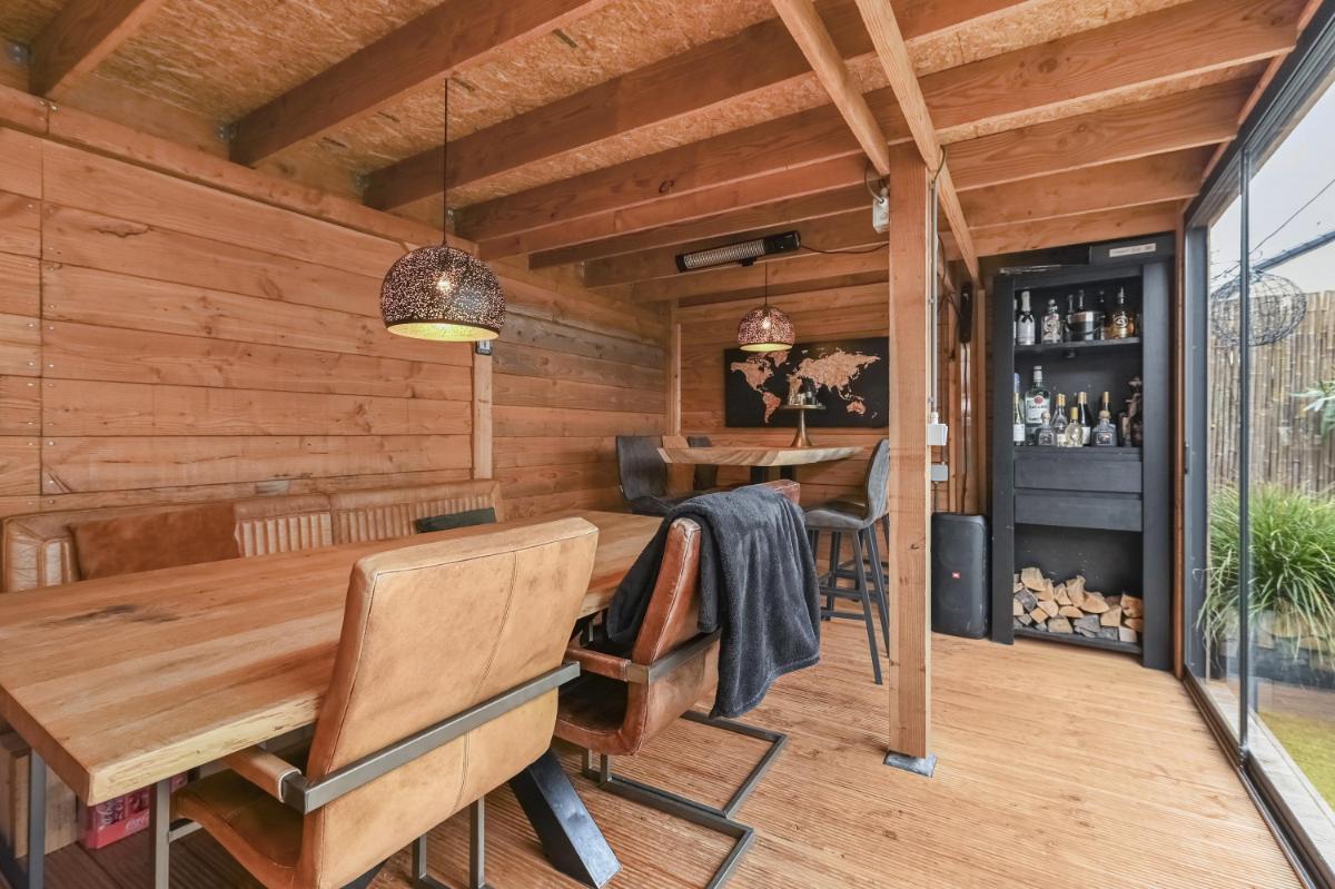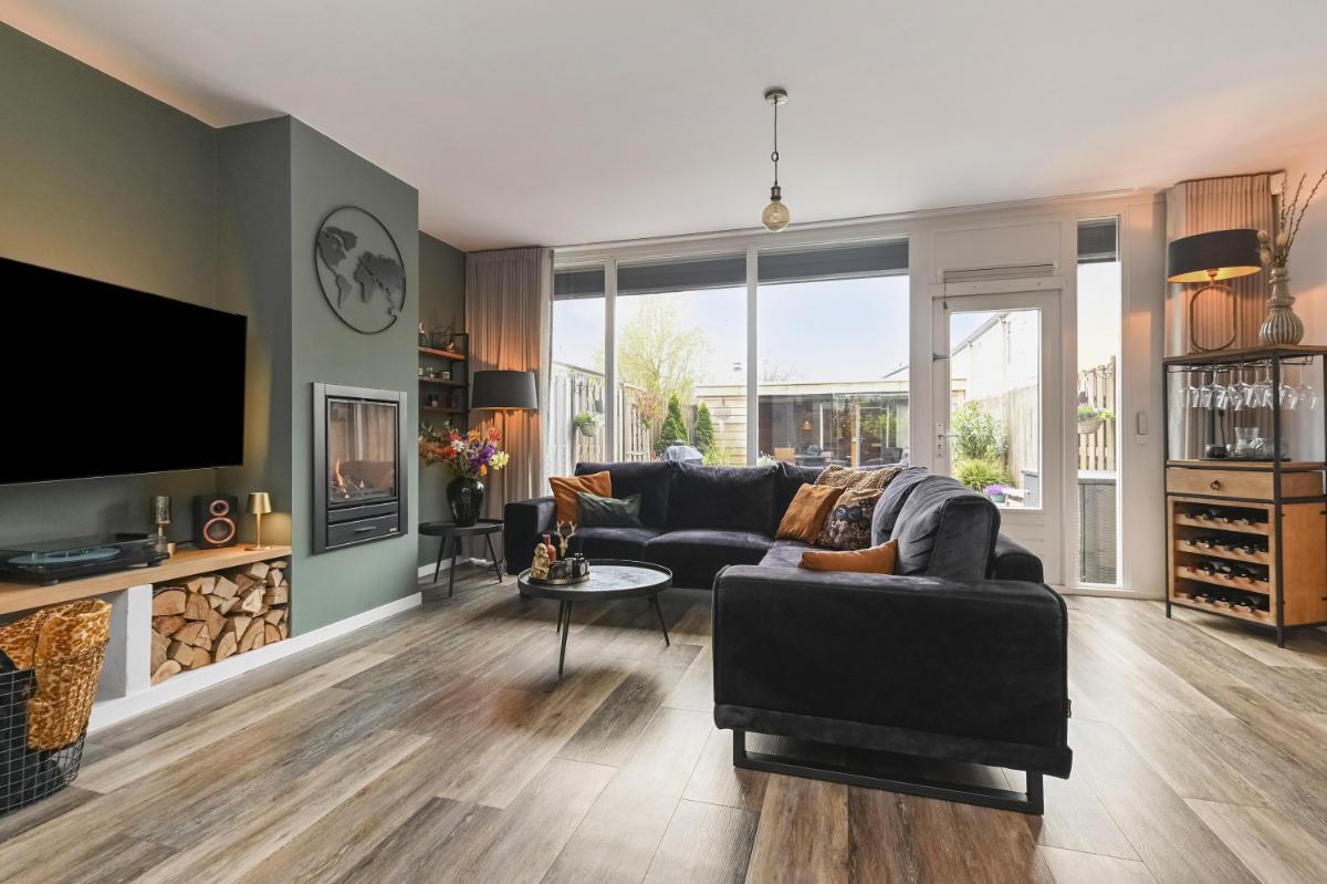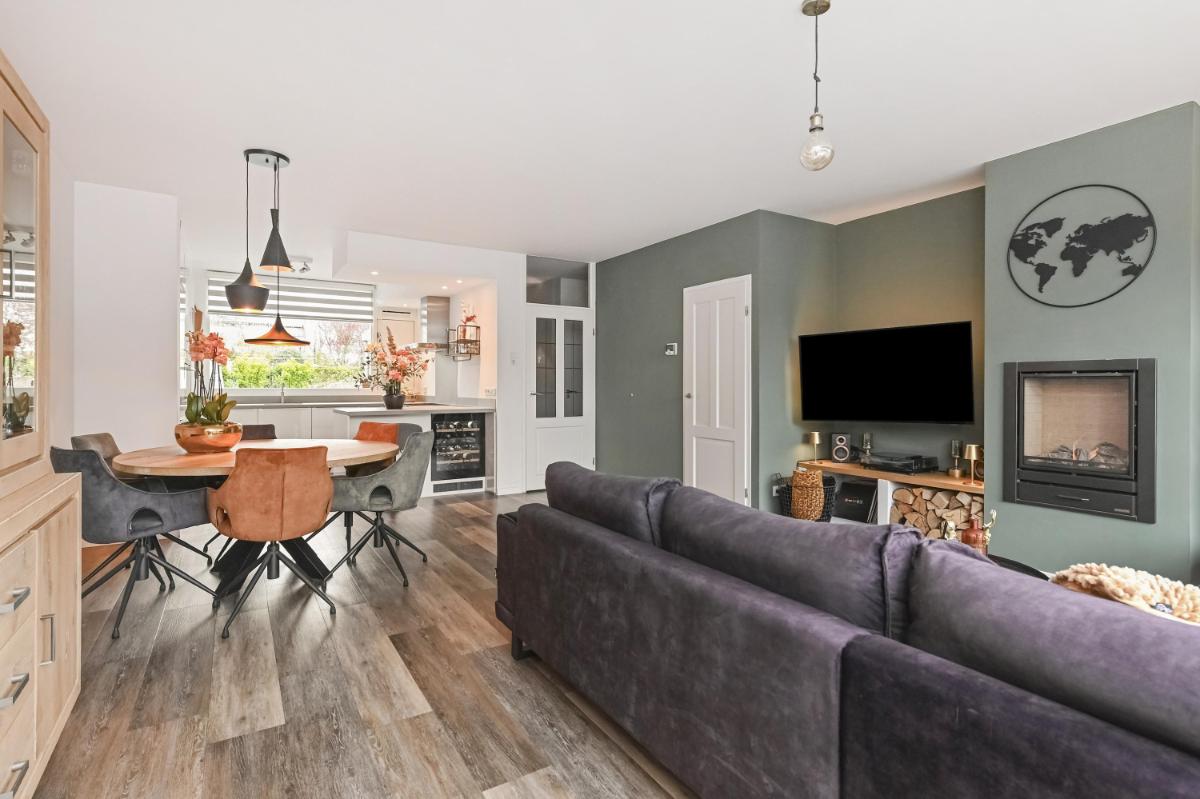 Indeling: Afgesloten voortuin met stenen fietsenberging. Entree woning, hal met meterkast. Toilet met fontein. Woonkamer voorzien van pvc-vloer met vloerverwarming, kastruimte en gashaard. Open keuken aan de voorzijde o.a. voorzien van keramiek werkbladen, wijn-klimaatkast, 6 pits gasfornuis, Quooker, vaatwasser, stoomoven en magnetron. Gezellige achtertuin met houten chalet voorzien van bar en open haard. Trap naar de eerste etage, overloop. Ouderslaapkamer aan de voorzijde voorzien van ruime inloopkast. Twee slaapkamers aan de achterzijde. De badkamer is voorzien van inloopdouche, wandcloset en wastafelmeubel. Trap naar de tweede verdieping, overloop met plaats voor wasmachine, droger, C.V.-ketel en bergruimte. Vierde slaapkamer met wastafel.