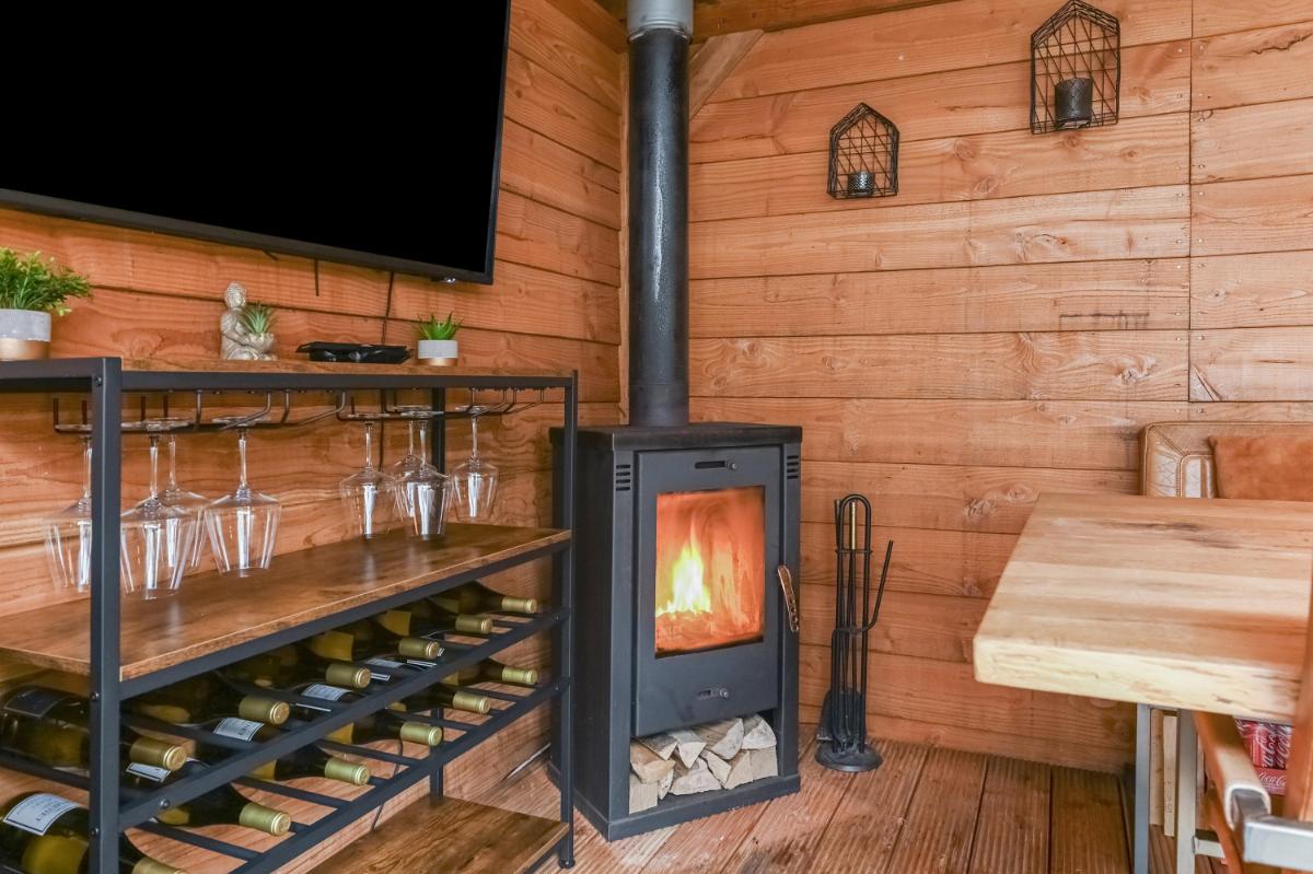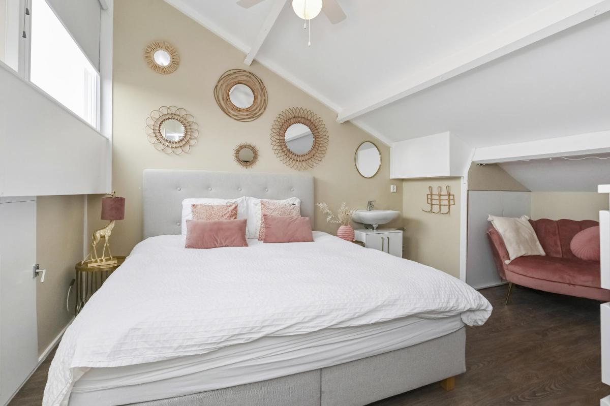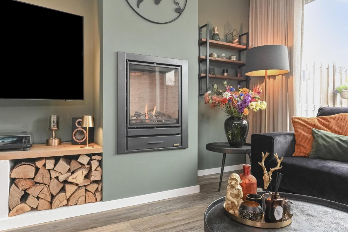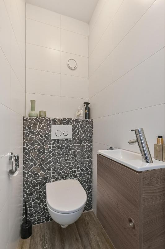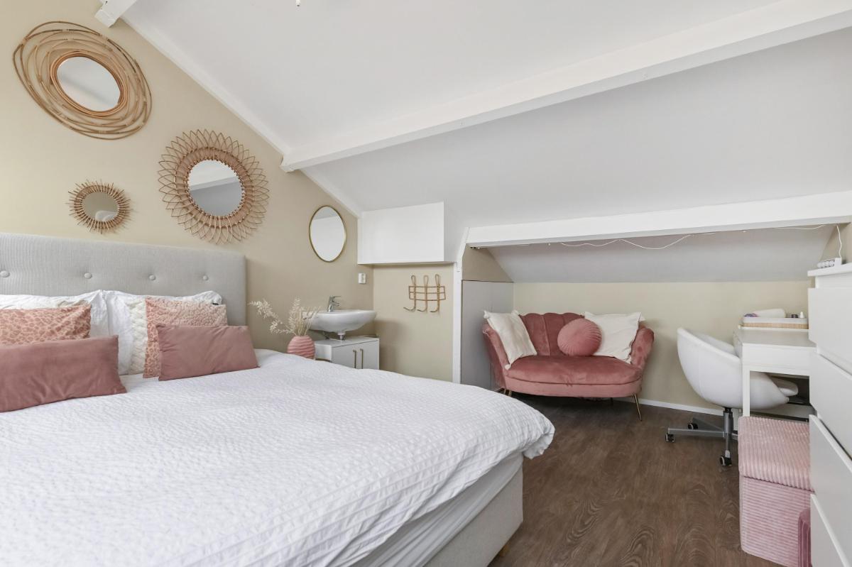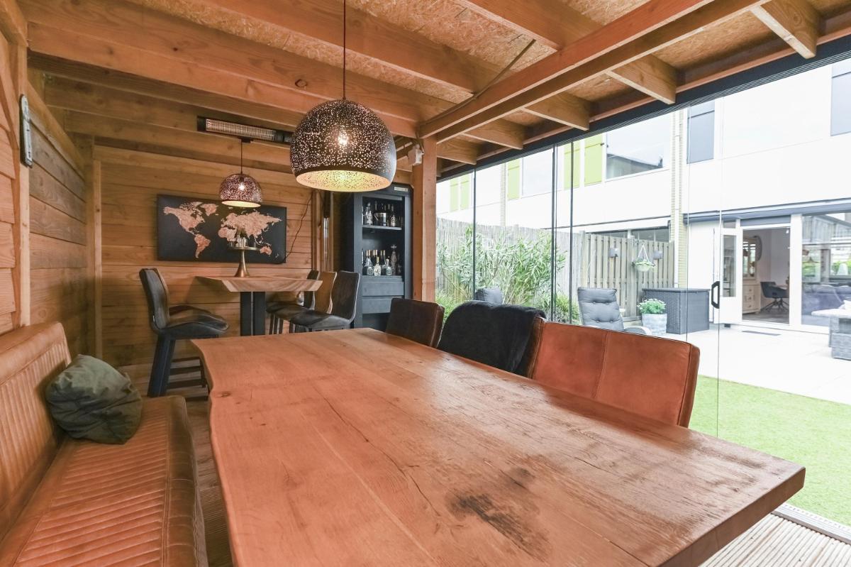 Indeling: Afgesloten voortuin met stenen fietsenberging. Entree woning, hal met meterkast. Toilet met fontein. Woonkamer voorzien van pvc-vloer met vloerverwarming, kastruimte en gashaard. Open keuken aan de voorzijde o.a. voorzien van keramiek werkbladen, wijn-klimaatkast, 6 pits gasfornuis, Quooker, vaatwasser, stoomoven en magnetron. Gezellige achtertuin met houten chalet voorzien van bar en open haard. Trap naar de eerste etage, overloop. Ouderslaapkamer aan de voorzijde voorzien van ruime inloopkast. Twee slaapkamers aan de achterzijde. De badkamer is voorzien van inloopdouche, wandcloset en wastafelmeubel. Trap naar de tweede verdieping, overloop met plaats voor wasmachine, droger, C.V.-ketel en bergruimte. Vierde slaapkamer met wastafel.