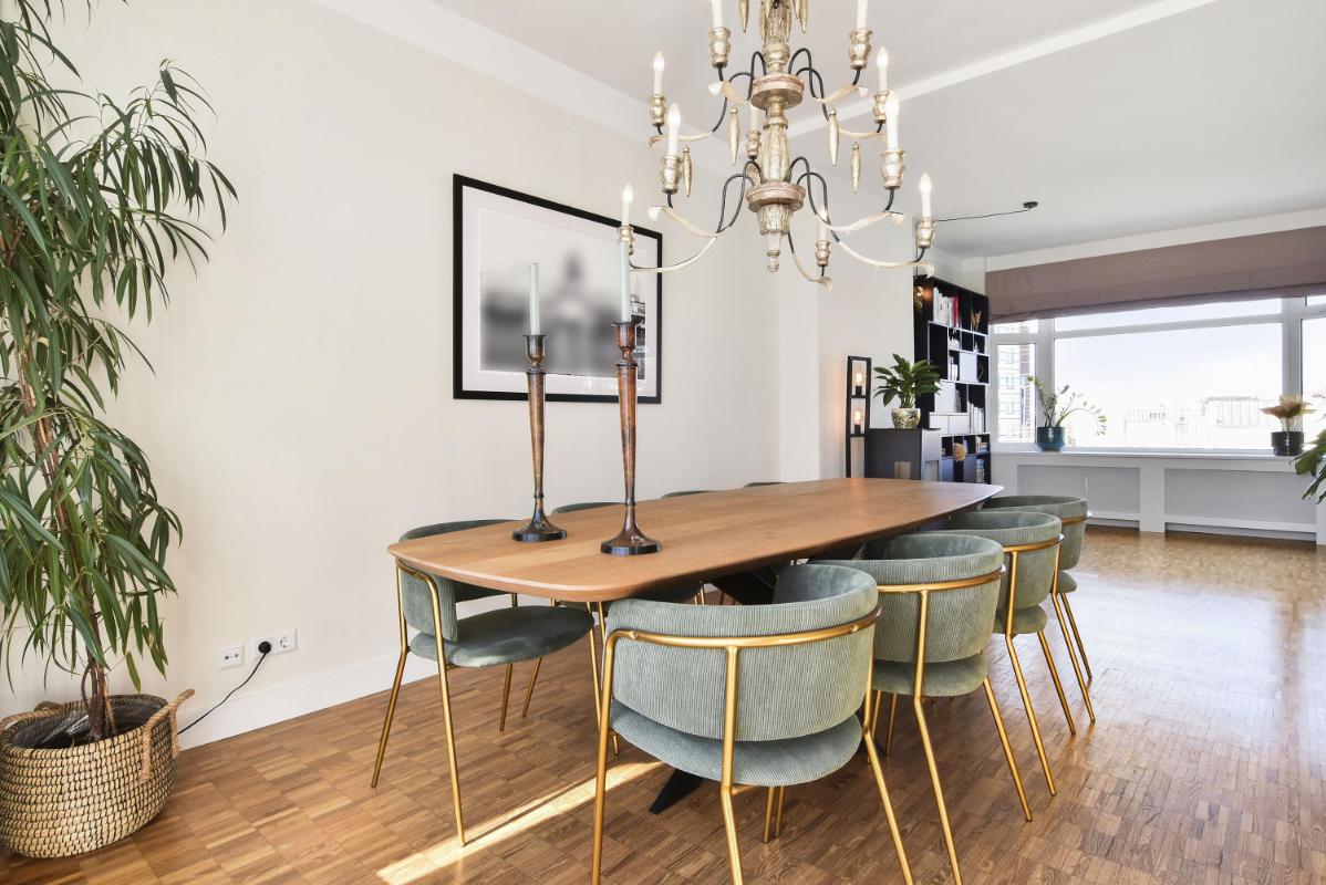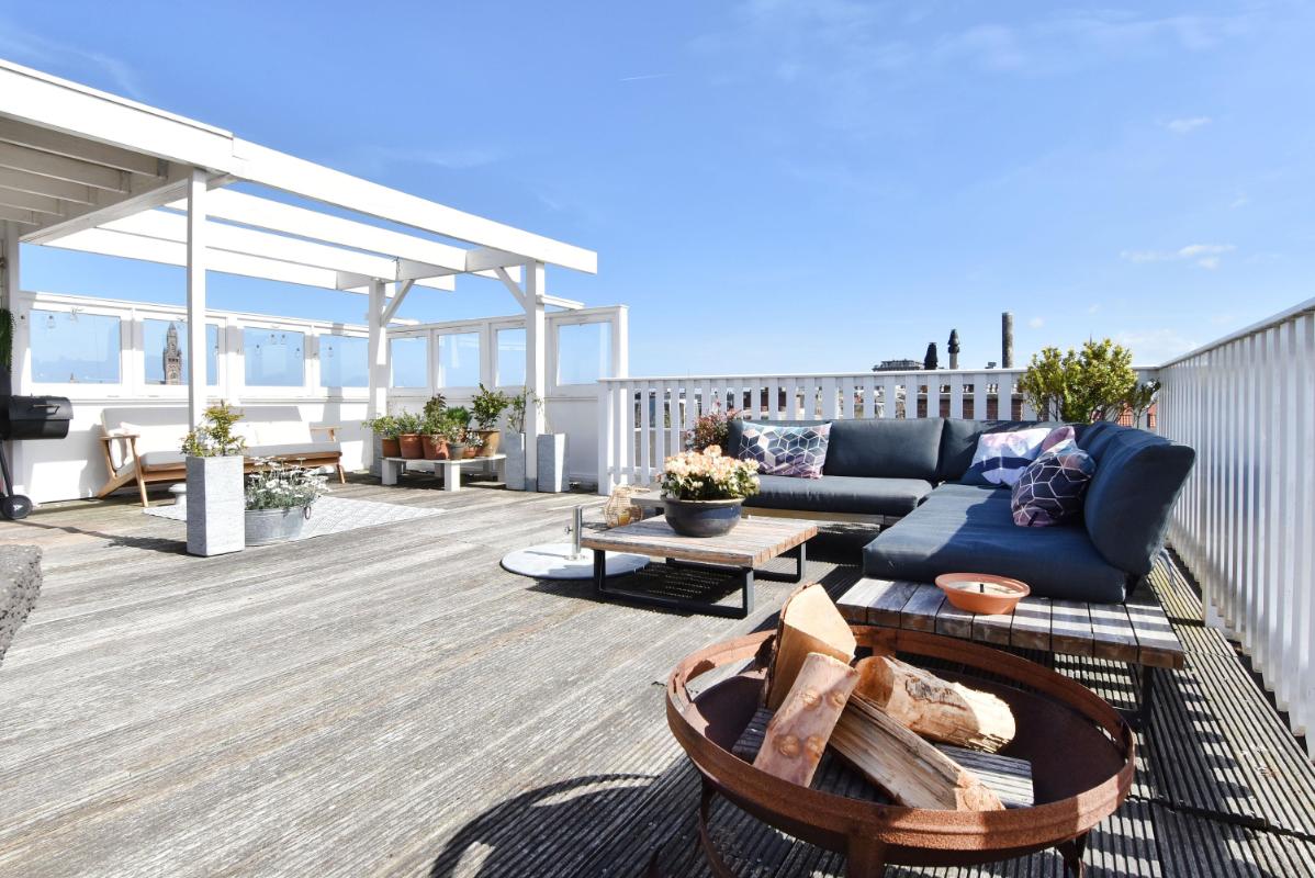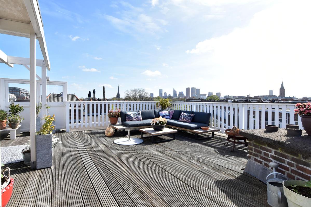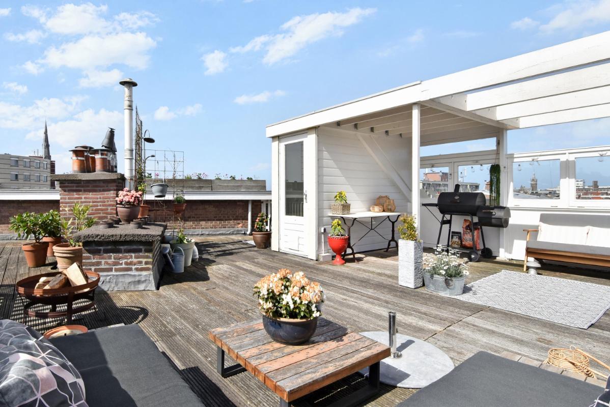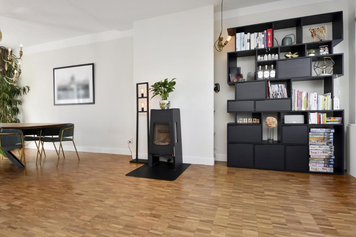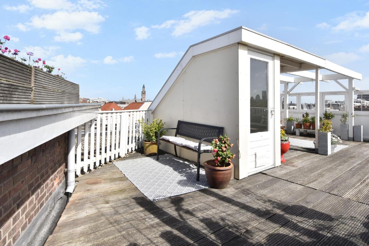 Layout: Enclosed porch with modern intercom system on the ground floor. Well-maintained and typical Hague staircase to the third floor. Entrance with vestibule and wardrobe. A beautiful, spacious hall providing access to all rooms in the home. Immediately to the left upon entering is the master bedroom with a walk-in closet and access to the balcony. On the right is the very spacious bathroom from 2010 with a bathtub, two sinks, a walk-in shower, a towel radiator, and space for a washing machine/dryer. Opposite the bathroom is the separate toilet. Bedroom with a small balcony and stairs to the roof terrace. Next to it is the smaller, third bedroom. Very spacious and bright living room with kitchen. The kitchen is equipped with all modern conveniences, including a beautiful stove and a Quooker in the kitchen island. Between the dining and seating areas stands a beautiful wood-burning stove that adds a lot of atmosphere; it was inspected earlier this year. The eat-in kitchen has a door and French doors leading to the balcony. From the second bedroom, stairs lead to the very spacious and always sunny roof terrace, which also features a small canopy for some shade. The terrace is approximately 75 m² and offers more than enough space for a lounge set, barbecue, and even an outdoor shower. From this vantage point, virtually the entire city is visible, yet without too much direct view into the space, allowing you to sit here in complete privacy.