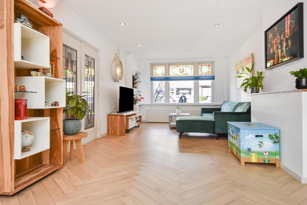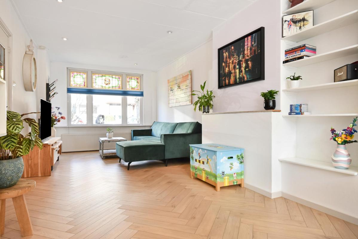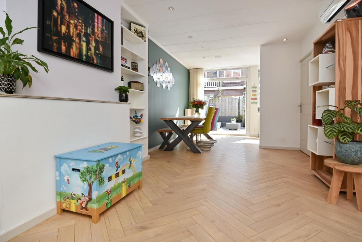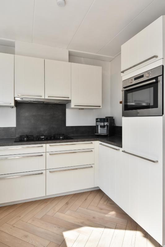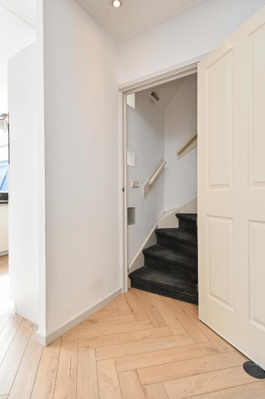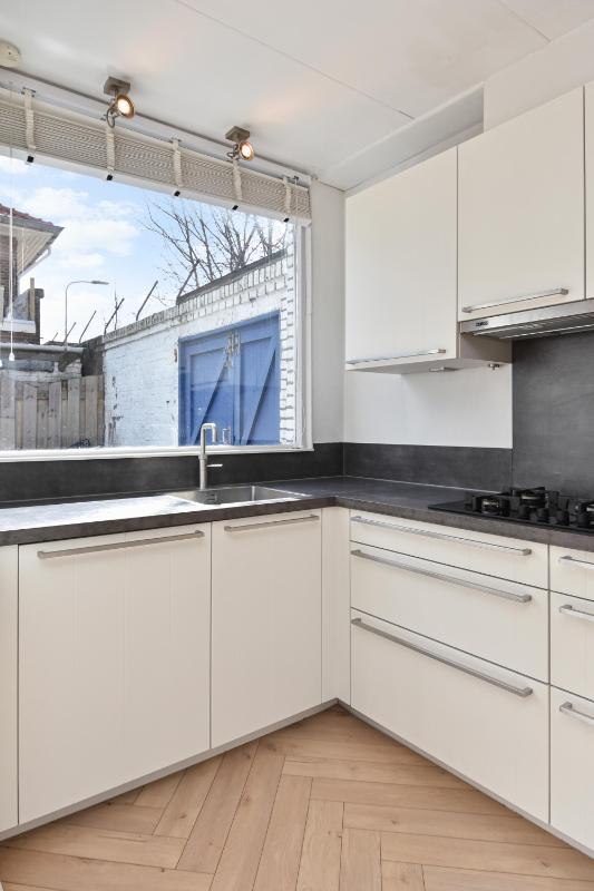 Indeling: Entree, gang met meterkast. Toilet met fontein. Openslaande deuren met glas in lood naar de woonkamer voorzien van visgraat pvc-vloer. De open keuken aan de achterzijde is o.a. voorzien van Quooker, vaatwasser, gaskookplaat, afzuigkap, oven en koel-/vriescombinatie. Openslaande deuren naar de achtertuin met brede zij-entree. Trap naar de eerste verdieping, overloop met vaste kast met aansluiting voor wasmachine en droger. Slaapkamer aan de voorzijde met kastenwand. Slaapkamer aan de achterzijde. Derde slaapkamer met toegang tot het ruime achterbalkon. De badkamer is voorzien van ligbad met douchegedeelte, wandcloset, designradiator en wastafelmeubel. Trap naar de kapverdieping met slaapkamer, vast bed, dakramen en bergruimte.