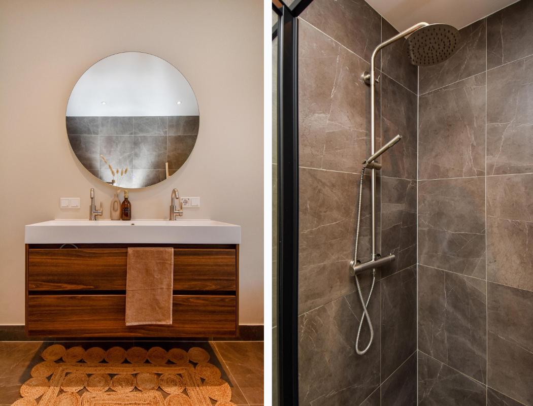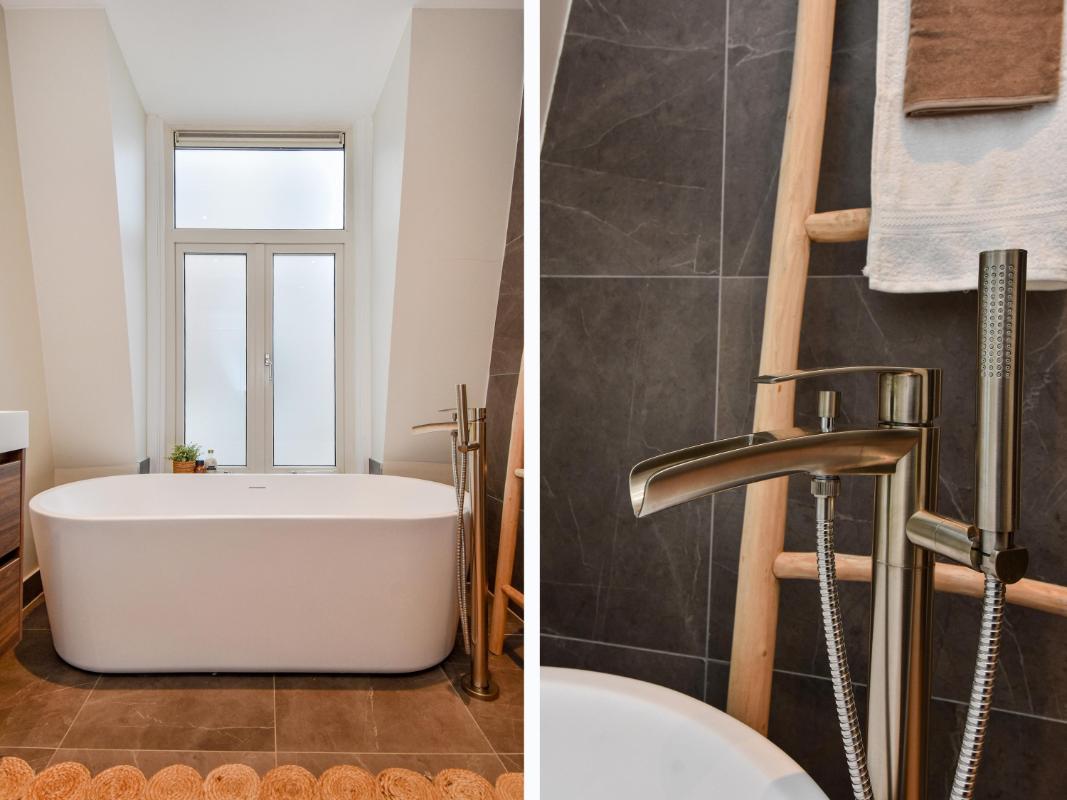 Layout: Ground floor entrance leads to the house via a long and stately hall. Stairs lead to the first floor with a landing, toilet, and storage room. A very spacious and bright living/dining room with an open-plan kitchen and fully equipped island. The stairs on the landing lead to the second floor, where three bedrooms are located. Two larger bedrooms and one smaller bedroom are adjacent to a beautiful and sunny balcony. The bathroom features a walk-in shower, freestanding bathtub, and a beautiful vanity.
