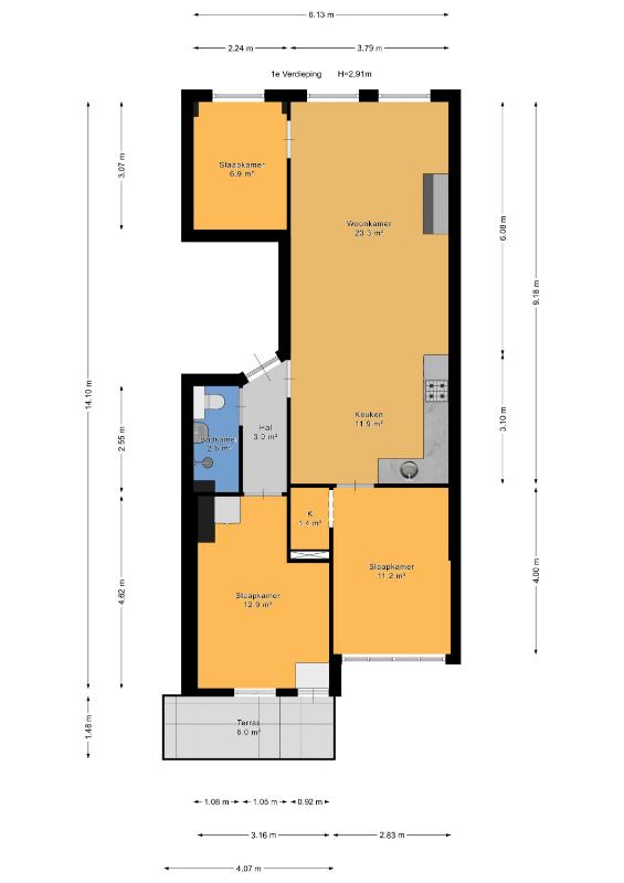 Indeling: Via de gezamenlijke entree op de begane grond met de trap naar de eerste verdieping waar op de overloop de voordeur naar het appartement is. Een hal die naar de achterste slaapkamer gaat met ook de toegang tot de badkamer. De achterste kamer heeft ook de toegang tot het balkon. Aan de andere zijde van de hal bevindt zich de deur naar de woonkamer met open keuken. Aan de voorzijde van de woning een kleinere/tweede slaapkamer en aan de achterzijde, achter de keuken de grote/derde slaapkamer met berging.