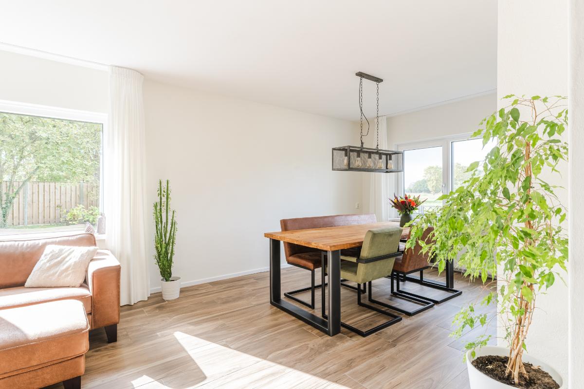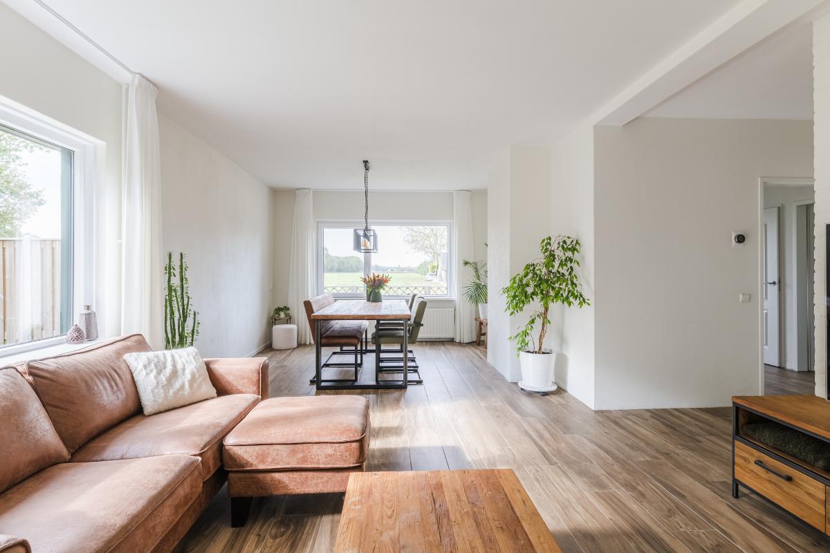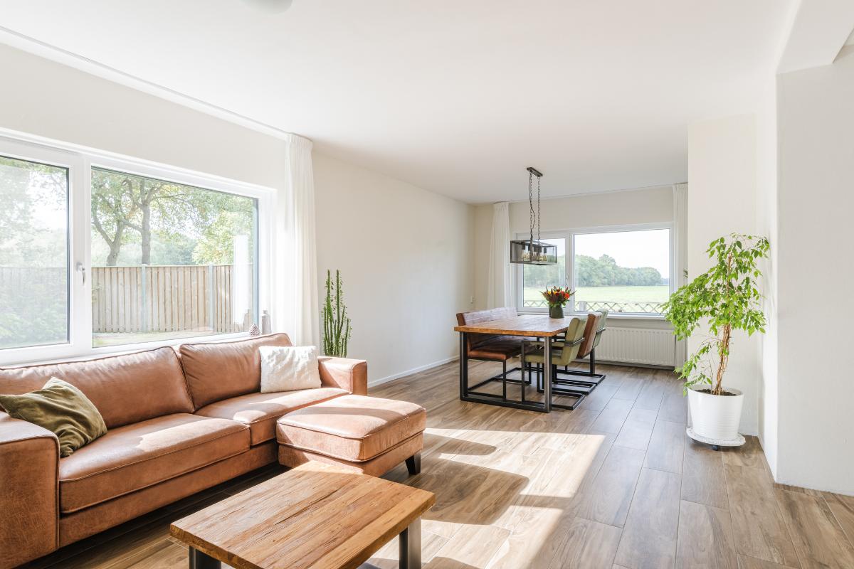 Woonkamer met panoramisch uitzicht; De woonkamer is een van de absolute blikvangers van deze woning. Dankzij de grote raampartijen aan de voorzijde geniet je hier van een vrij uitzicht over de natuur en de prachtige zonsondergang. Het groen strekt zich uit tot aan de horizon, waardoor je het gevoel hebt midden in het landschap te wonen. De woonkamer is ruim opgezet en biedt voldoende plek voor een comfortabele zithoek en een eethoek. De natuurlijke lichtinval zorgt voor een aangename sfeer, en in de wintermaanden kun je hier genieten van de knusse warmte van een eventuele haard of houtkachel.