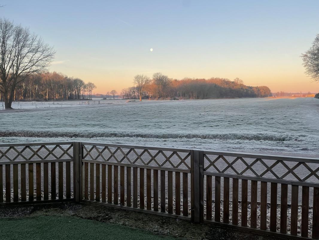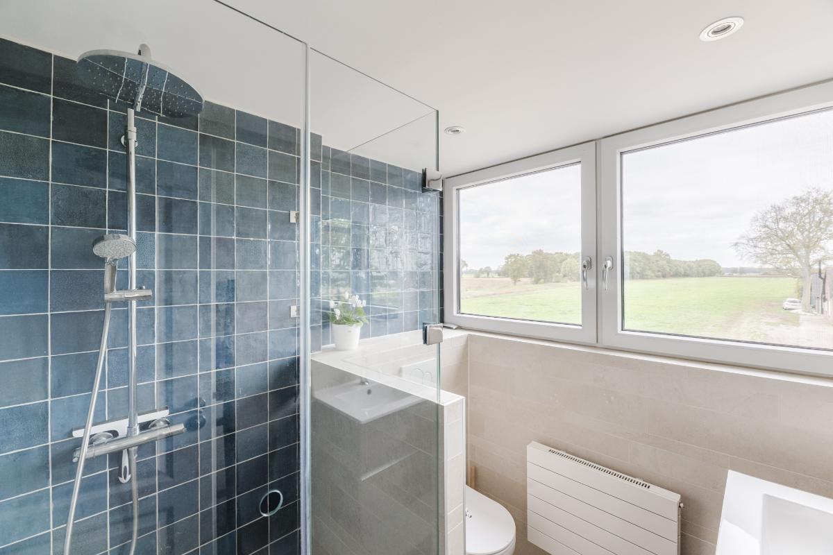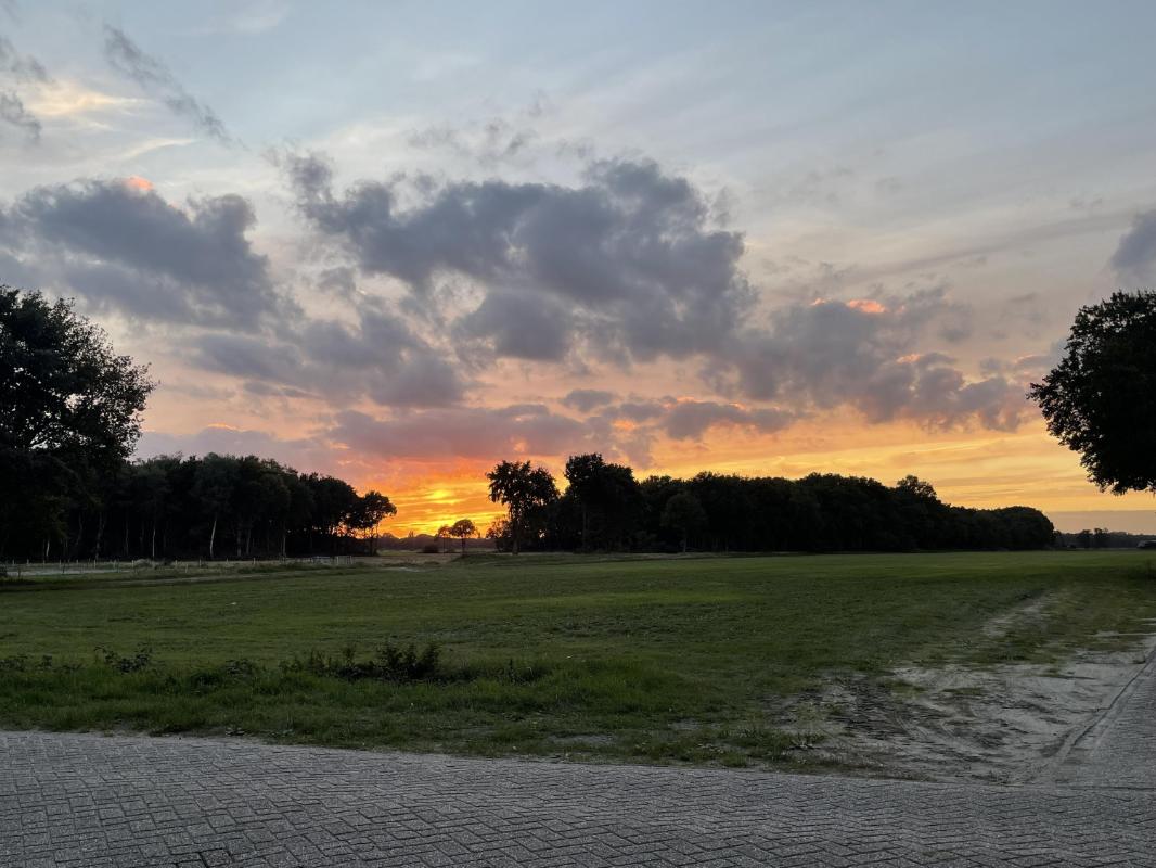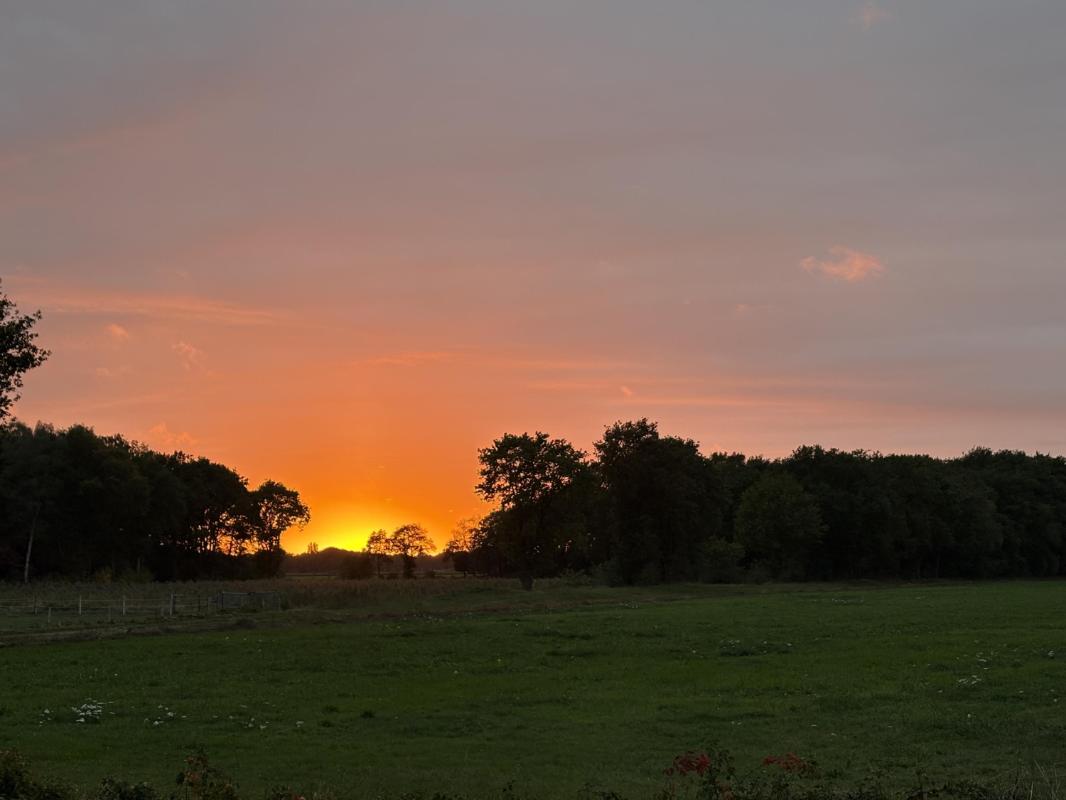 Woonkamer met panoramisch uitzicht; De woonkamer is een van de absolute blikvangers van deze woning. Dankzij de grote raampartijen aan de voorzijde geniet je hier van een vrij uitzicht over de natuur en de prachtige zonsondergang. Het groen strekt zich uit tot aan de horizon, waardoor je het gevoel hebt midden in het landschap te wonen. De woonkamer is ruim opgezet en biedt voldoende plek voor een comfortabele zithoek en een eethoek. De natuurlijke lichtinval zorgt voor een aangename sfeer, en in de wintermaanden kun je hier genieten van de knusse warmte van een eventuele haard of houtkachel.