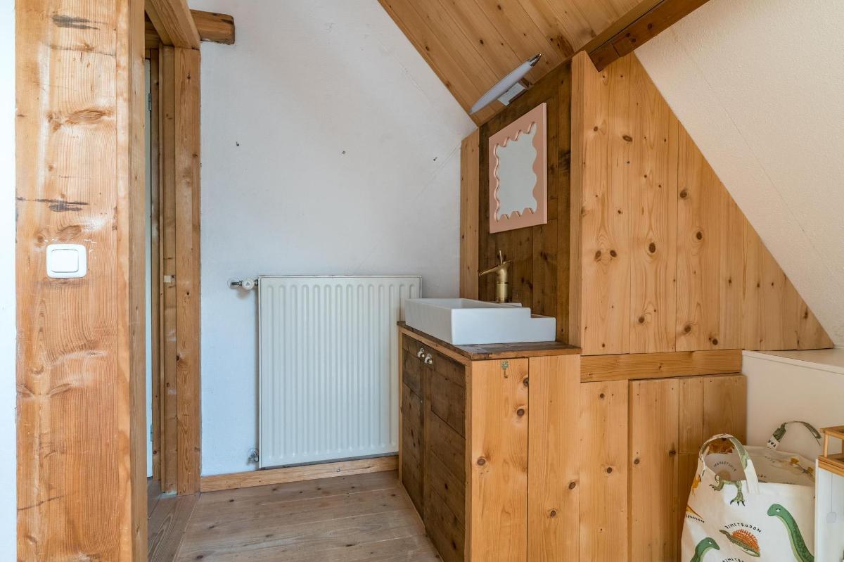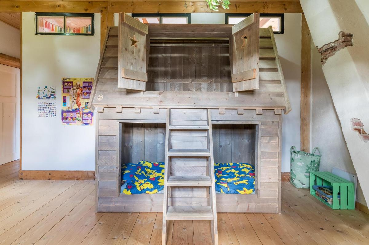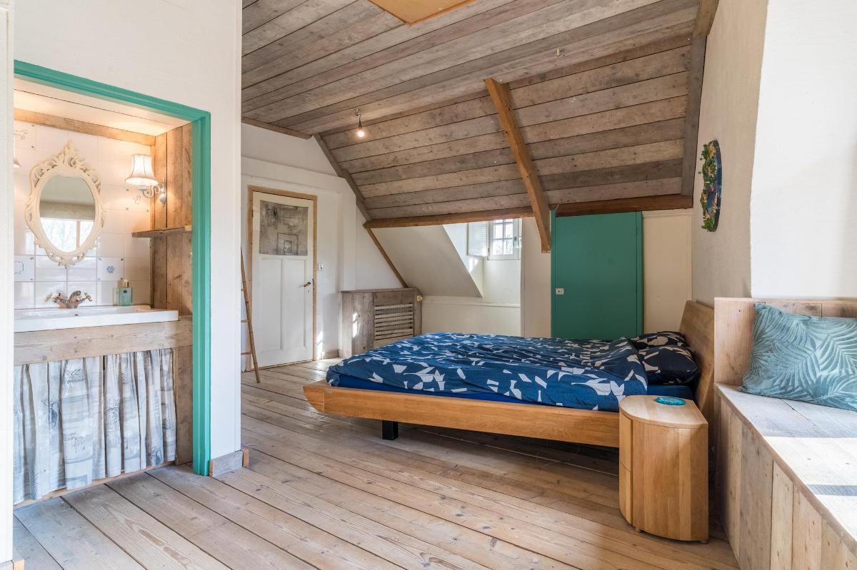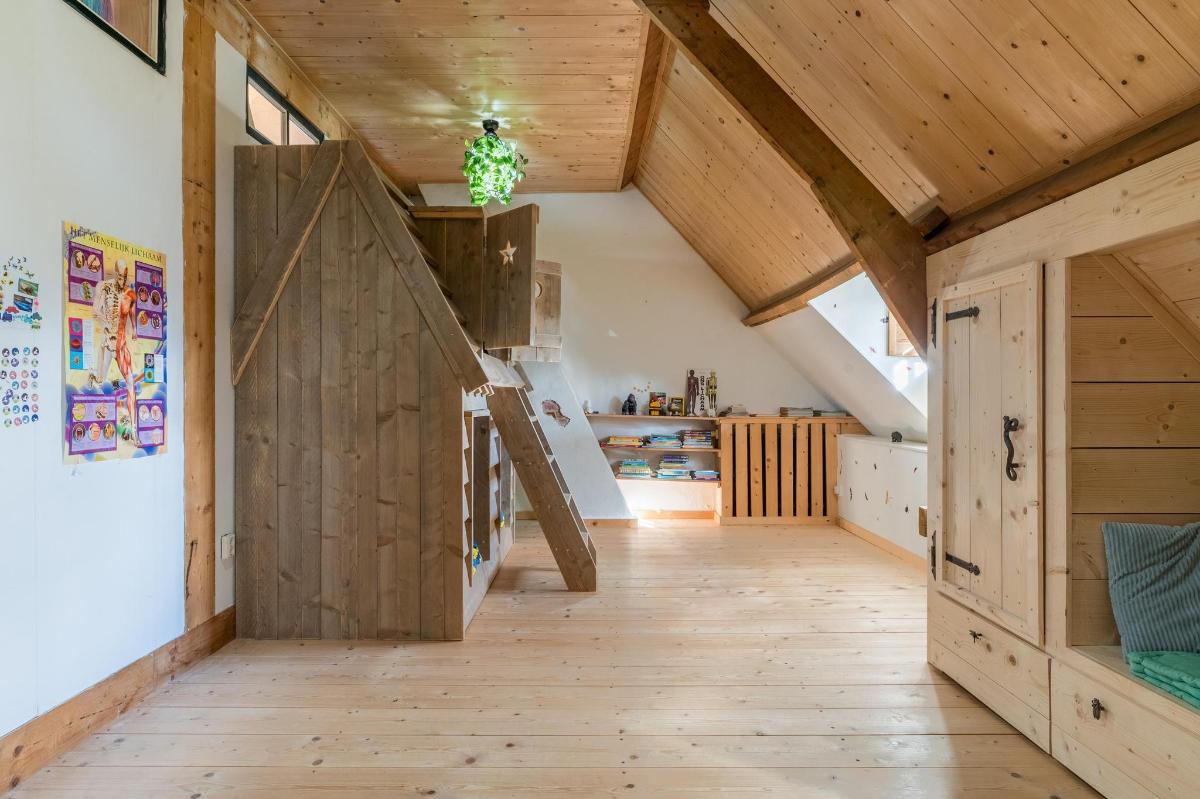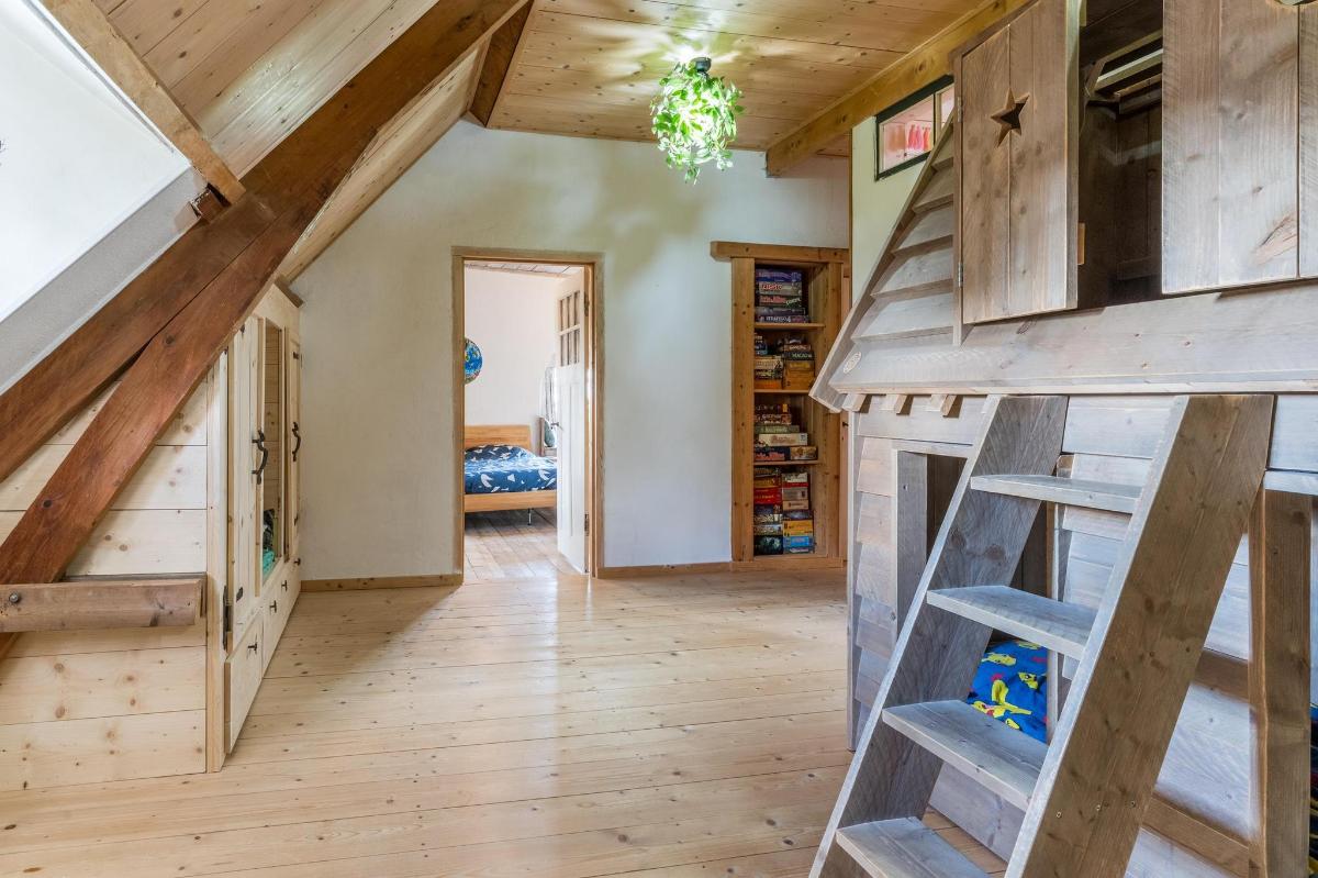 Eerste verdieping hoofdwoning De eerste verdieping herbergt een grote open multifunctionele ruimte, drie unieke slaapkamers en een vliering met extra opbergruimte. Elke slaapkamer heeft een eigen sfeer en indeling: van een vide en eigen wastafel tot ingebouwde kasten, een knusse leeshoek en een recent gerealiseerd ‘hobbit huisje’ met kinderbedstee (2024).