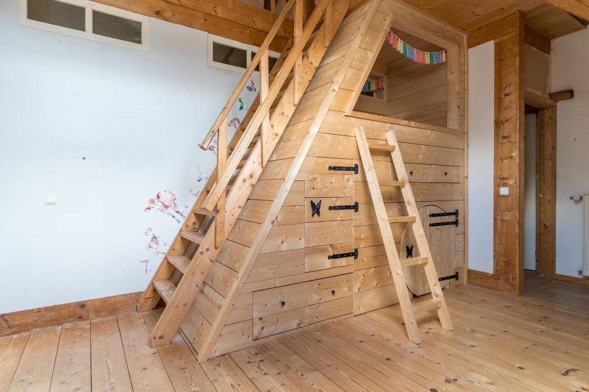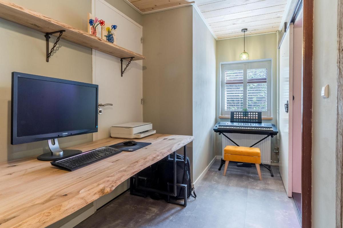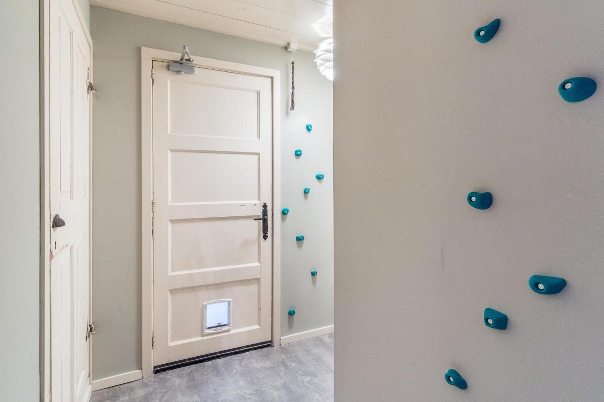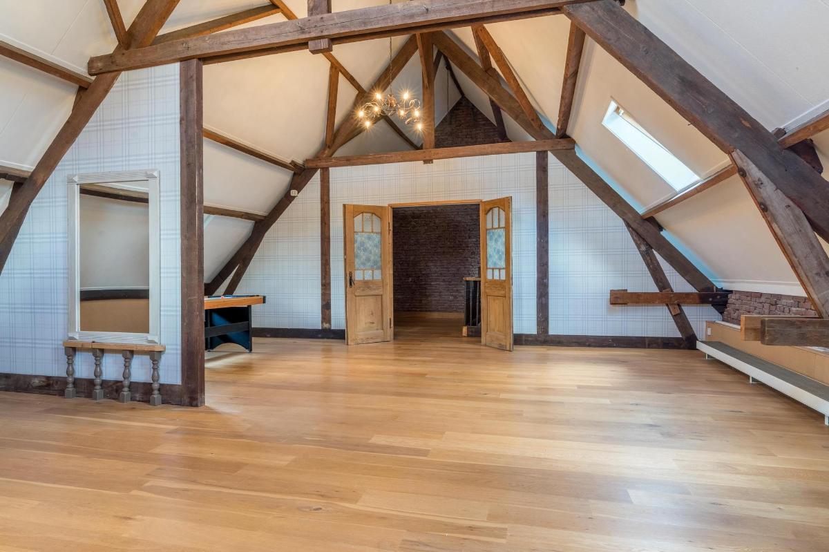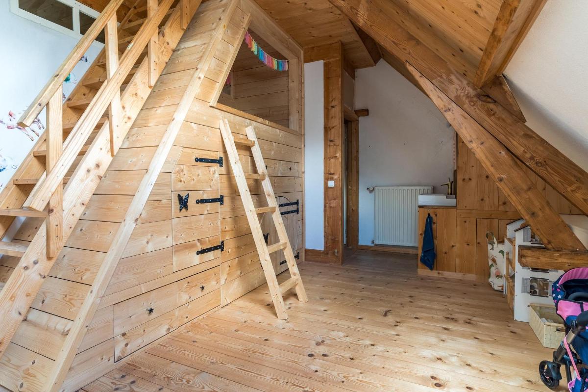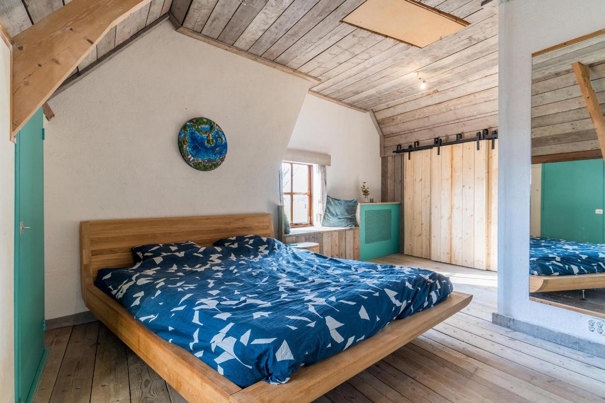 Eerste verdieping hoofdwoning De eerste verdieping herbergt een grote open multifunctionele ruimte, drie unieke slaapkamers en een vliering met extra opbergruimte. Elke slaapkamer heeft een eigen sfeer en indeling: van een vide en eigen wastafel tot ingebouwde kasten, een knusse leeshoek en een recent gerealiseerd ‘hobbit huisje’ met kinderbedstee (2024).