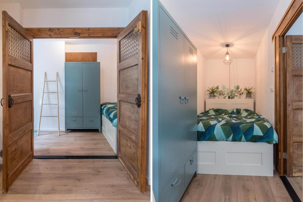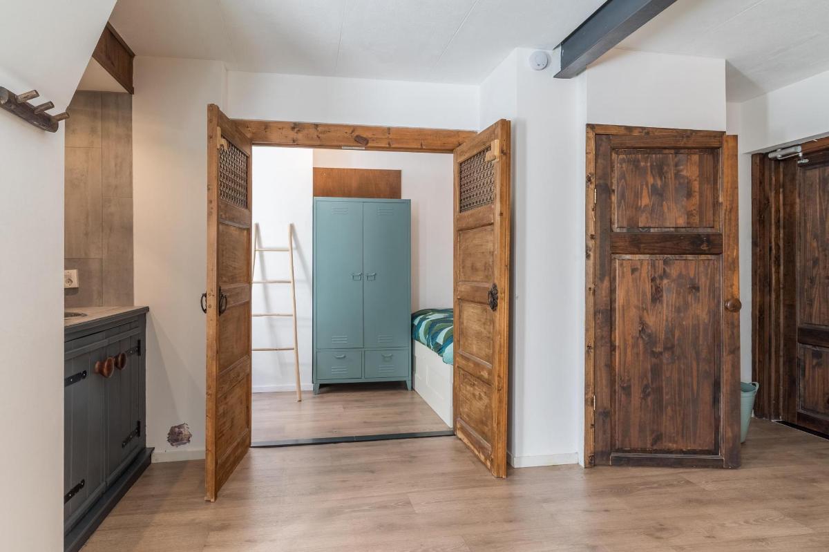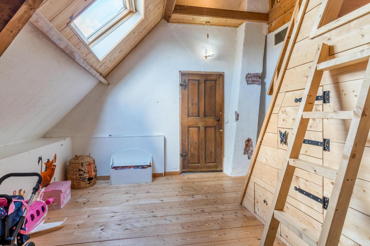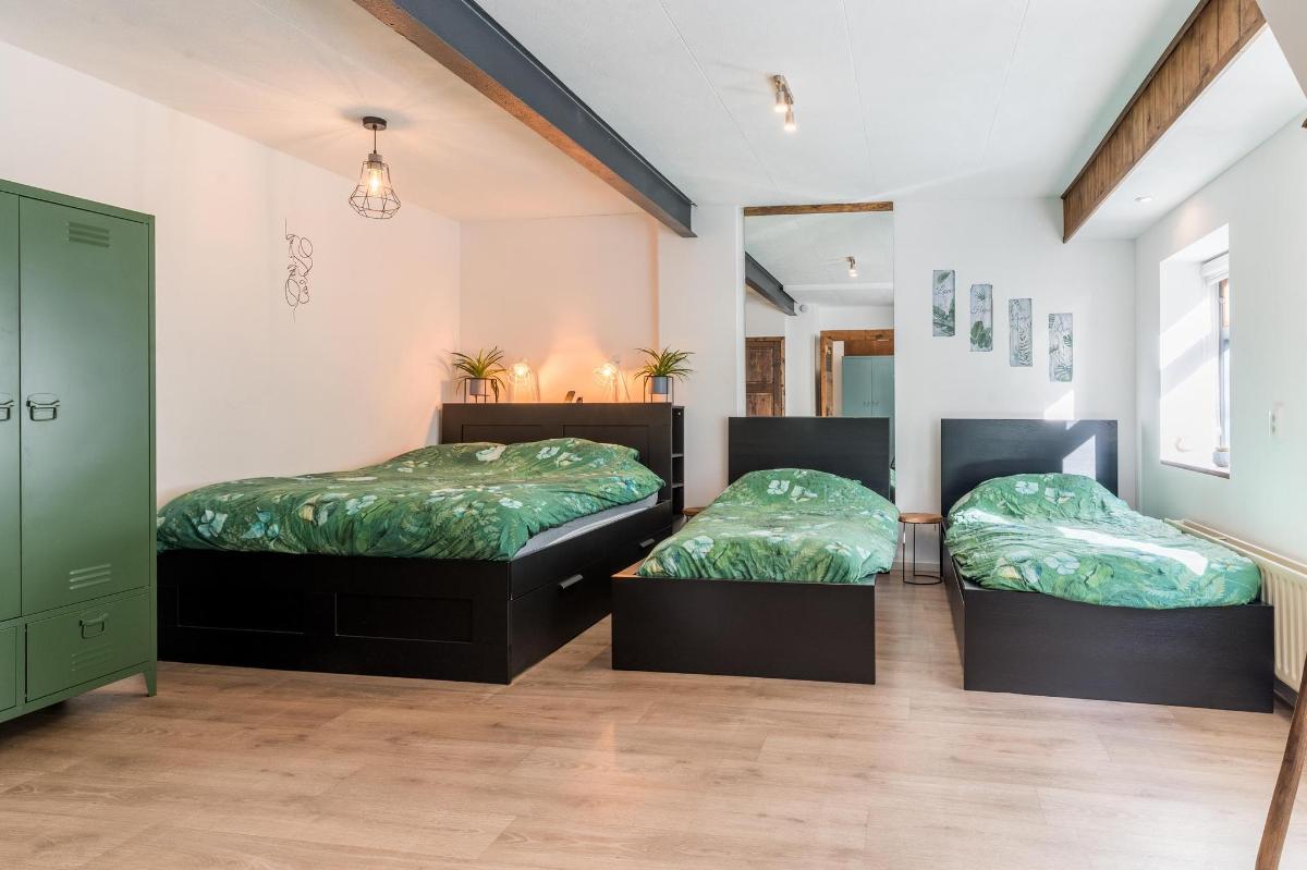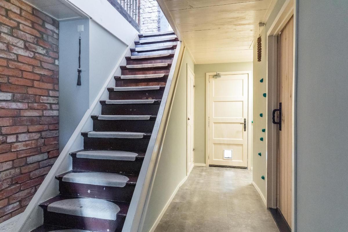 Eerste verdieping hoofdwoning De eerste verdieping herbergt een grote open multifunctionele ruimte, drie unieke slaapkamers en een vliering met extra opbergruimte. Elke slaapkamer heeft een eigen sfeer en indeling: van een vide en eigen wastafel tot ingebouwde kasten, een knusse leeshoek en een recent gerealiseerd ‘hobbit huisje’ met kinderbedstee (2024).