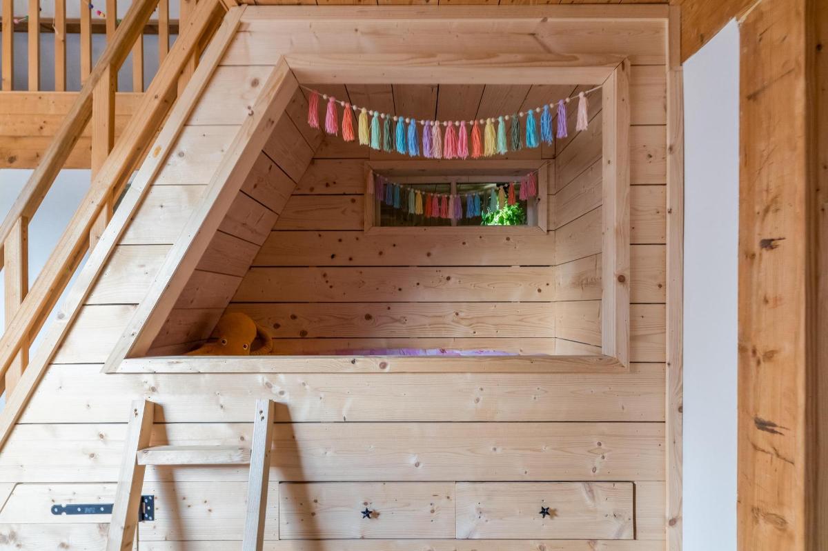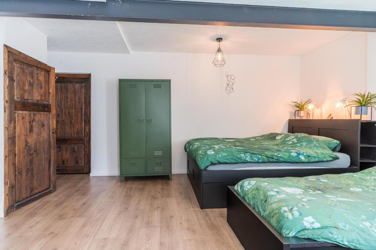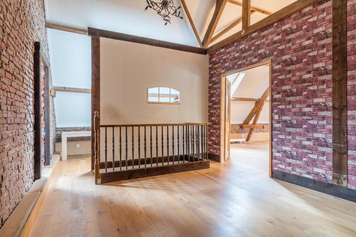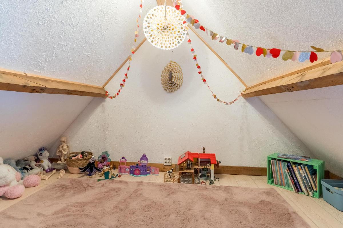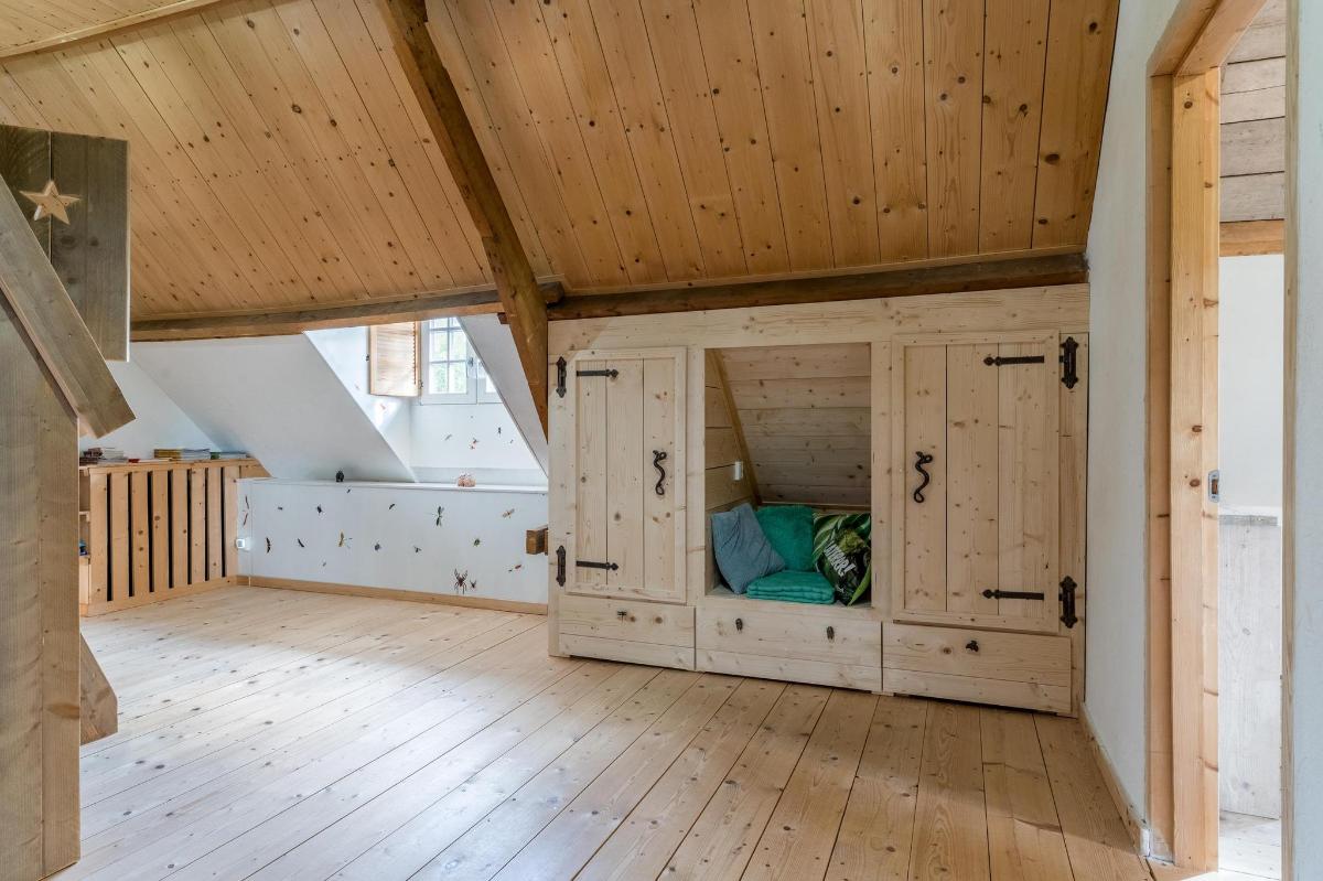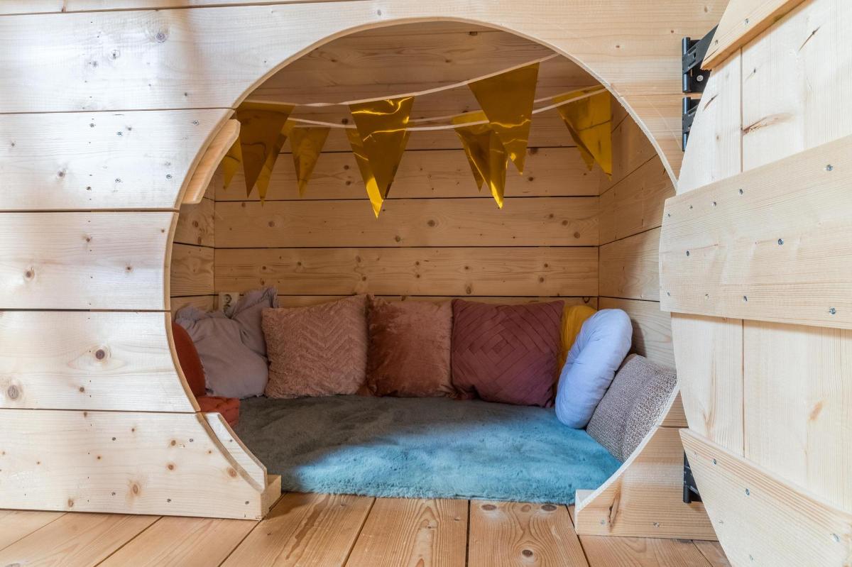 Eerste verdieping hoofdwoning De eerste verdieping herbergt een grote open multifunctionele ruimte, drie unieke slaapkamers en een vliering met extra opbergruimte. Elke slaapkamer heeft een eigen sfeer en indeling: van een vide en eigen wastafel tot ingebouwde kasten, een knusse leeshoek en een recent gerealiseerd ‘hobbit huisje’ met kinderbedstee (2024).