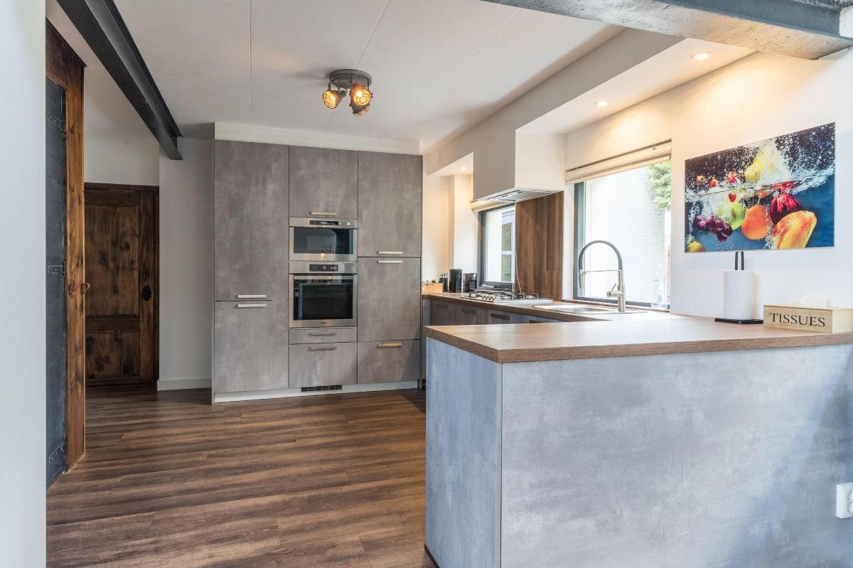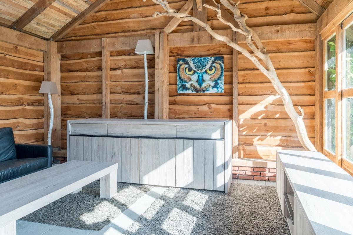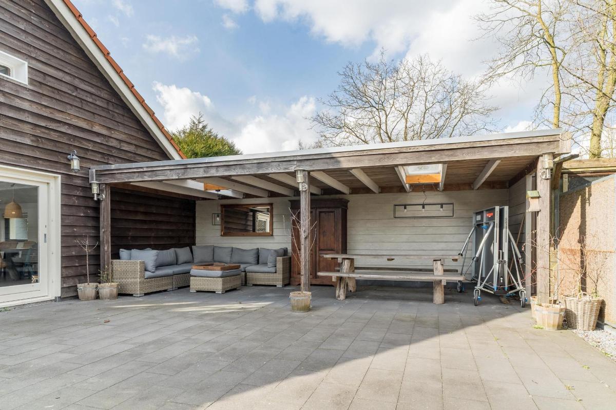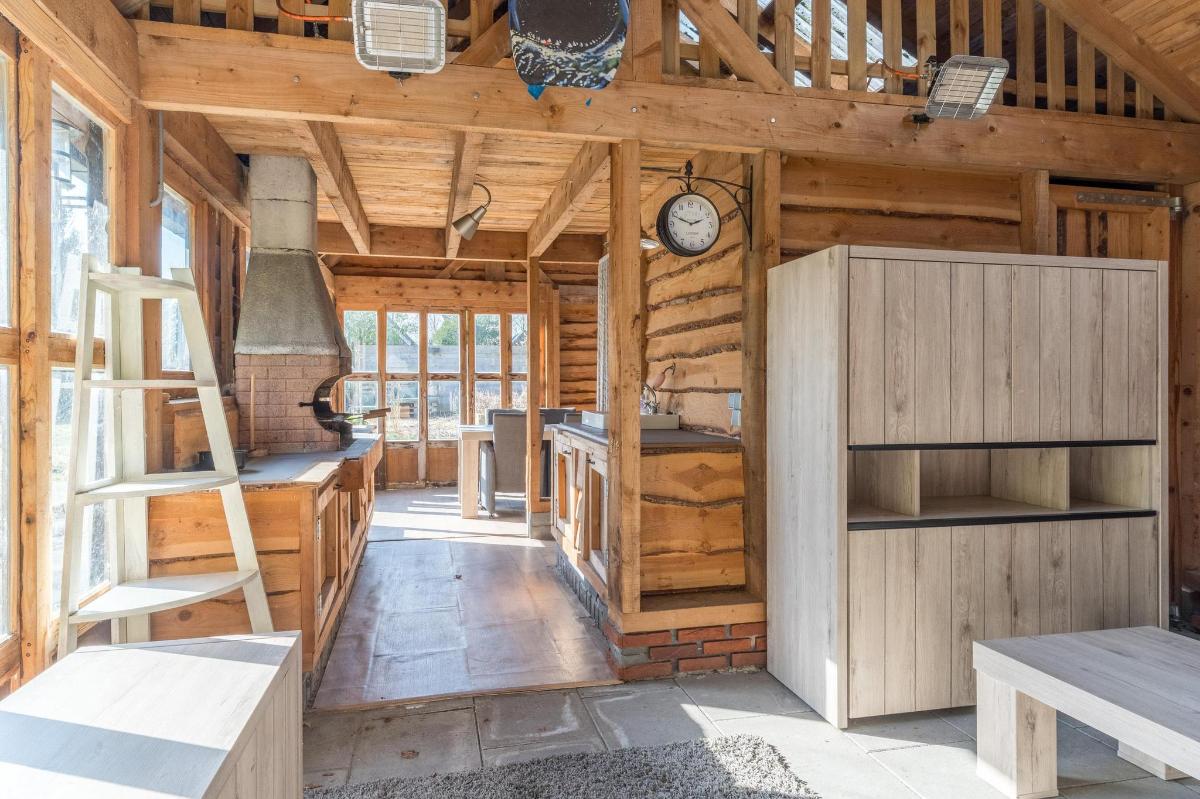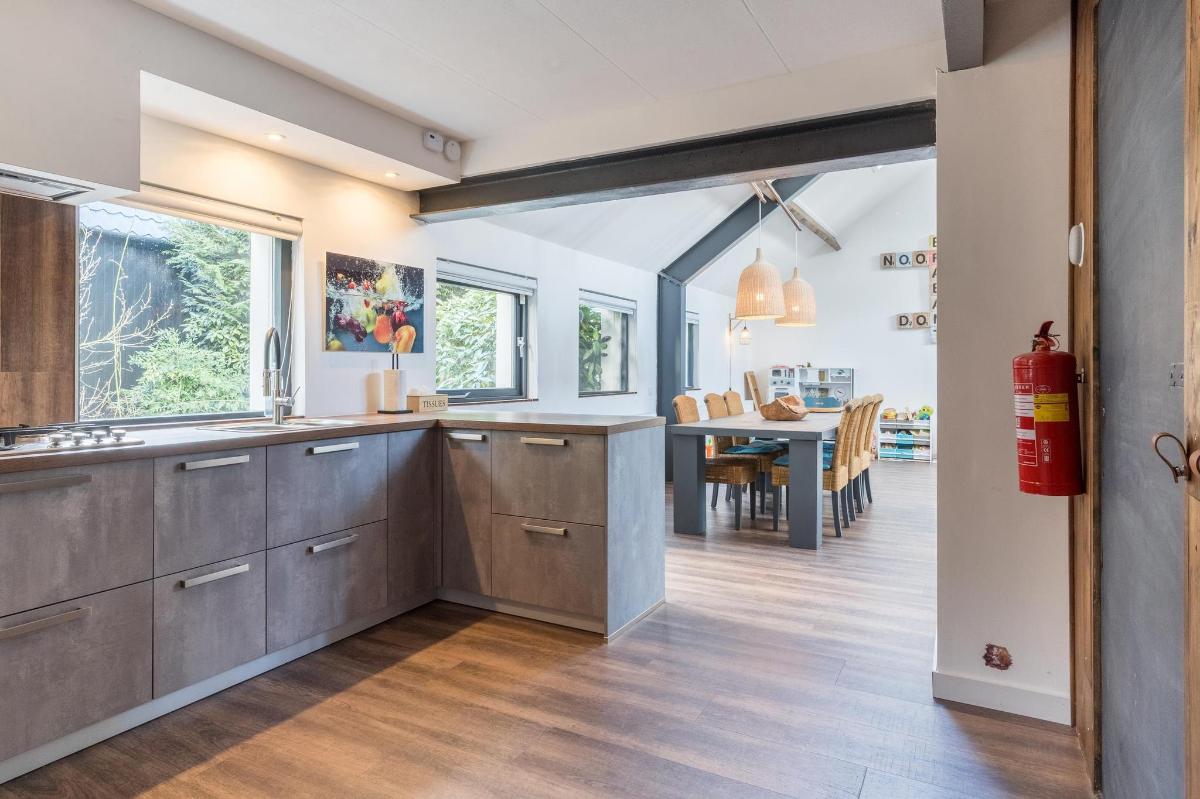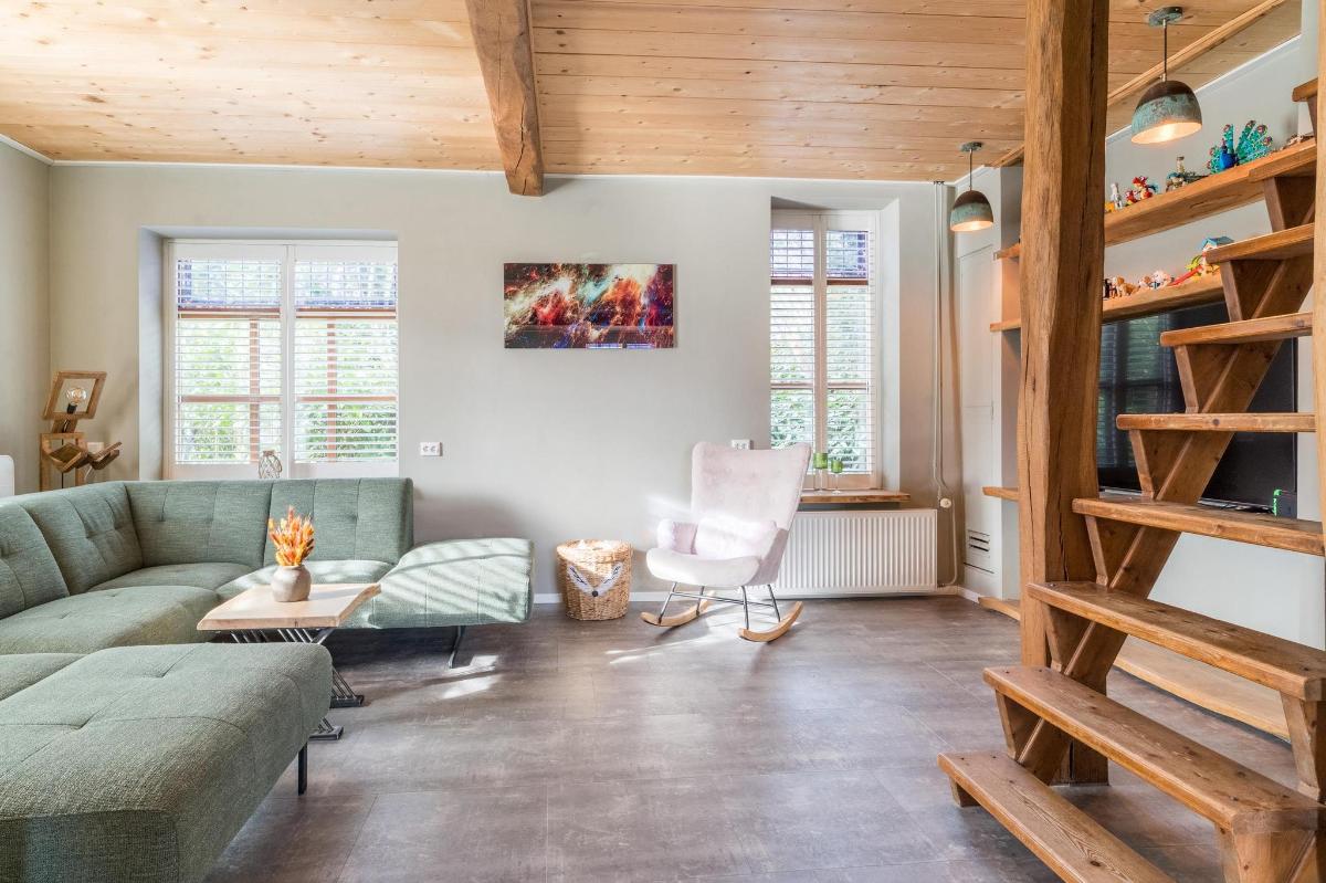 Indeling hoofdwoning – begane grond Via de entree kom je in een sfeervolle woonkamer met houtkachel, verbonden met een eetkamer en speelruimte. De landelijke keuken is voorzien van inbouwapparatuur en heeft, net als de overige leefruimtes, een betonlook PVC-vloer en karakteristieke houten togen. Verder vind je hier een multifunctionele ruimte (kantoor/gameroom), een ruime bijkeuken met toegang tot garage en berging, en een luxe badkamer met whirlpool, sauna, inloopdouche, toilet, natuurstenen vloer met vloerverwarming en mechanische ventilatie.