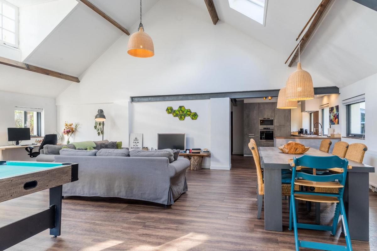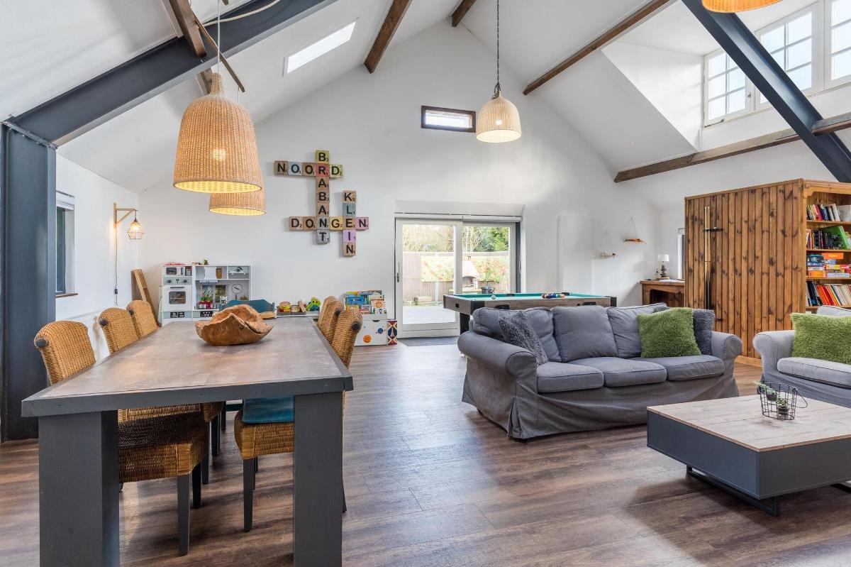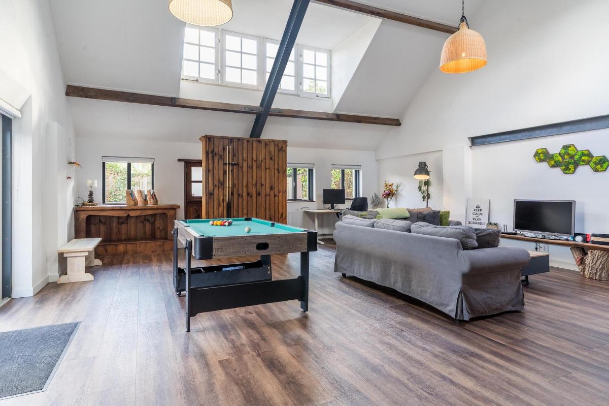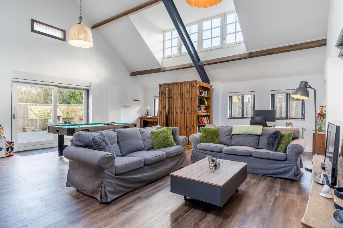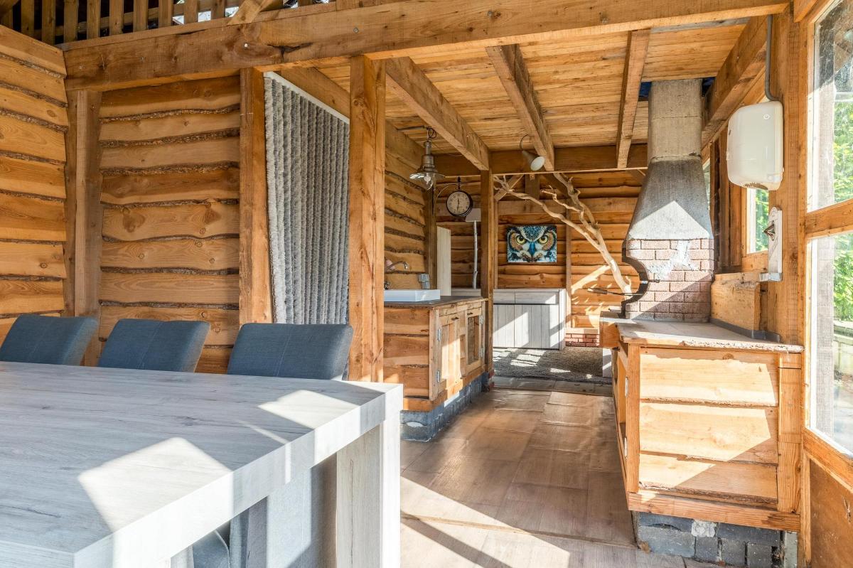 Indeling hoofdwoning – begane grond Via de entree kom je in een sfeervolle woonkamer met houtkachel, verbonden met een eetkamer en speelruimte. De landelijke keuken is voorzien van inbouwapparatuur en heeft, net als de overige leefruimtes, een betonlook PVC-vloer en karakteristieke houten togen. Verder vind je hier een multifunctionele ruimte (kantoor/gameroom), een ruime bijkeuken met toegang tot garage en berging, en een luxe badkamer met whirlpool, sauna, inloopdouche, toilet, natuurstenen vloer met vloerverwarming en mechanische ventilatie.