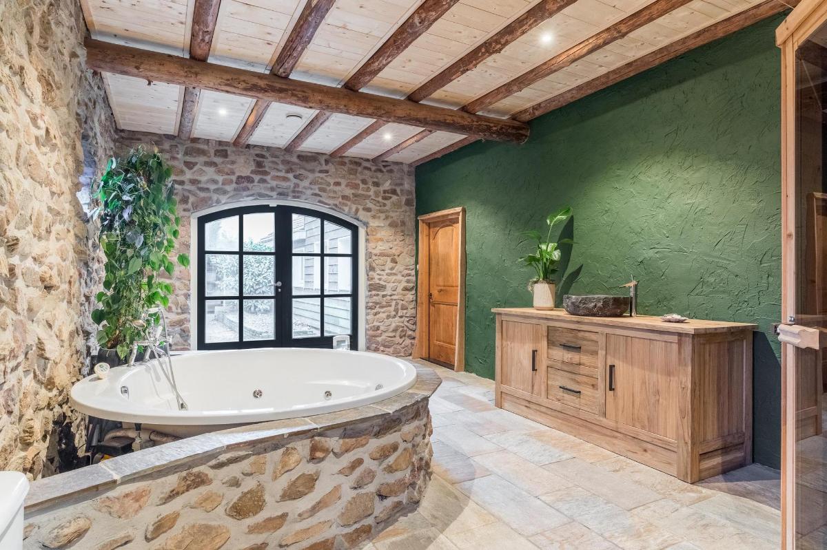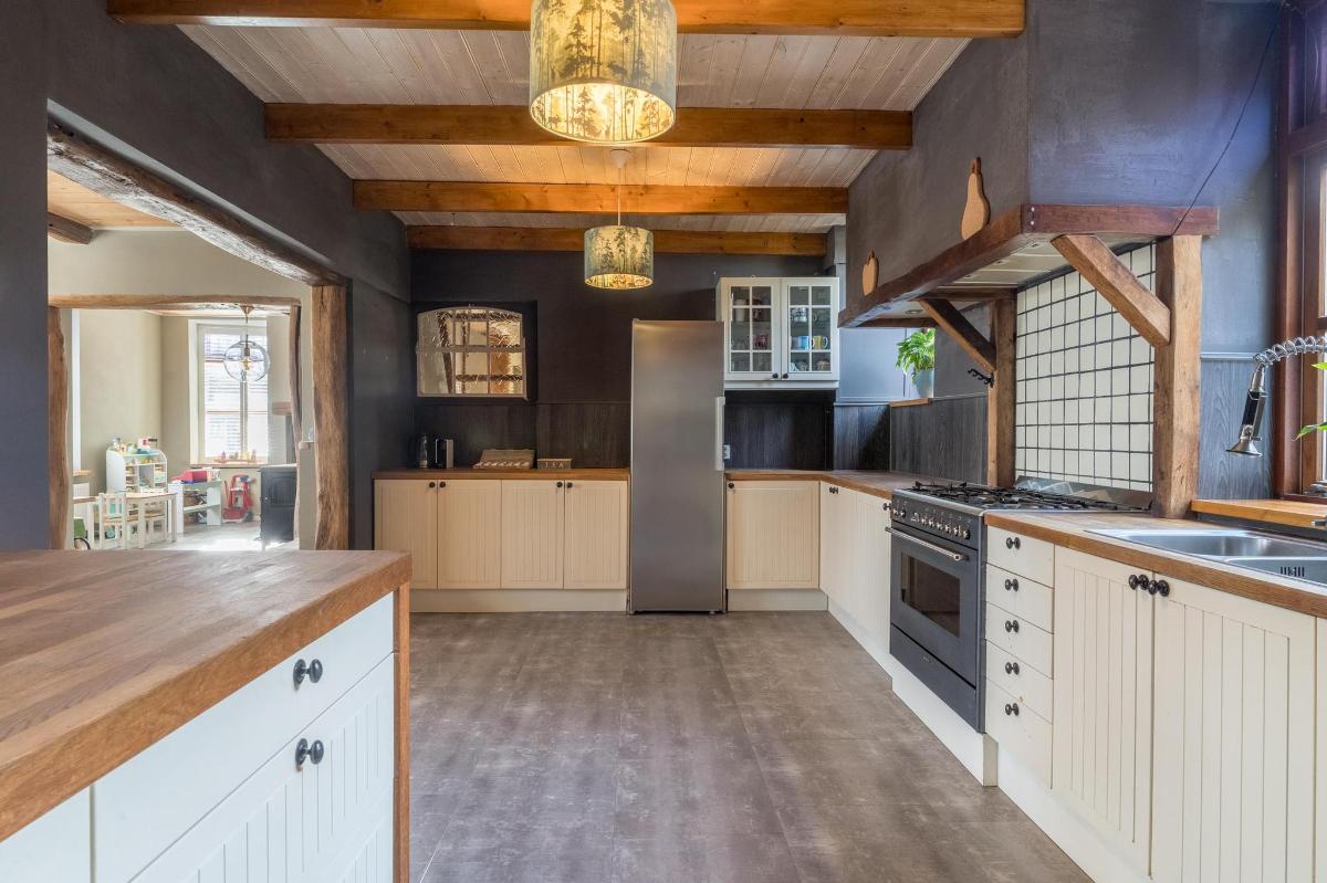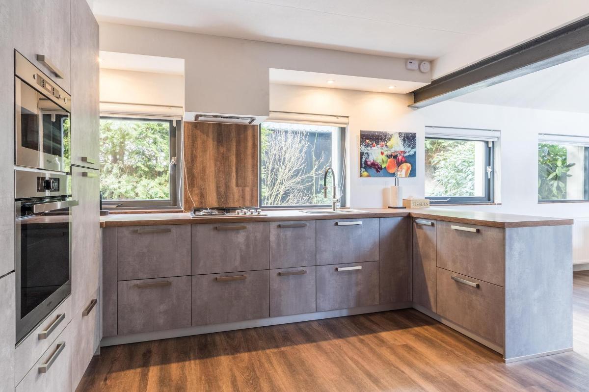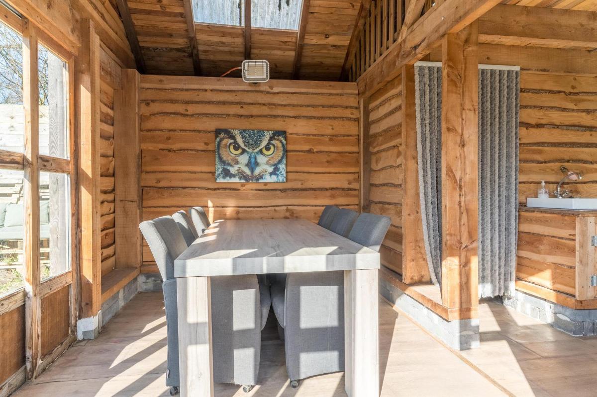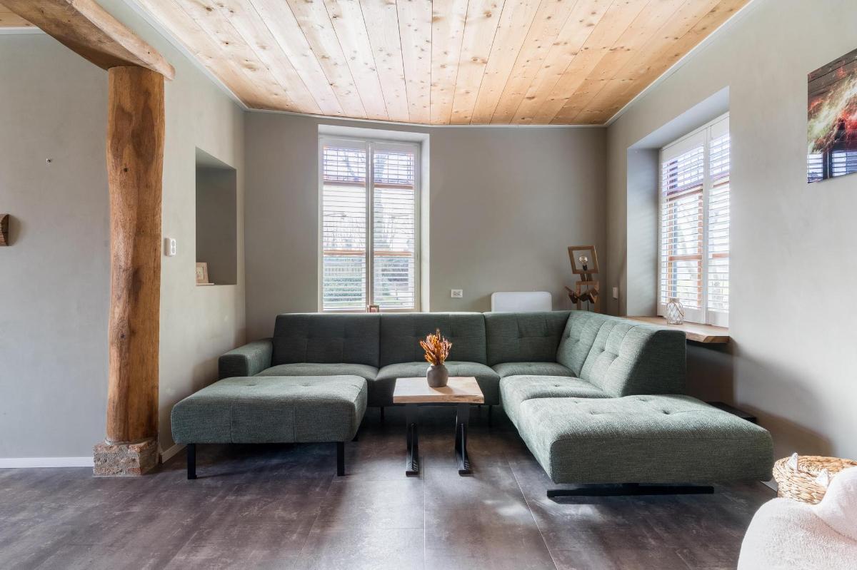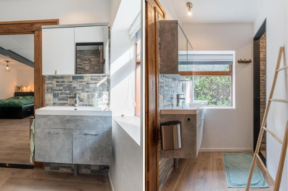 Indeling hoofdwoning – begane grond Via de entree kom je in een sfeervolle woonkamer met houtkachel, verbonden met een eetkamer en speelruimte. De landelijke keuken is voorzien van inbouwapparatuur en heeft, net als de overige leefruimtes, een betonlook PVC-vloer en karakteristieke houten togen. Verder vind je hier een multifunctionele ruimte (kantoor/gameroom), een ruime bijkeuken met toegang tot garage en berging, en een luxe badkamer met whirlpool, sauna, inloopdouche, toilet, natuurstenen vloer met vloerverwarming en mechanische ventilatie.