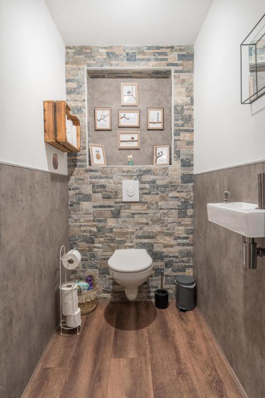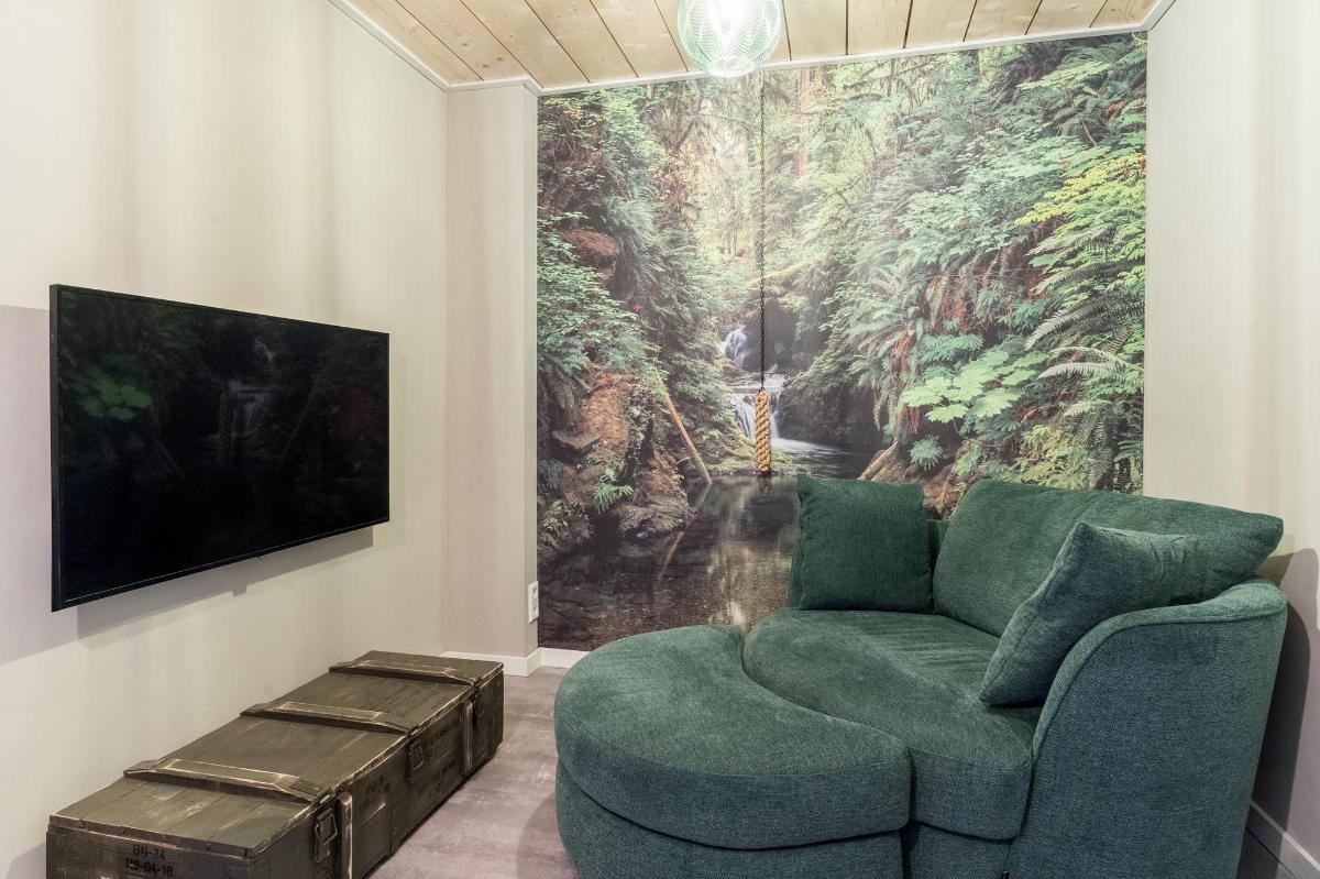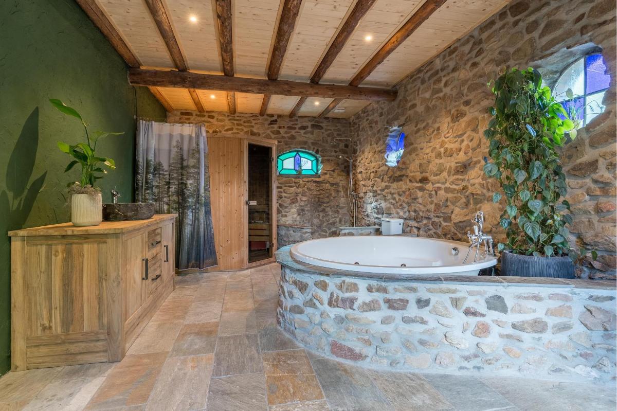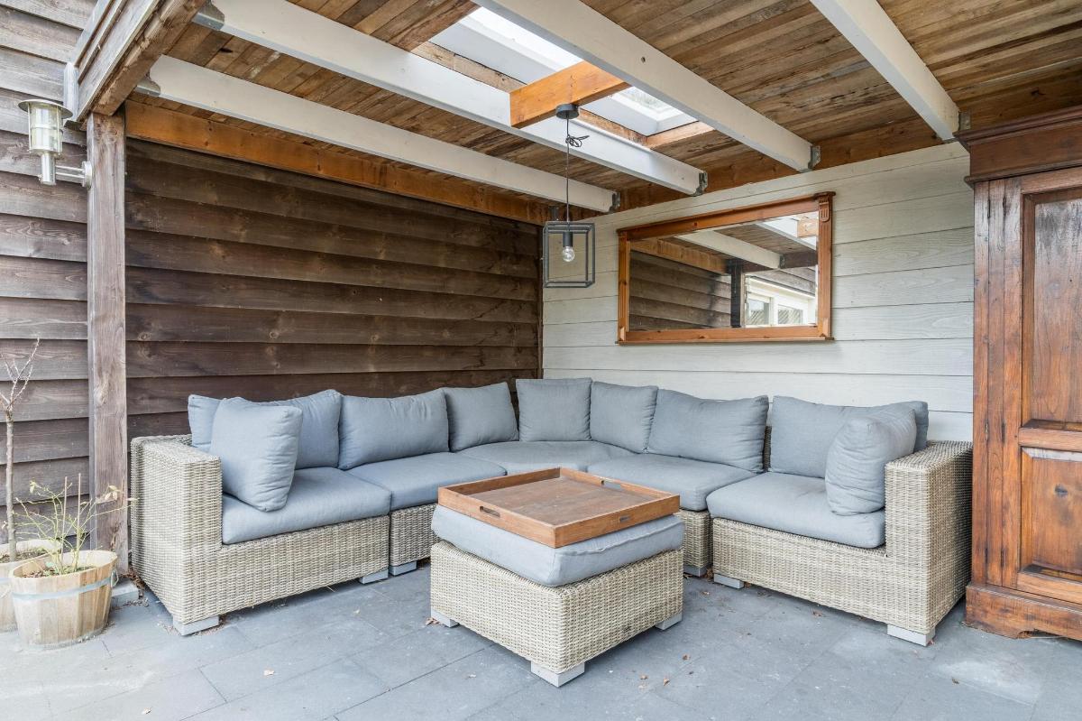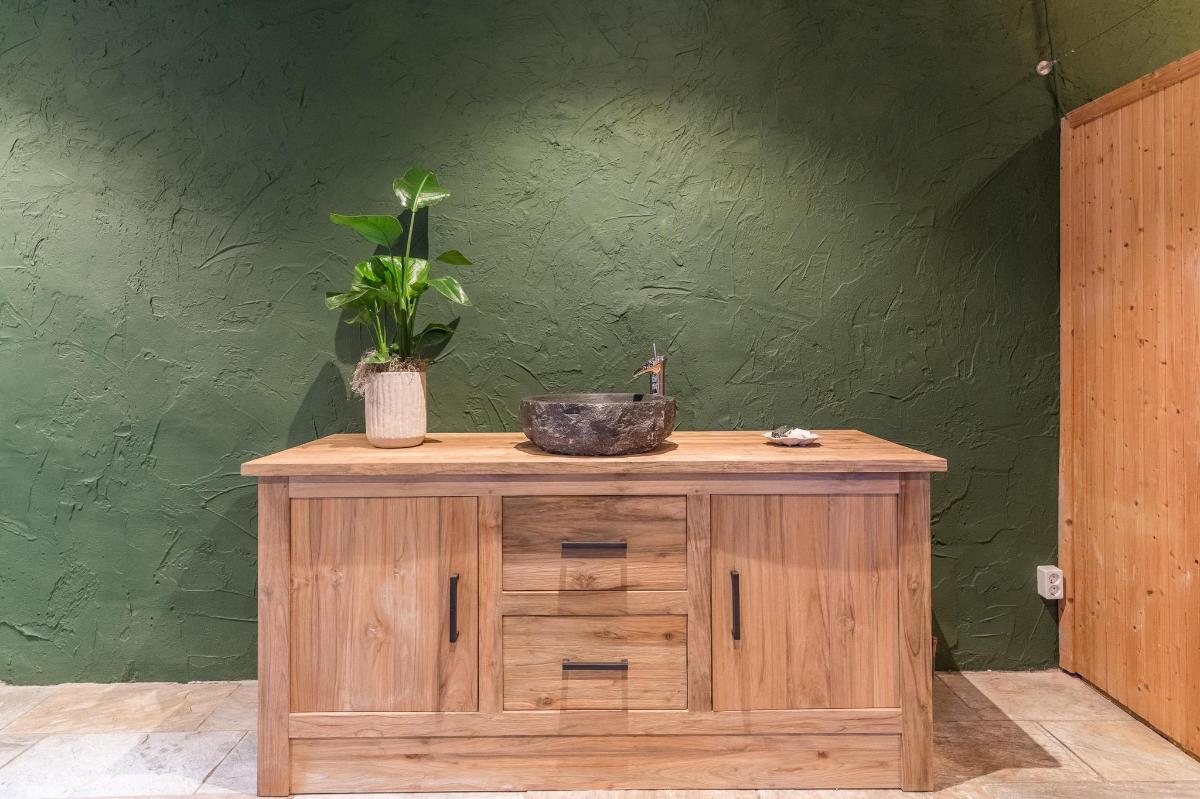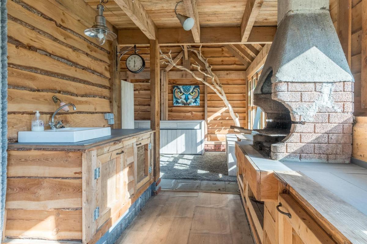 Indeling hoofdwoning – begane grond Via de entree kom je in een sfeervolle woonkamer met houtkachel, verbonden met een eetkamer en speelruimte. De landelijke keuken is voorzien van inbouwapparatuur en heeft, net als de overige leefruimtes, een betonlook PVC-vloer en karakteristieke houten togen. Verder vind je hier een multifunctionele ruimte (kantoor/gameroom), een ruime bijkeuken met toegang tot garage en berging, en een luxe badkamer met whirlpool, sauna, inloopdouche, toilet, natuurstenen vloer met vloerverwarming en mechanische ventilatie.