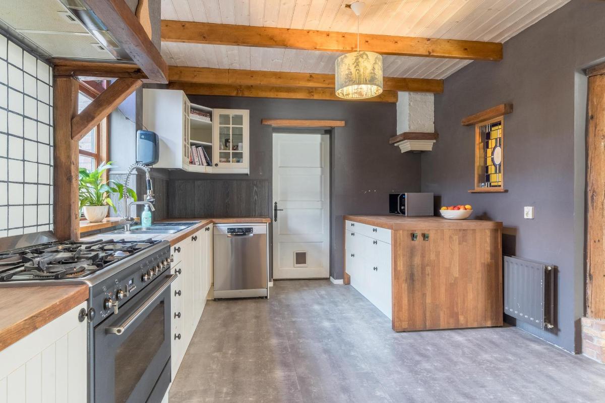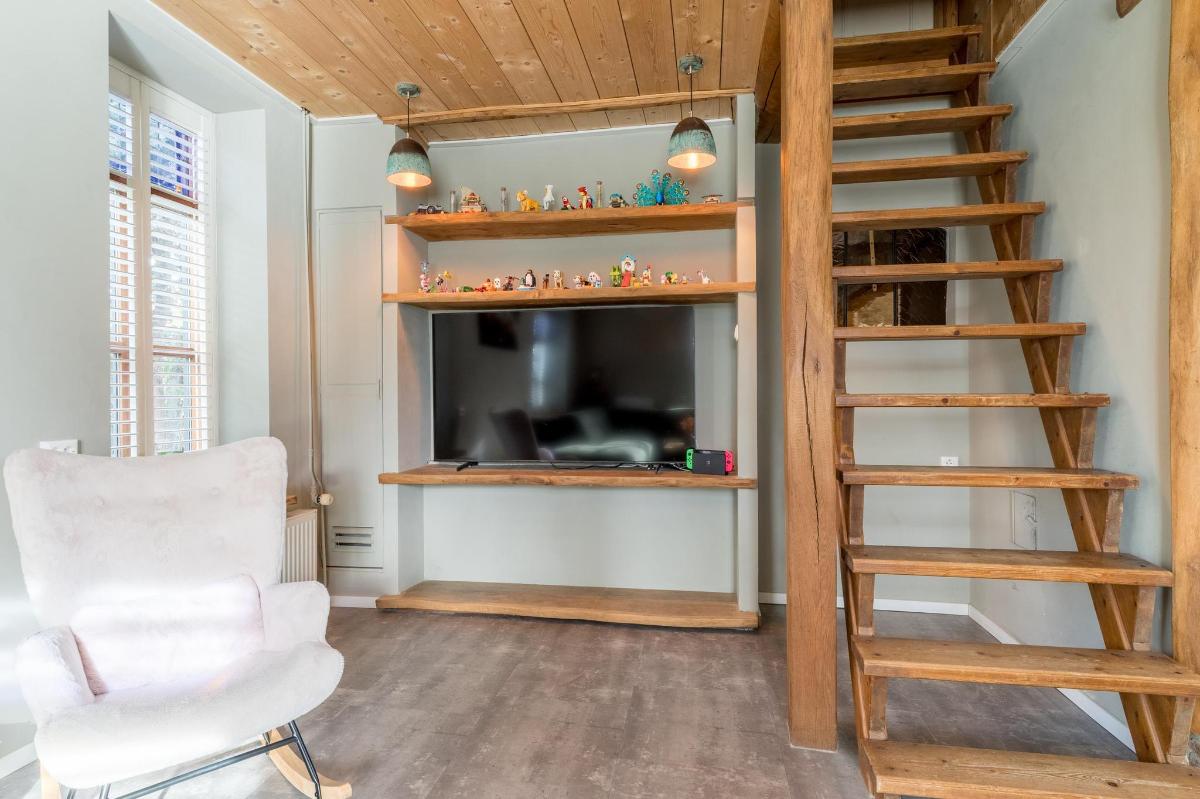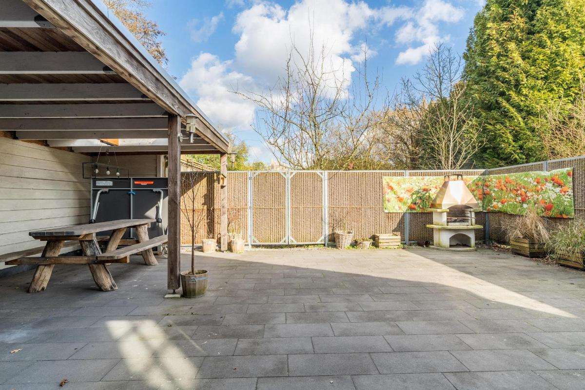 Tweede woning (B&B/kangoeroewoning) De tweede woning is volledig gelijkvloers, met een lichte woonkamer en hoog balkenplafond, een moderne keuken in U-opstelling, twee ruime slaapkamers en een luxe badkamer met elektrische vloerverwarming en regendouche. Via een schuifpui bereik je de besloten tuin met overkapping en vaste BBQ. Ideaal voor verhuur, mantelzorg of kantoorruimte.