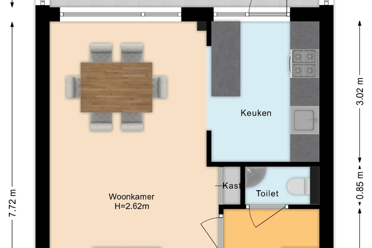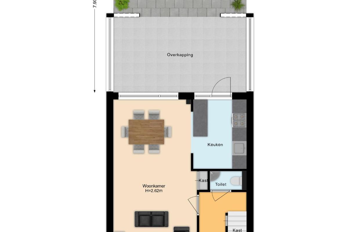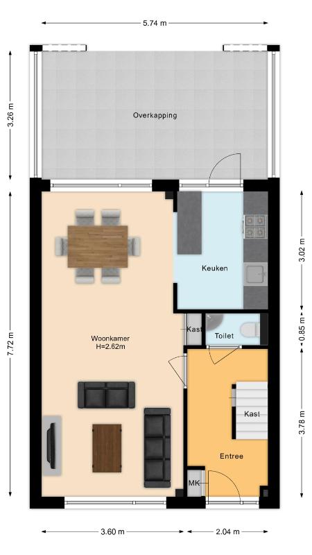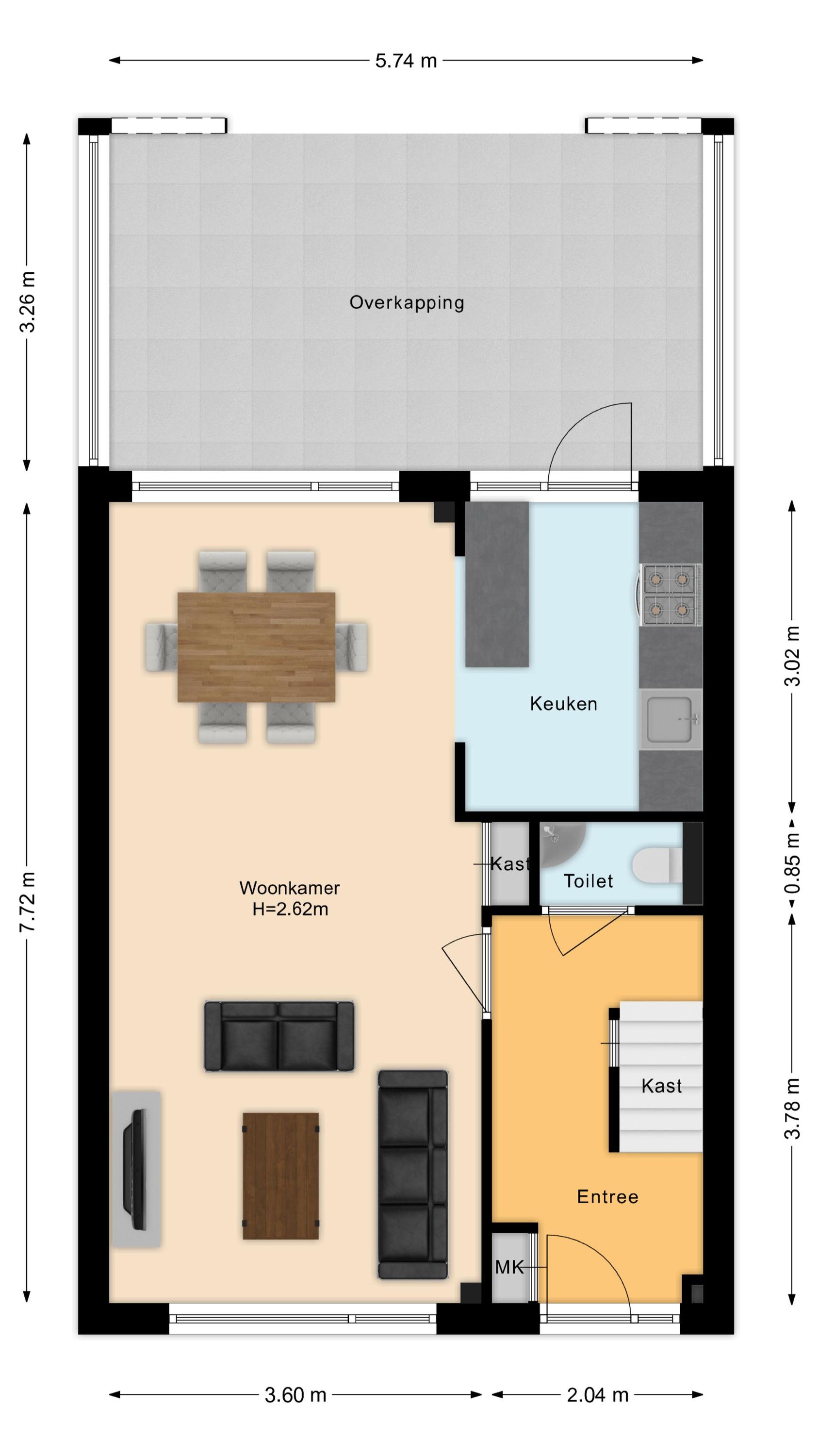Op de begane grond kom je binnen in de hal met toiletruimte en trapopgang. Vanuit de hal bereik je de woonkamer en de keuken, die is uitgerust met een praktisch eiland en prettig daglicht.