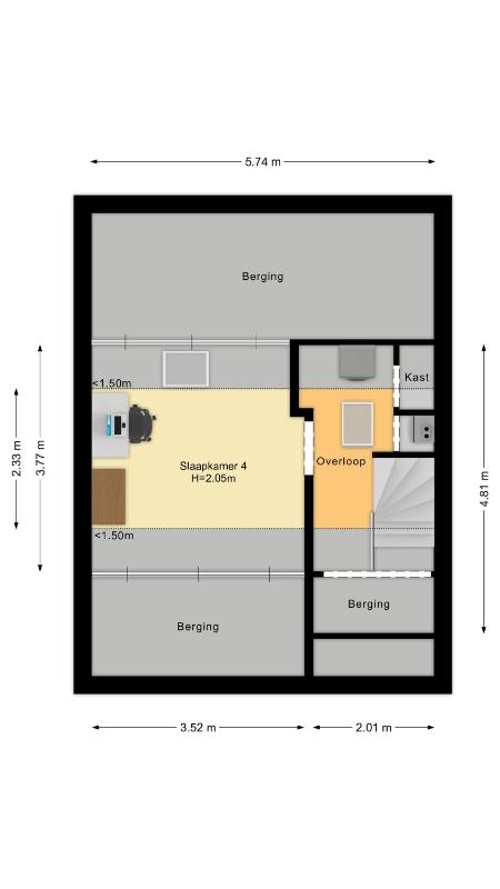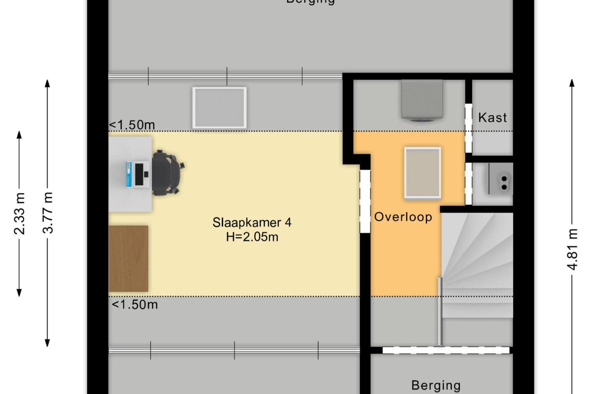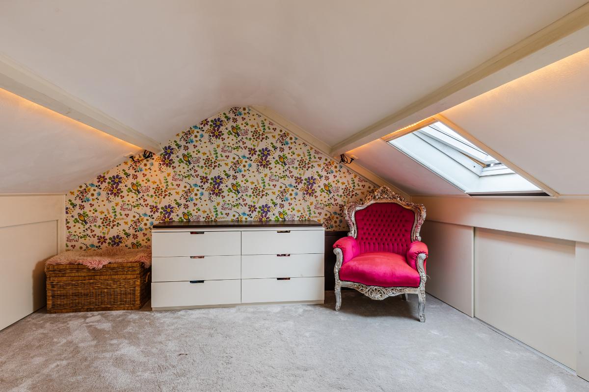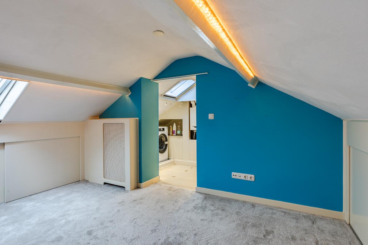 De zolderverdieping biedt een voorzolder met opstelplaats voor wasmachine en droger en een vierde (slaap)kamer, voorzien van bergruimte achter de knieschotten.
