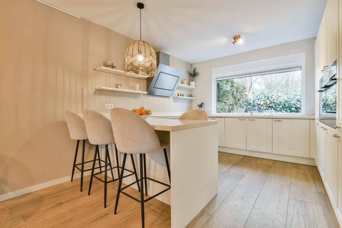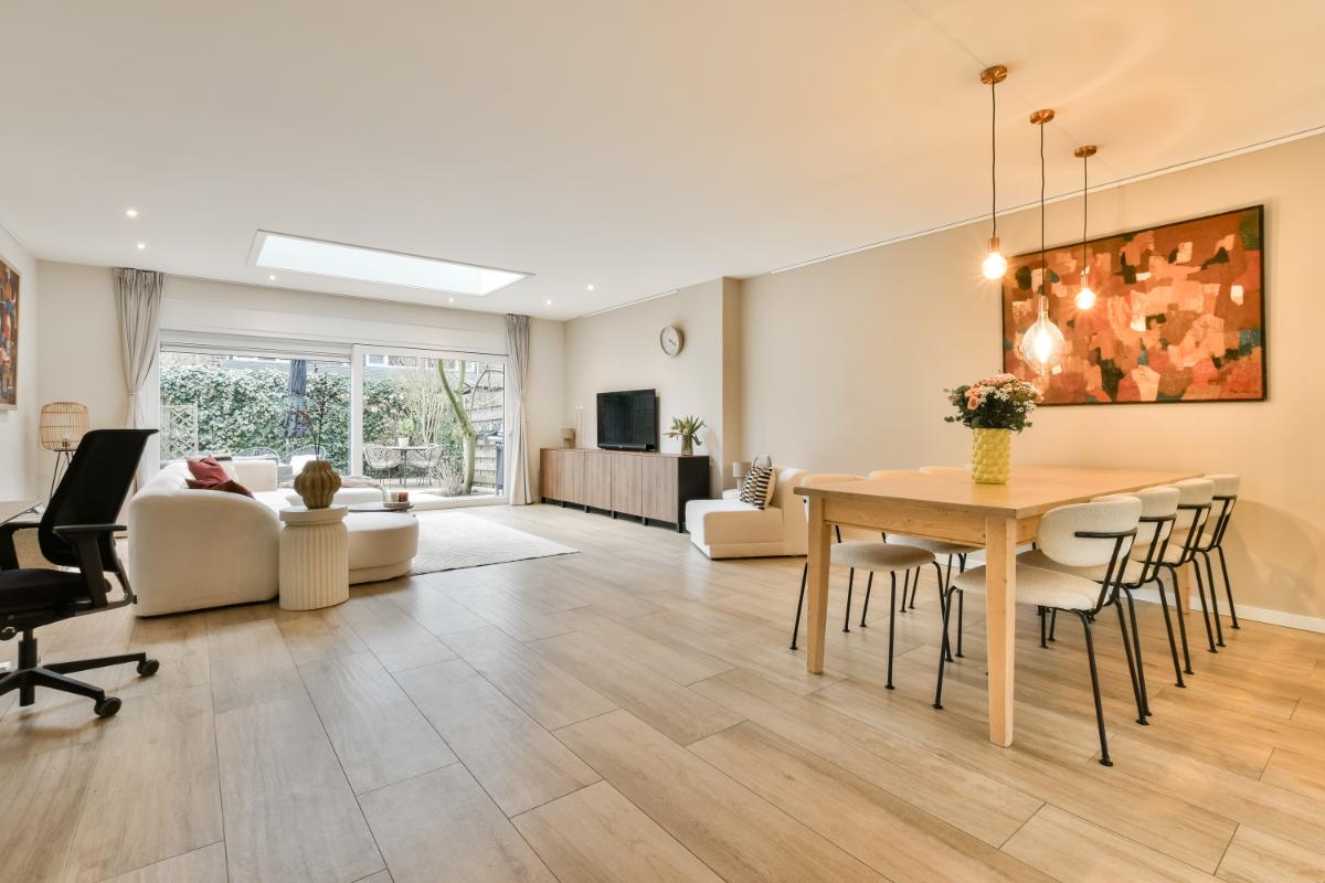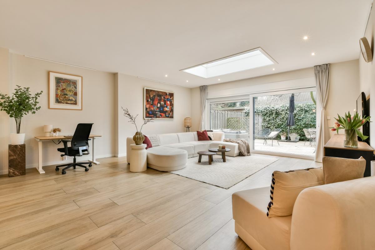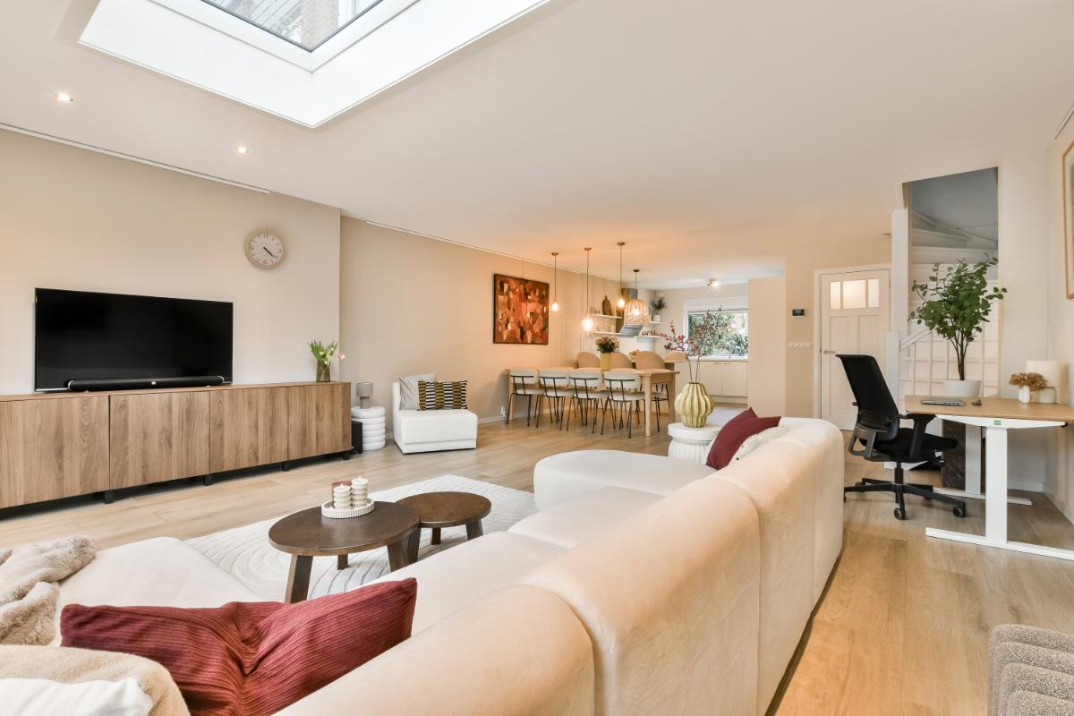 The spacious living room has been extended and offers ample space for a sitting and dining area. In addition, there are large windows at the rear and a beautiful skylight in the extension, making the living room wonderfully bright! The wide, inviting garden room features a modern tiled floor with a wood effect and underfloor heating. It also includes a spacious under-stairs cupboard and the stairs to the first floor.
