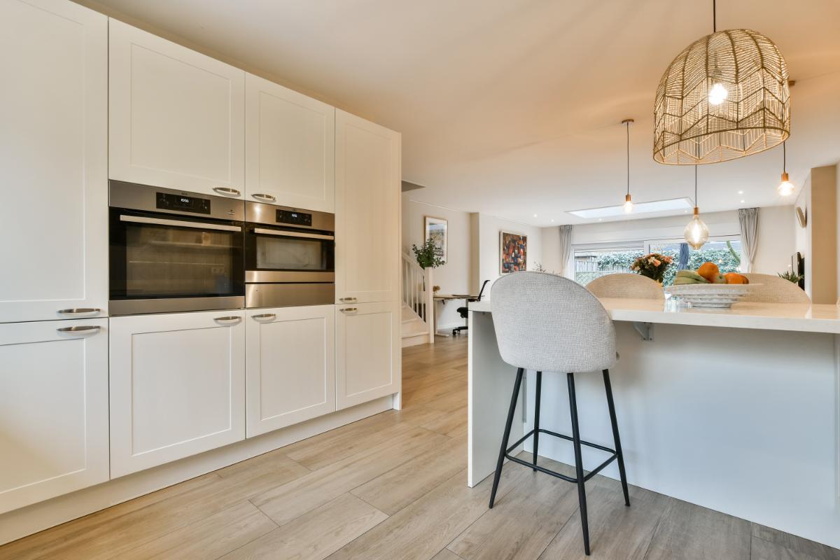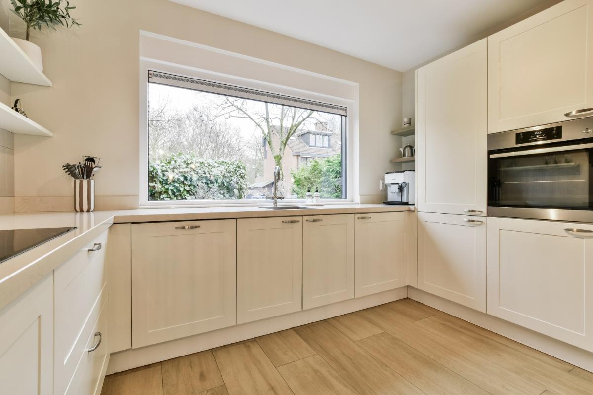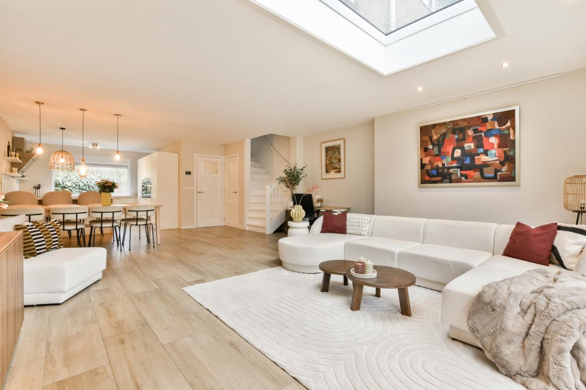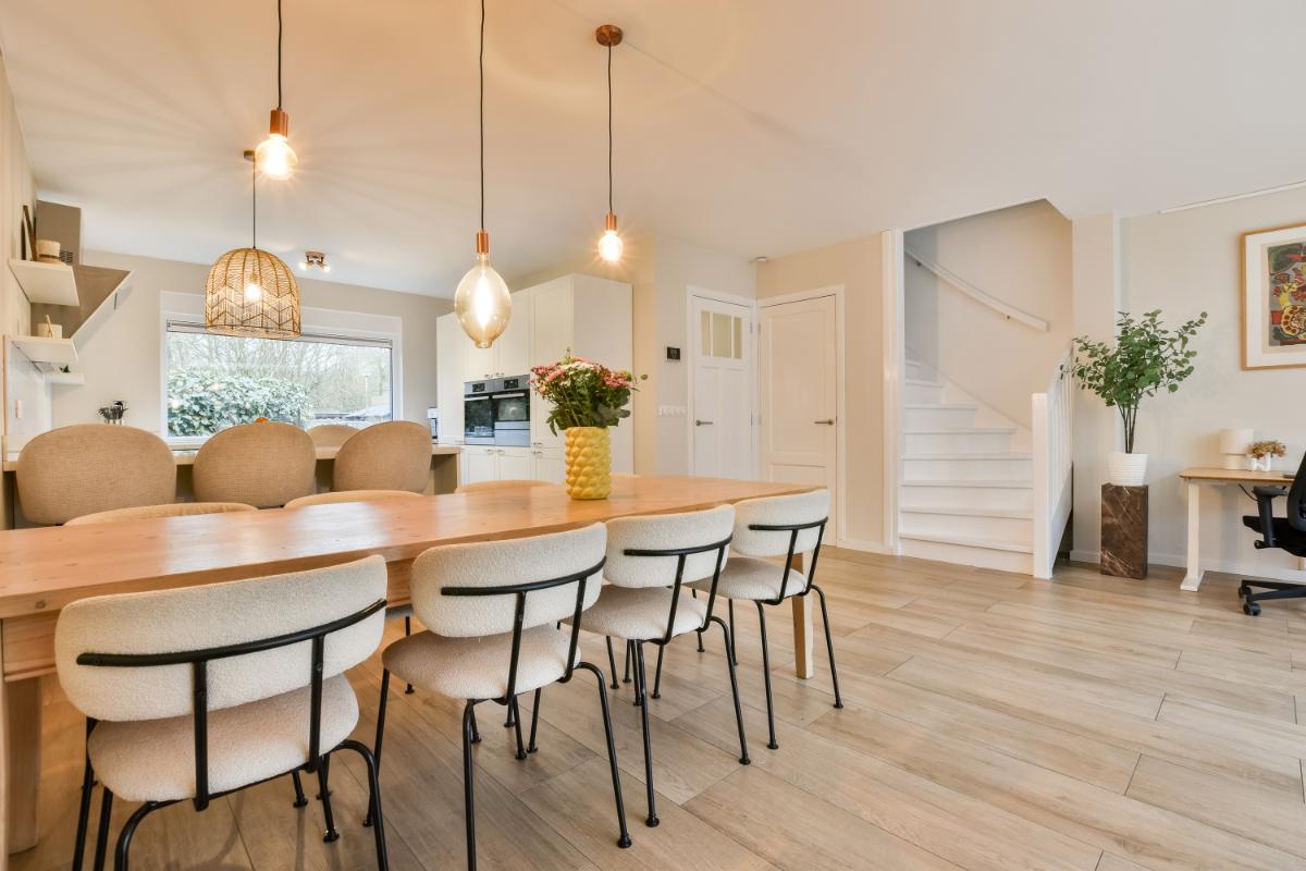 The spacious living room has been extended and offers ample space for a sitting and dining area. In addition, there are large windows at the rear and a beautiful skylight in the extension, making the living room wonderfully bright! The wide, inviting garden room features a modern tiled floor with a wood effect and underfloor heating. It also includes a spacious under-stairs cupboard and the stairs to the first floor.