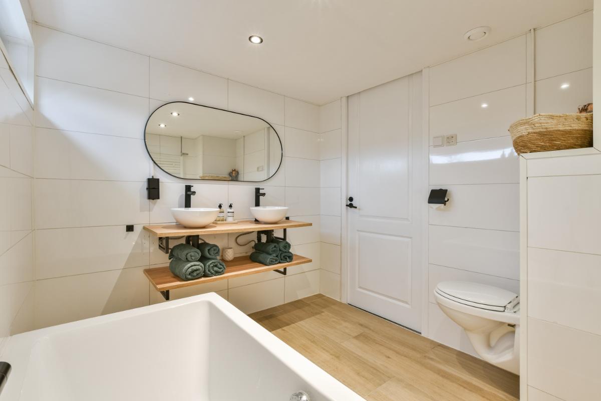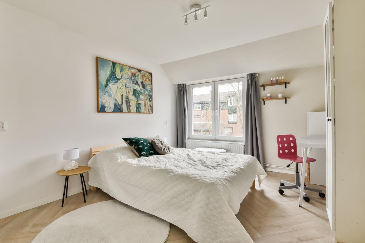 The first floor is accessible via a staircase. The first floor comprises three spacious bedrooms and a generously sized modern bathroom. This floor, with the exception of the first floor, is not accessible. The bathroom features a modern herringbone floor. The doors to the bedrooms and bathroom were replaced with high doors in 2024. The spacious, fully tiled bathroom includes a bathtub with shower facilities, wood-look floor tiles, a designer radiator, atmospheric spotlights in the ceiling, a wall-hung toilet, and a modern double vanity with storage space for towels. There is also a window for natural light.