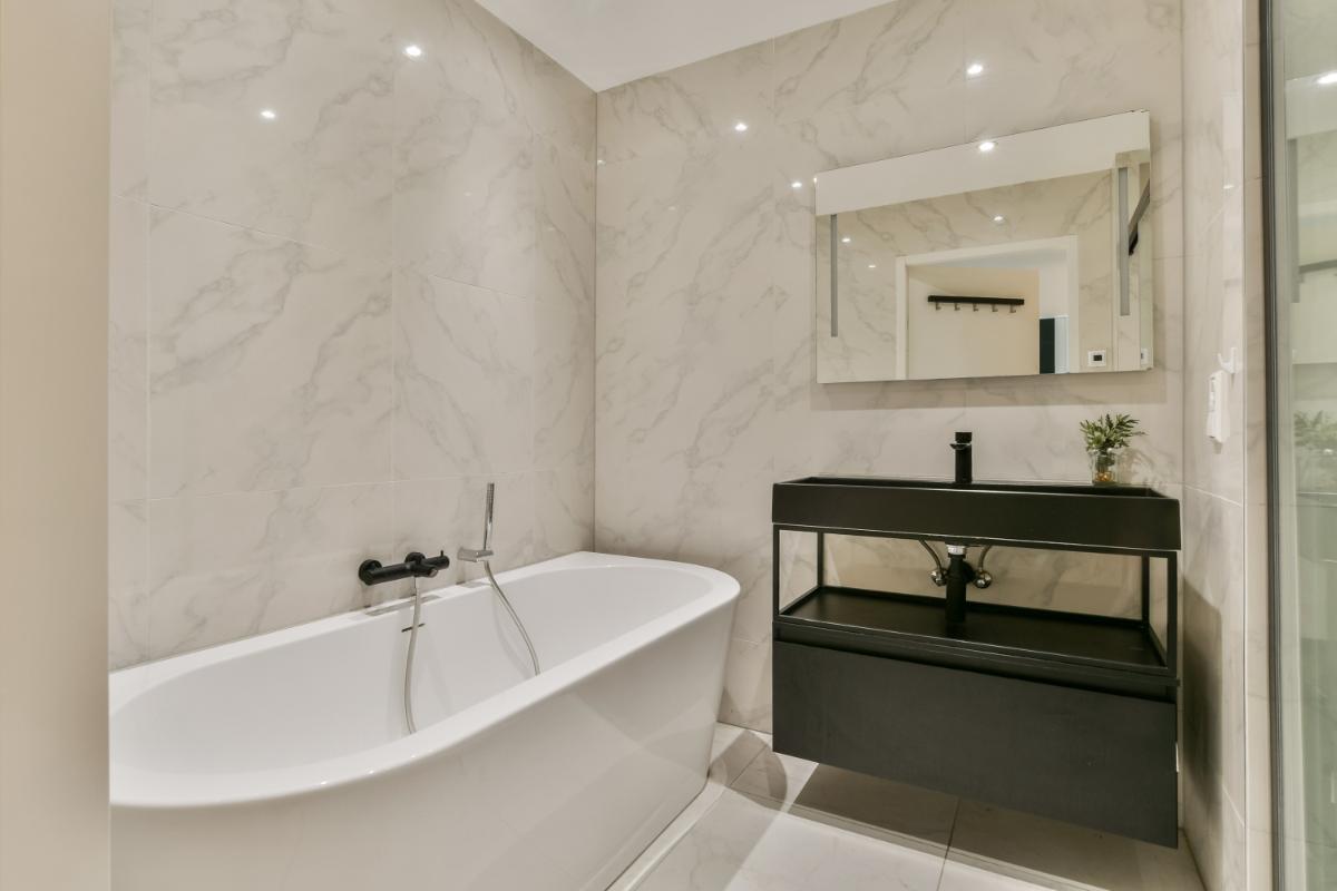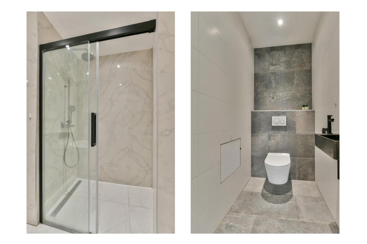 De badkamer is volledig betegeld, er is een ruime inloopdouche, een ligbad en een wastafel met wastafelmeubel. In het appartement is een modern, separaat toilet aanwezig naast de badkamer. Ook is er een ruime inpandige berging met de aansluitingen voor de wasmachine en de droger.