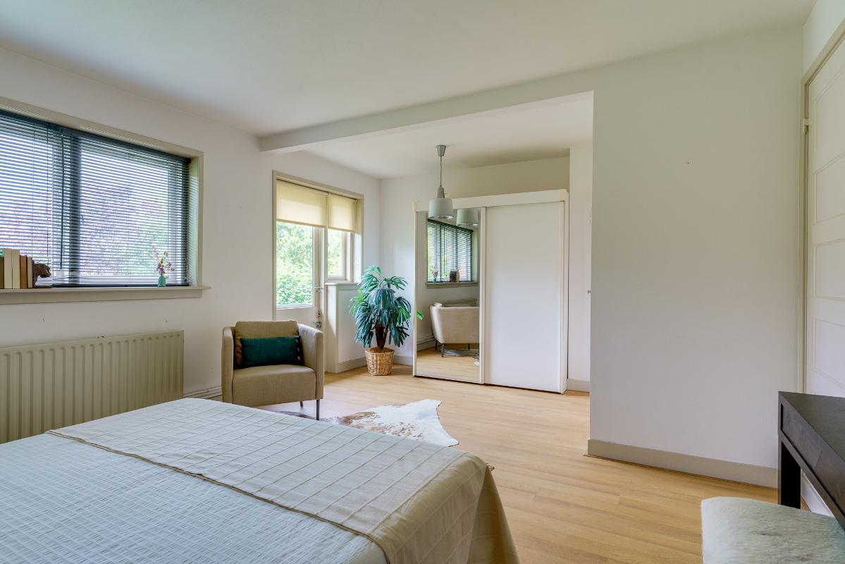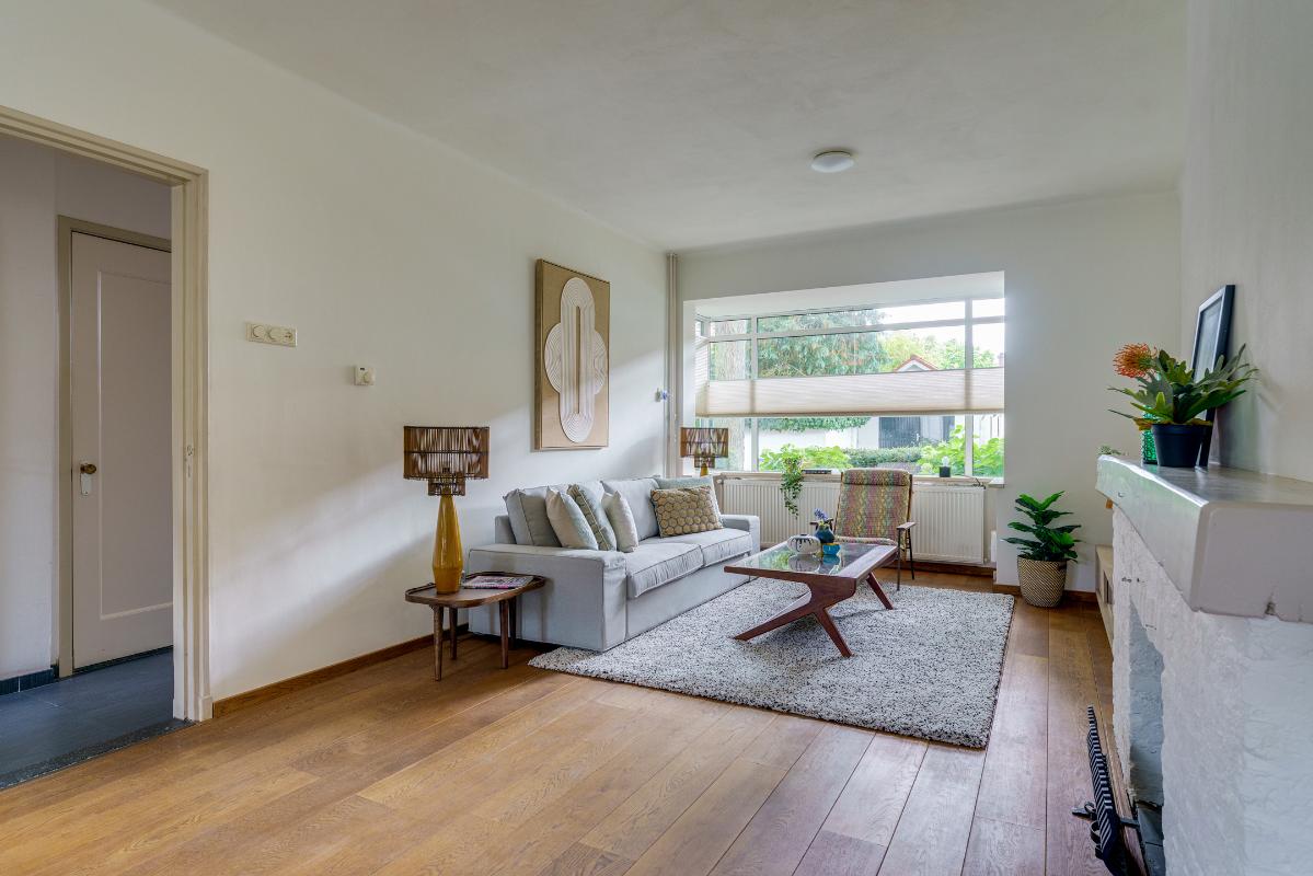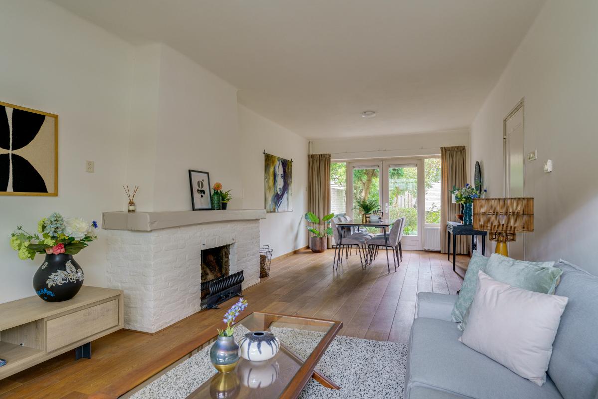 De riante living biedt volop leefruimte en meer dan genoeg plek voor een royale zit- en eethoek. Dankzij de erker aan de voorzijde en de openslaande tuindeuren aan de achterzijde geniet de woonkamer van veel natuurlijk licht. De afwerking bestaat uit een eikenhouten vloer, gestuukte wanden en plafonds, en een open haard met schouw. Via de openslaande deuren met dauerluftventilatie is er directe toegang tot de achtertuin, waar u heerlijk kunt genieten van het buitenleven.