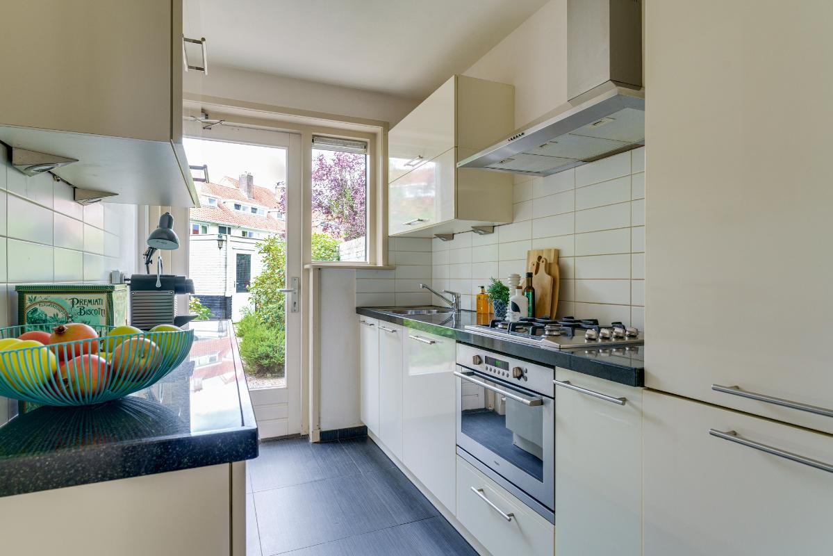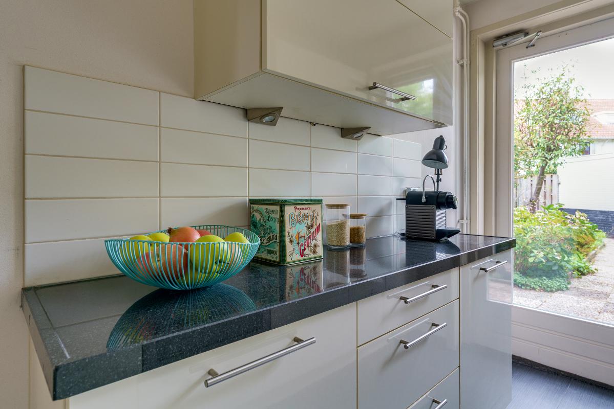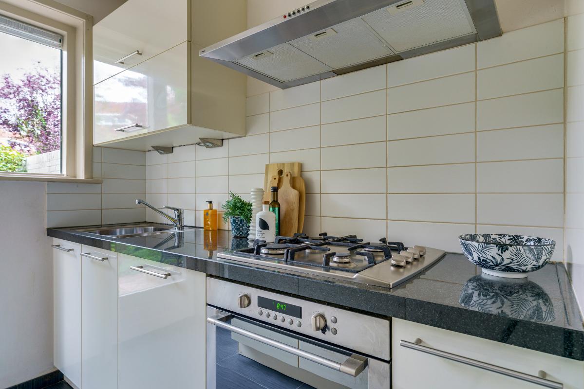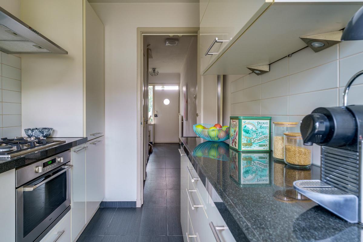 De dichte keuken bevindt zich aan de achterzijde van de woning en is voorzien van een antracietkleurige tegelvloer en een keukeninrichting in parallelopstelling. De keuken beschikt over een 4-pits gaskookplaat, RVS afzuigkap, oven, koelkast en vaatwasser. Het granieten aanrechtblad en de diverse boven- en onderkasten maken het geheel compleet. Vanuit de keuken is eveneens toegang tot de achtertuin.