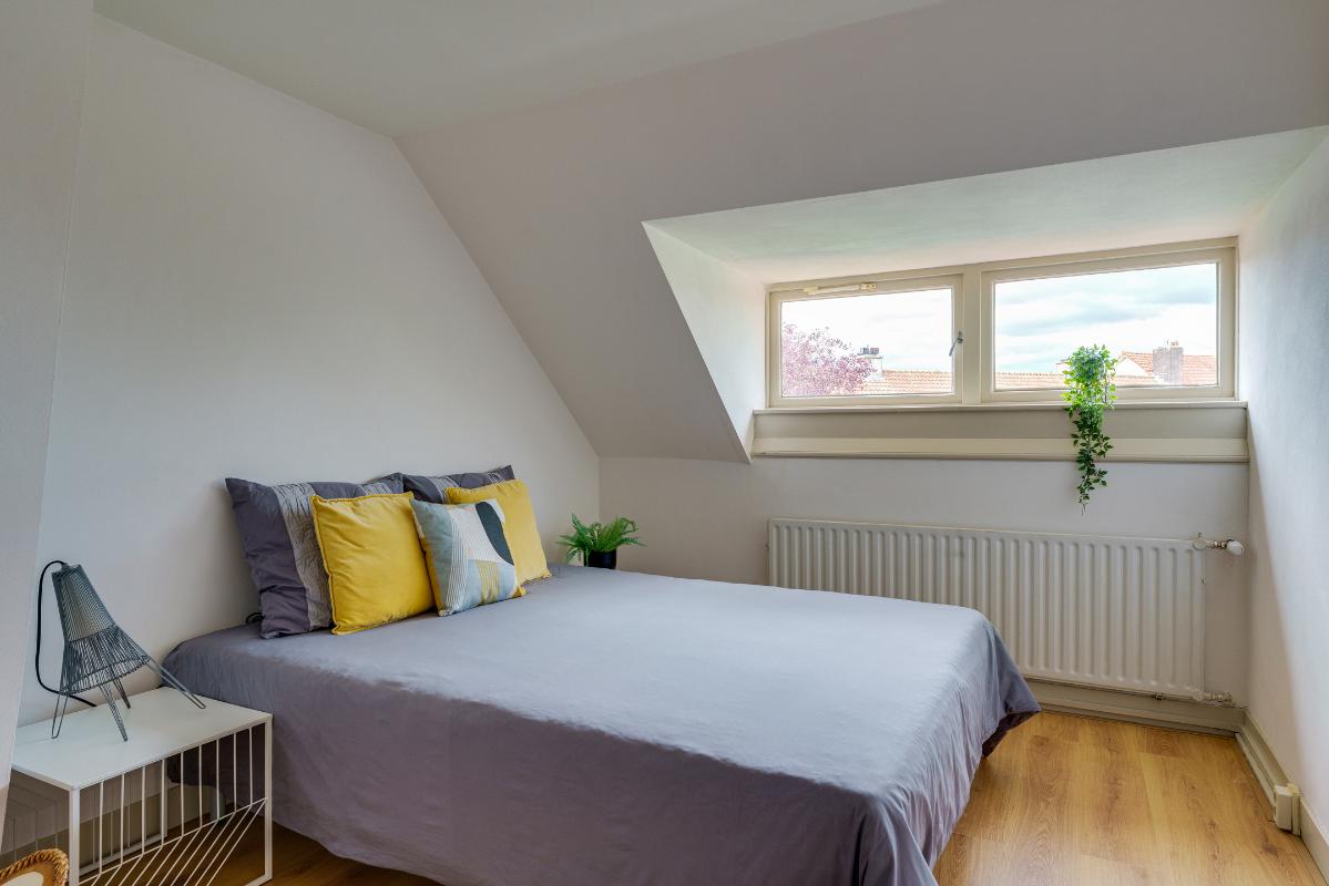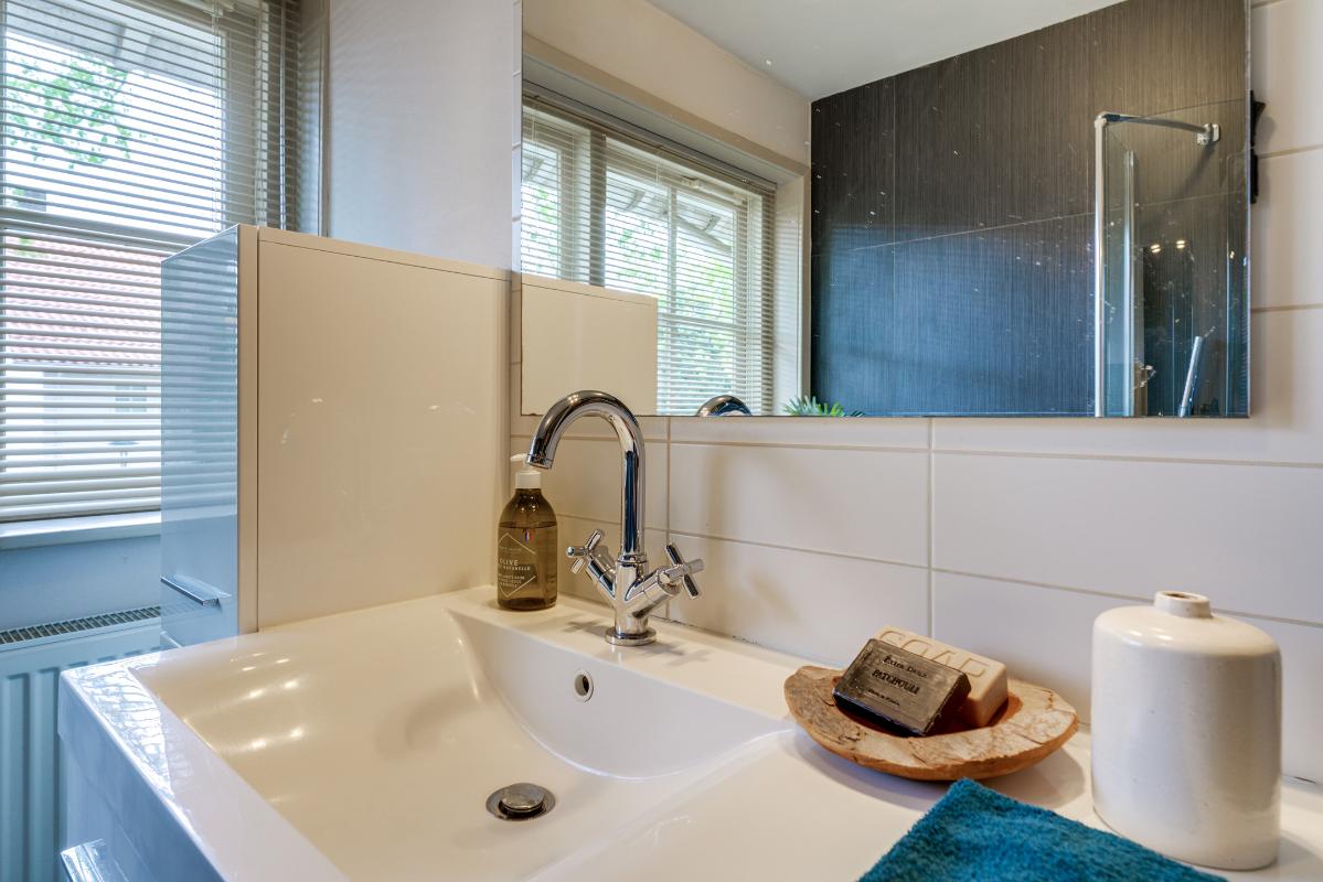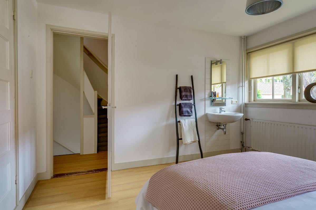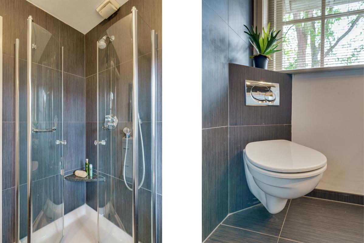 1e verdieping De overloop met laminaatvloer en bergkast geeft toegang tot twee ruime slaapkamers en de badkamer. Slaapkamer 1 (master bedroom) is gelegen aan de achterzijde en beschikt over een laminaatvloer, twee inbouwkasten en veel ruimte. Vanuit deze kamer heeft u toegang tot het balkon aan de achterzijde. Indien gewenst is deze kamer op te splitsen in twee kamers (één kleinere en één grotere). Slaapkamer 2, gelegen aan de voorzijde, beschikt eveneens over een laminaatvloer, een dubbele inbouwkast én een vaste wastafel. Beide slaapkamers zijn afgewerkt met gestuukte wanden en plafonds. Badkamer De nette badkamer is uitgerust met een douchecabine, wandcloset, vloerverwarming, radiator en een wastafel met meubel. Ventilatie is zowel mechanisch als natuurlijk aanwezig.