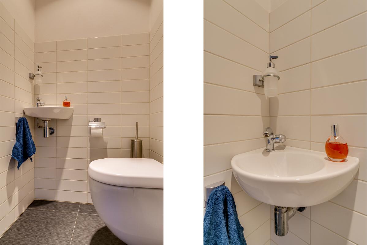 De gedeeltelijk betegelde toiletruimte is modern en voorzien van een wandcloset en fonteintje. Vanuit de hal zijn de living en keuken bereikbaar.