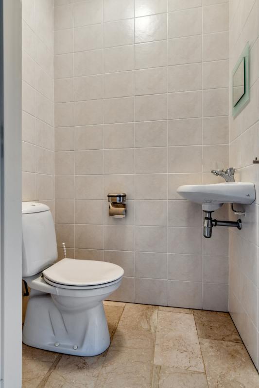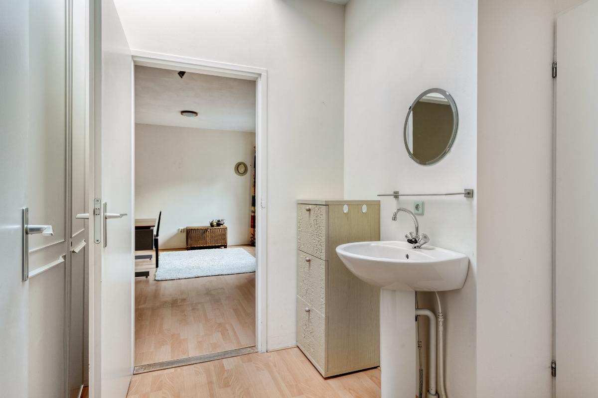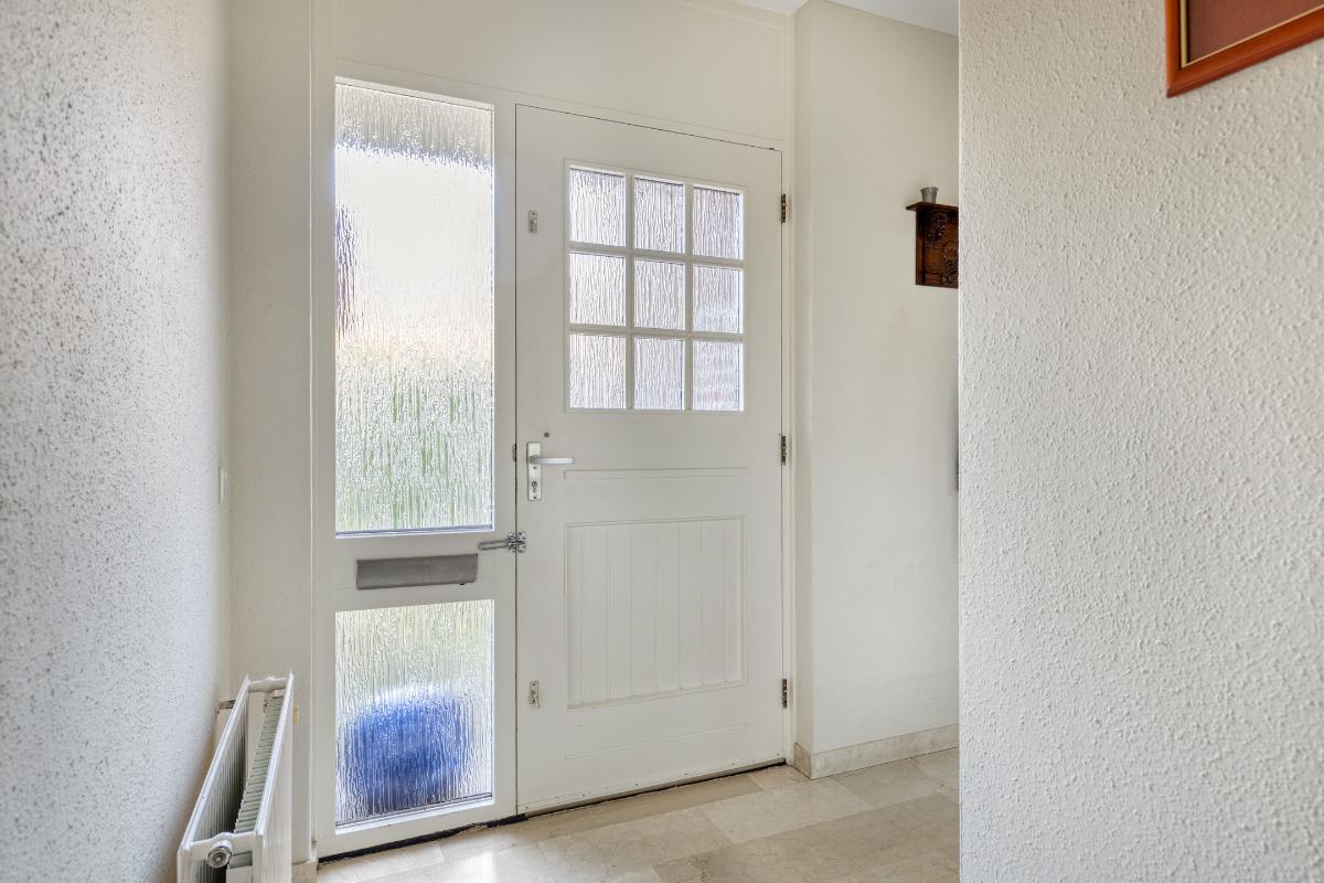HAL / ENTREE Ruime L-vormige ontvangsthal met toegang tot de meterkast (voorzien van vernieuwde groepenkast), toiletruimte met wandcloset en fonteintje, toegang tot de woonkamer, de hoofdslaapkamer met achtergelegen badkamer en een tussenportaal dat leidt naar de technische ruimte/inpandige berging en de tweede slaapkamer.