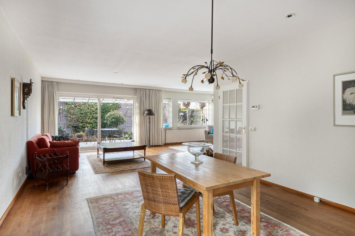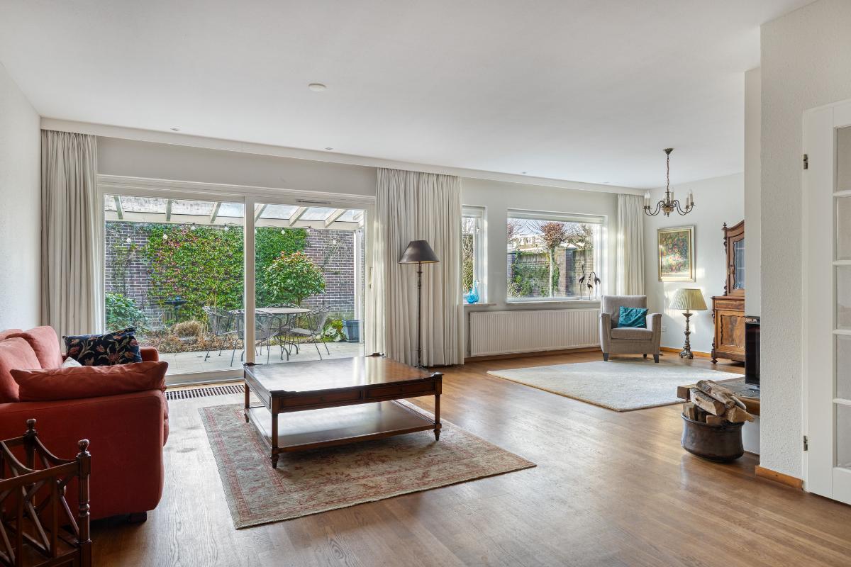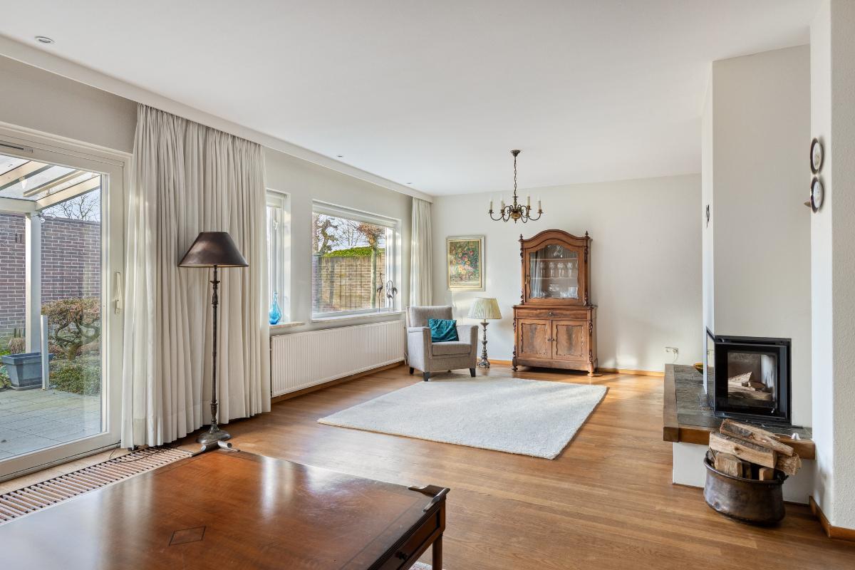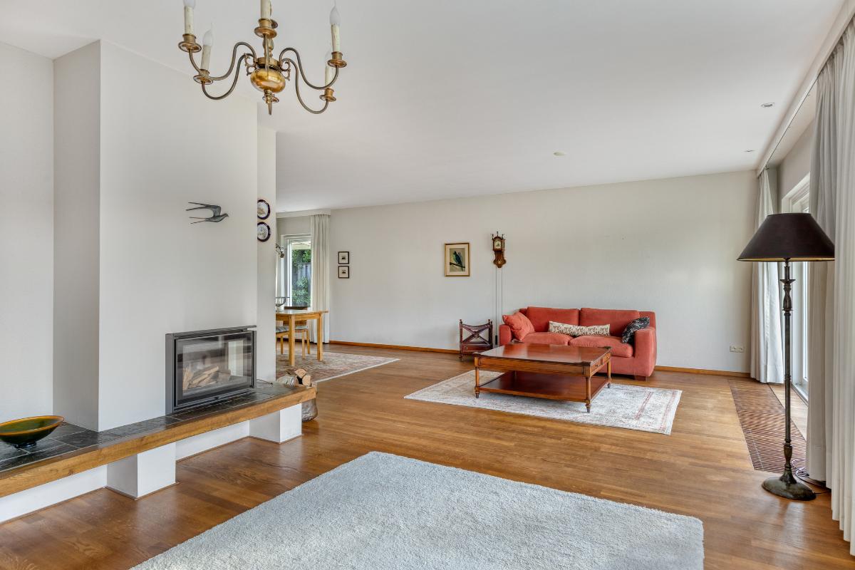 WOONKAMER De royale L-vormige living met haardpartij heeft een oppervlakte van circa 52 m² en biedt volop ruimte voor een zitgedeelte, eetgedeelte en eventueel een tweede zithoek. Via de schuifpui is er directe toegang tot het aangrenzende overdekte terras.