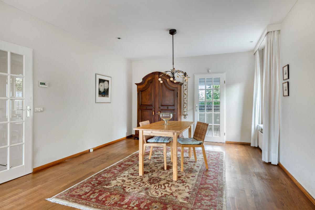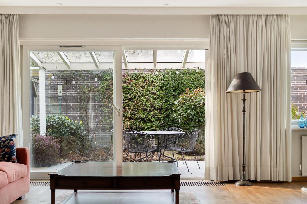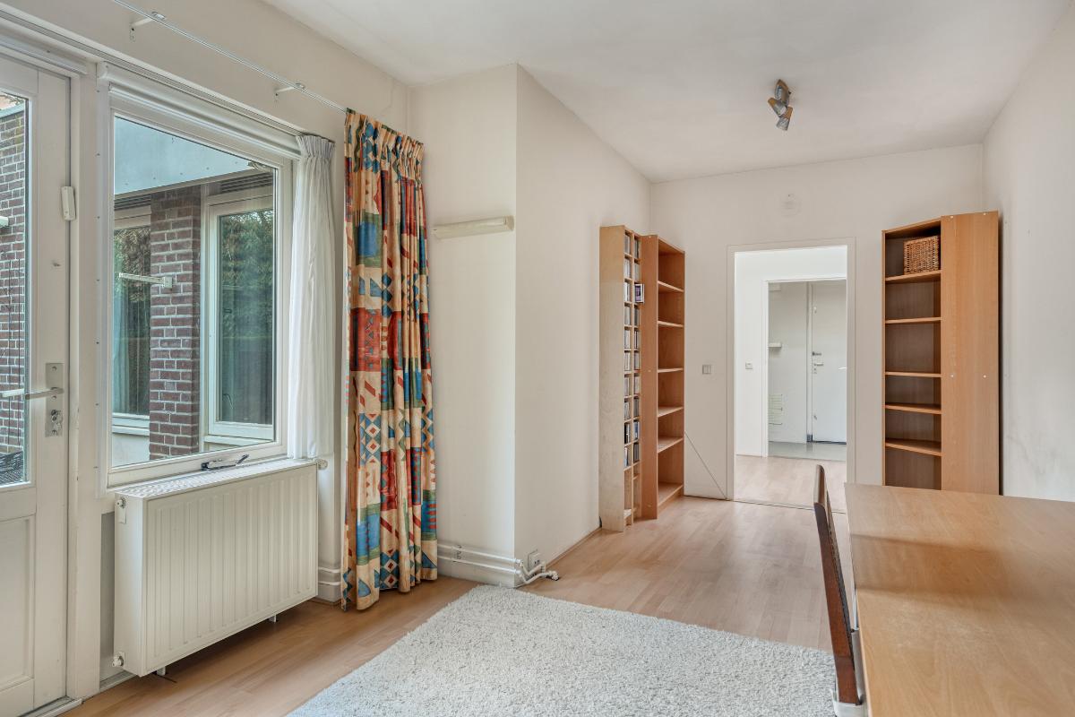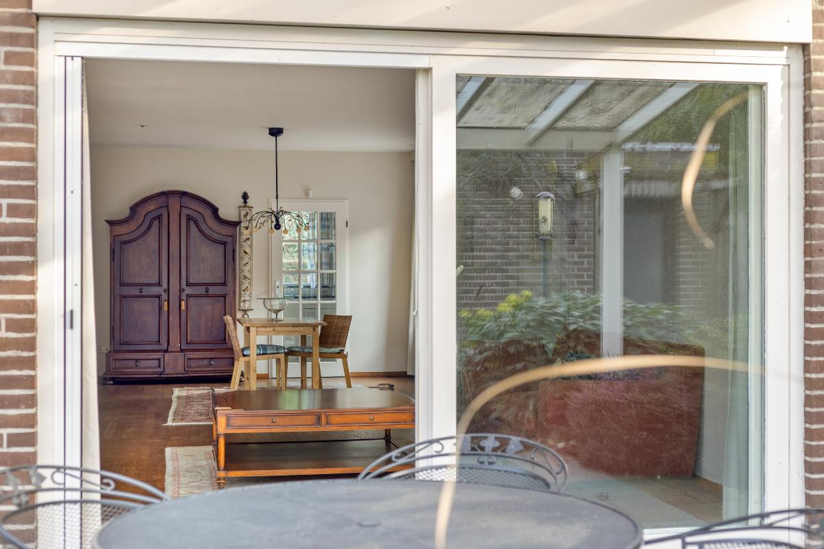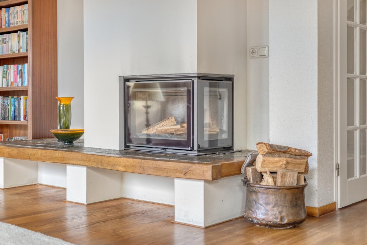 WOONKAMER De royale L-vormige living met haardpartij heeft een oppervlakte van circa 52 m² en biedt volop ruimte voor een zitgedeelte, eetgedeelte en eventueel een tweede zithoek. Via de schuifpui is er directe toegang tot het aangrenzende overdekte terras.