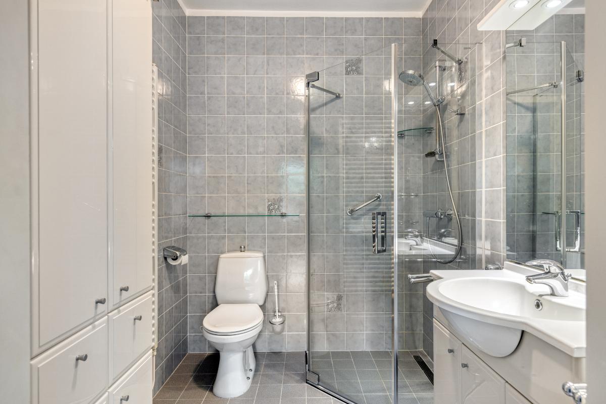 BADKAMER De badkamer grenst direct aan de hoofdslaapkamer en is voorzien van een toilet, wastafelmeubel en inloopdouche.