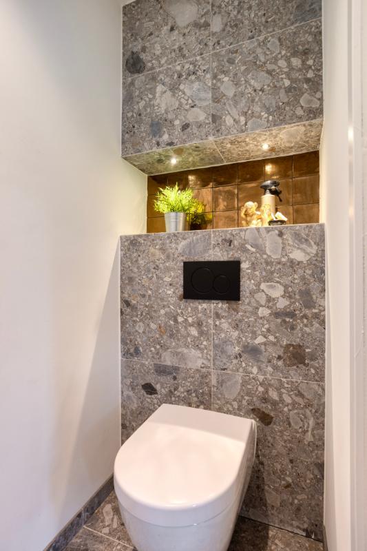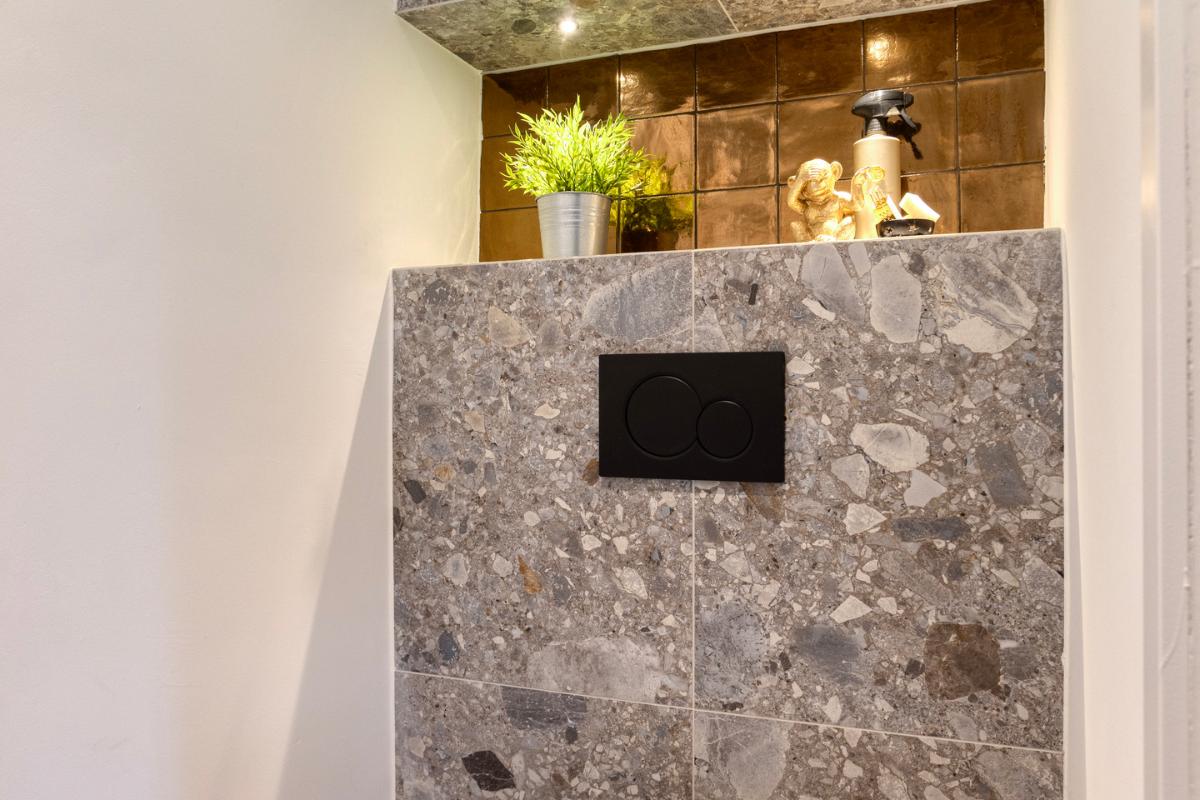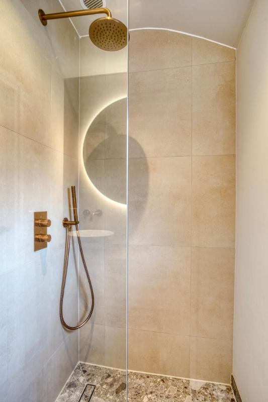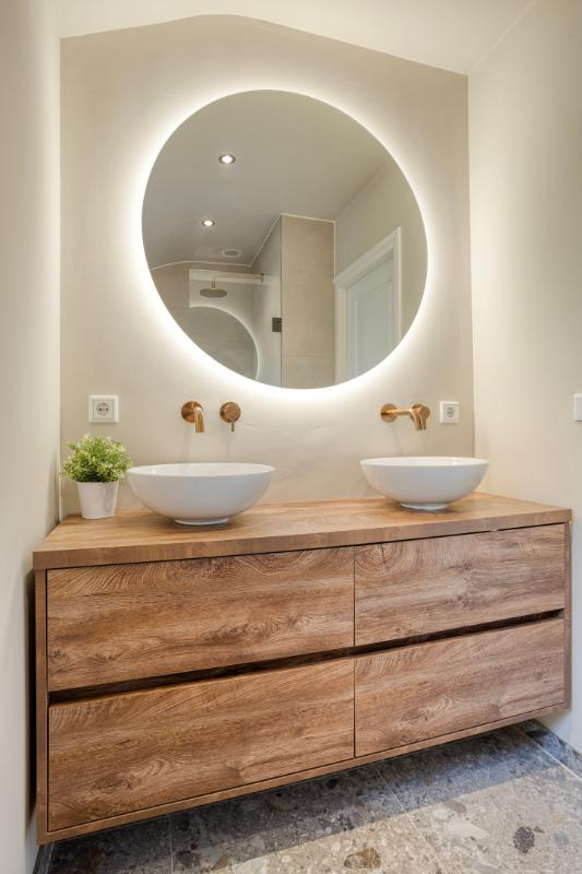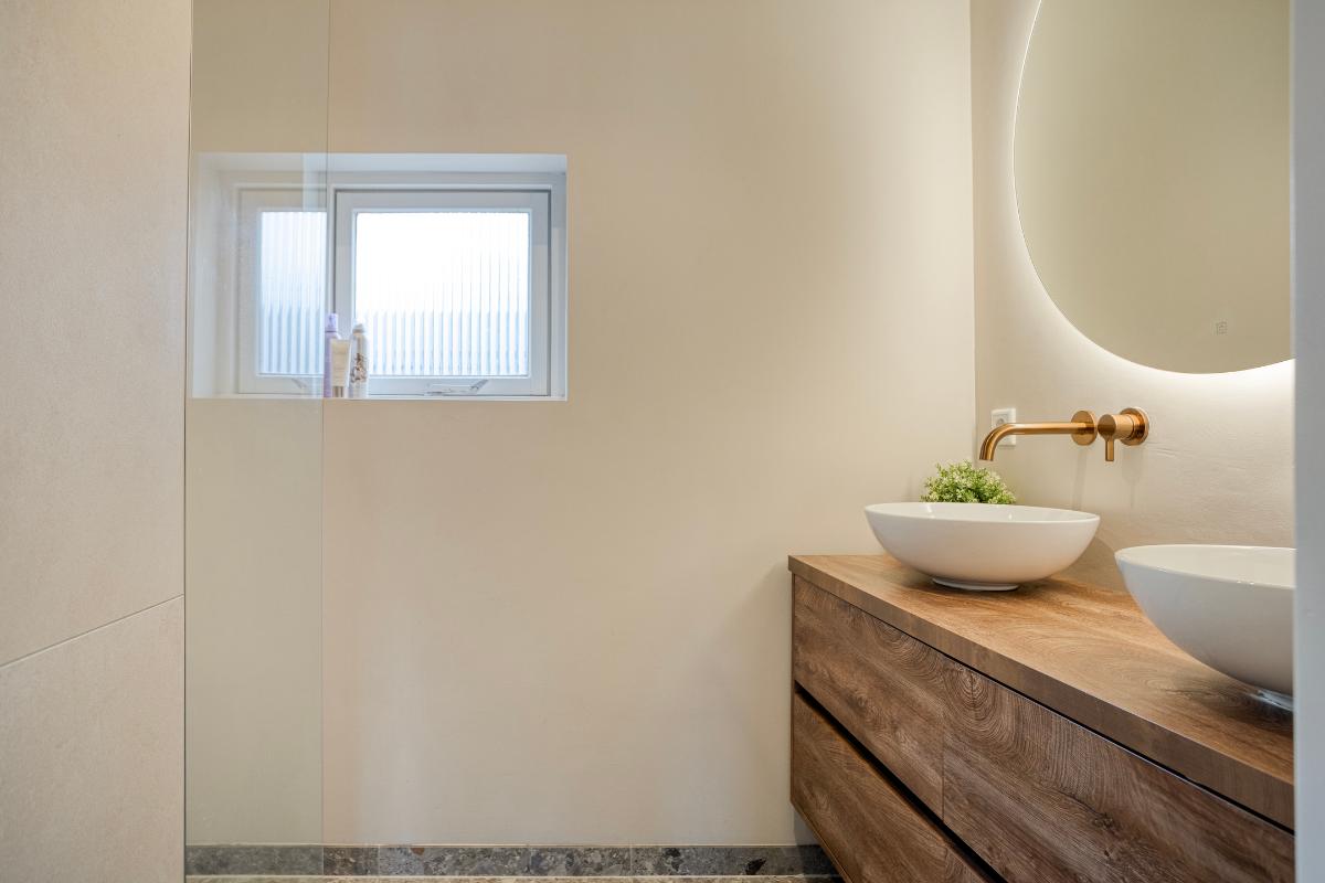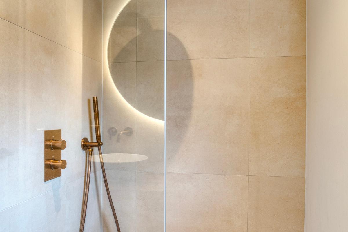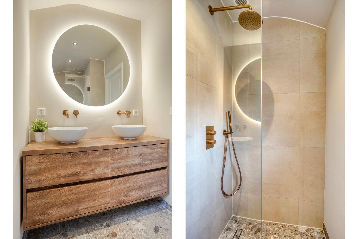 BADKAMER De badkamer is vergroot en in 2022 volledig vernieuwd. De indeling bestaat uit een ruime inloopdouche met regendouchekop en een dubbele wastafel in meubel met verlichte spiegel.