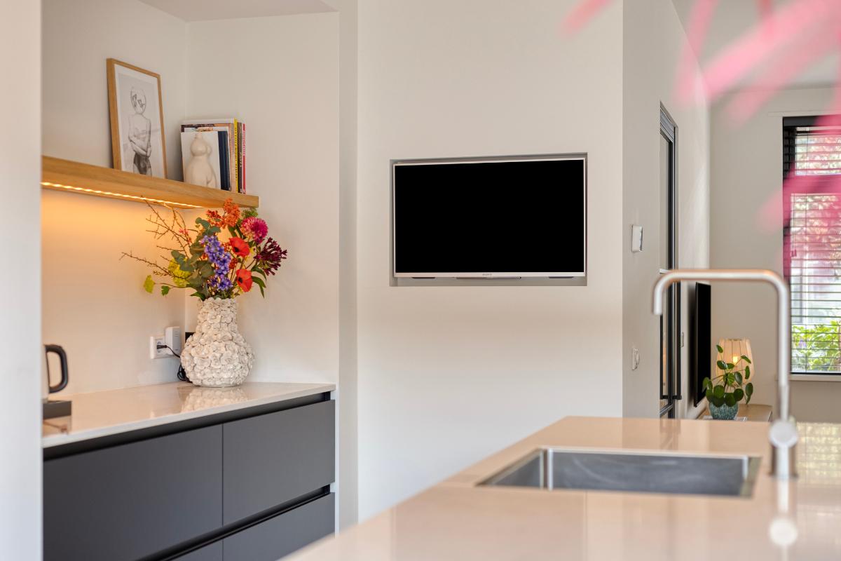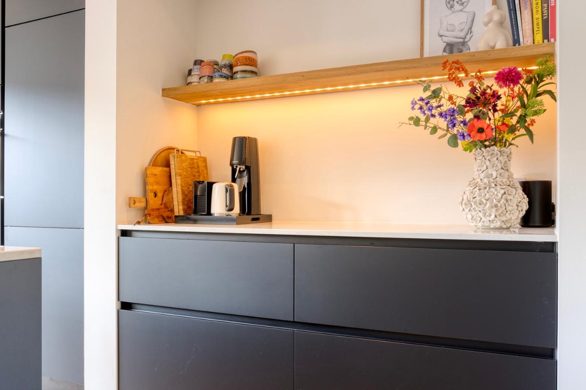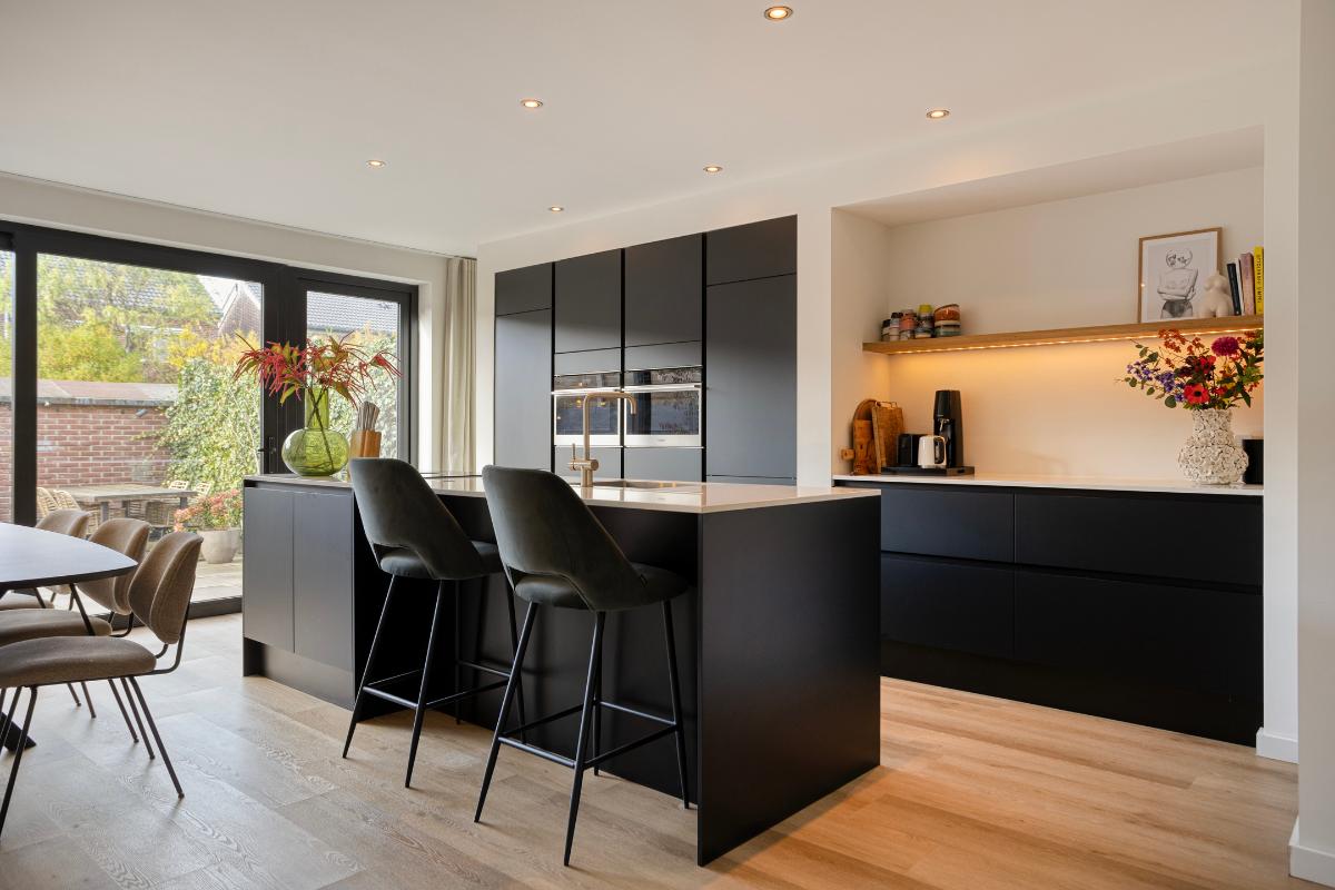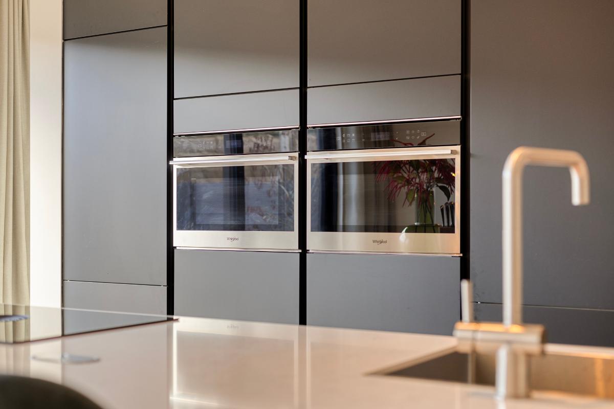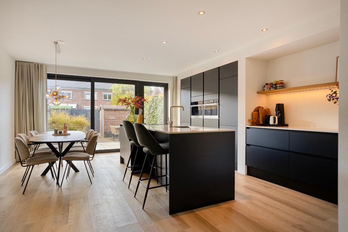 WOONKAMER & LEEFKEUKEN De ruime living biedt plaats aan zowel een zit- als een eetgedeelte. Aan de achterzijde is de woning over de volledige breedte uitgebouwd, waardoor een royale woon-/leefkeuken is ontstaan. De keuken bestaat uit een hoge kastenwand met inbouwapparatuur, een extra werkblad/coffeecorner en een kook-/spoeleiland met bar. De inbouwapparatuur bestaat uit een dubbele oven-/magnetron, koelkast, vriezer, vaatwasser en Bora inductiekookplaat met geïntegreerde afzuiging. De keuken is afgewerkt met een fraai composiet werkblad. Aan de achterzijde biedt een volledig te openen aluminium schuifpui toegang tot de tuin.