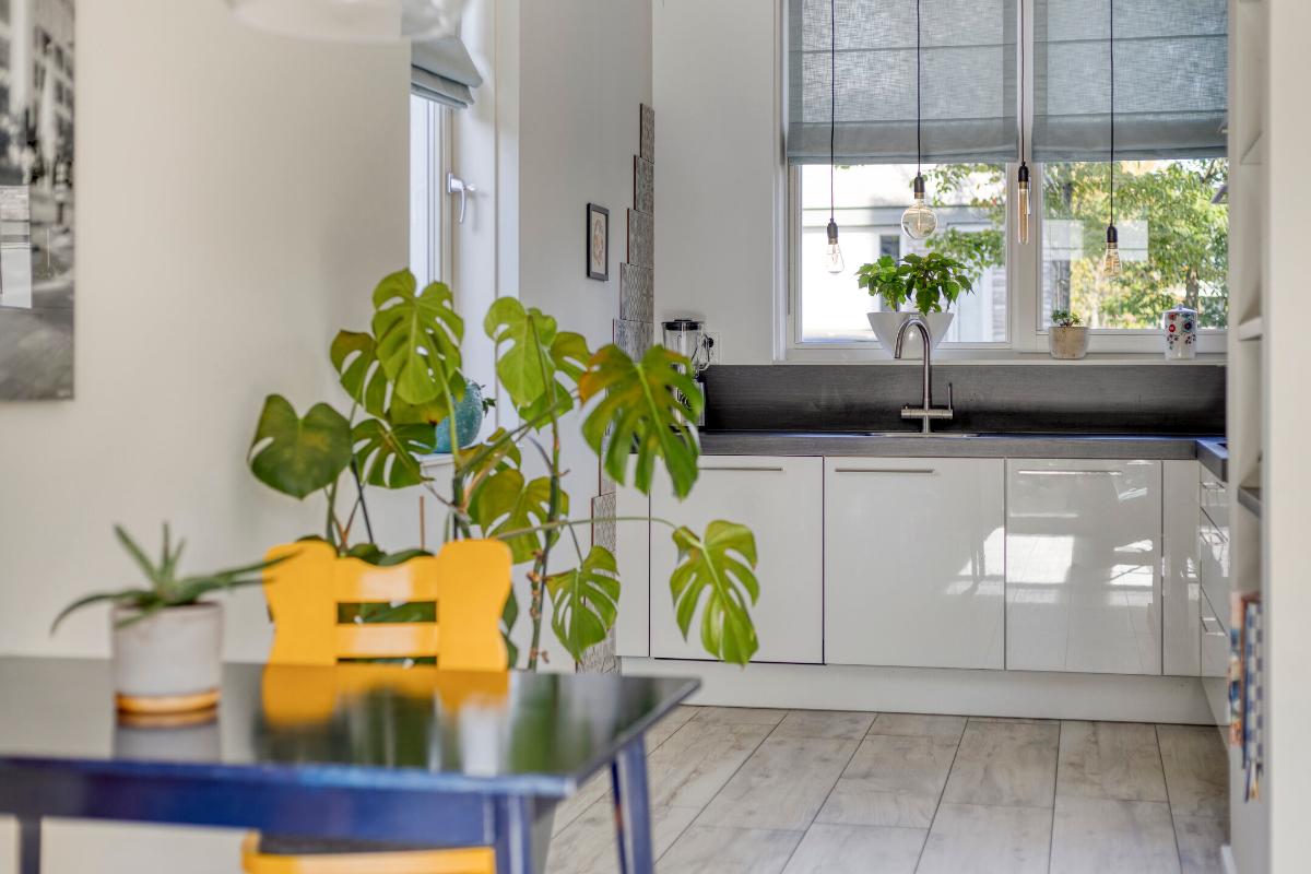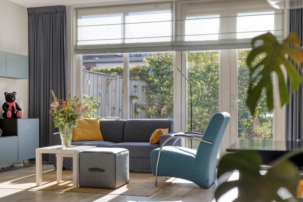 Ruime en lichte woonkamer dankzij de grote glazen pui met openslaande deuren naar de tuin.