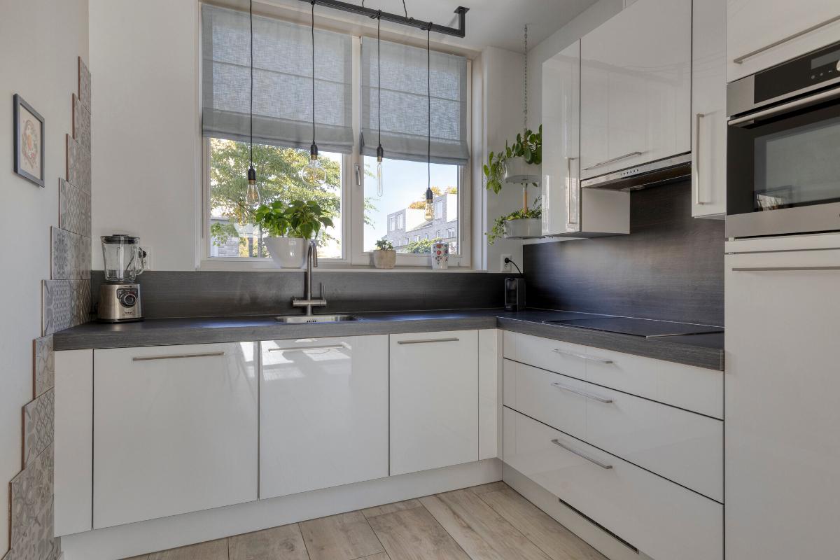 Open keuken aan de voorzijde, compleet uitgerust met moderne inbouwapparatuur (o.a. inductiekookplaat, Quooker, vaatwasser, combi-oven, koel-vriescombinatie).