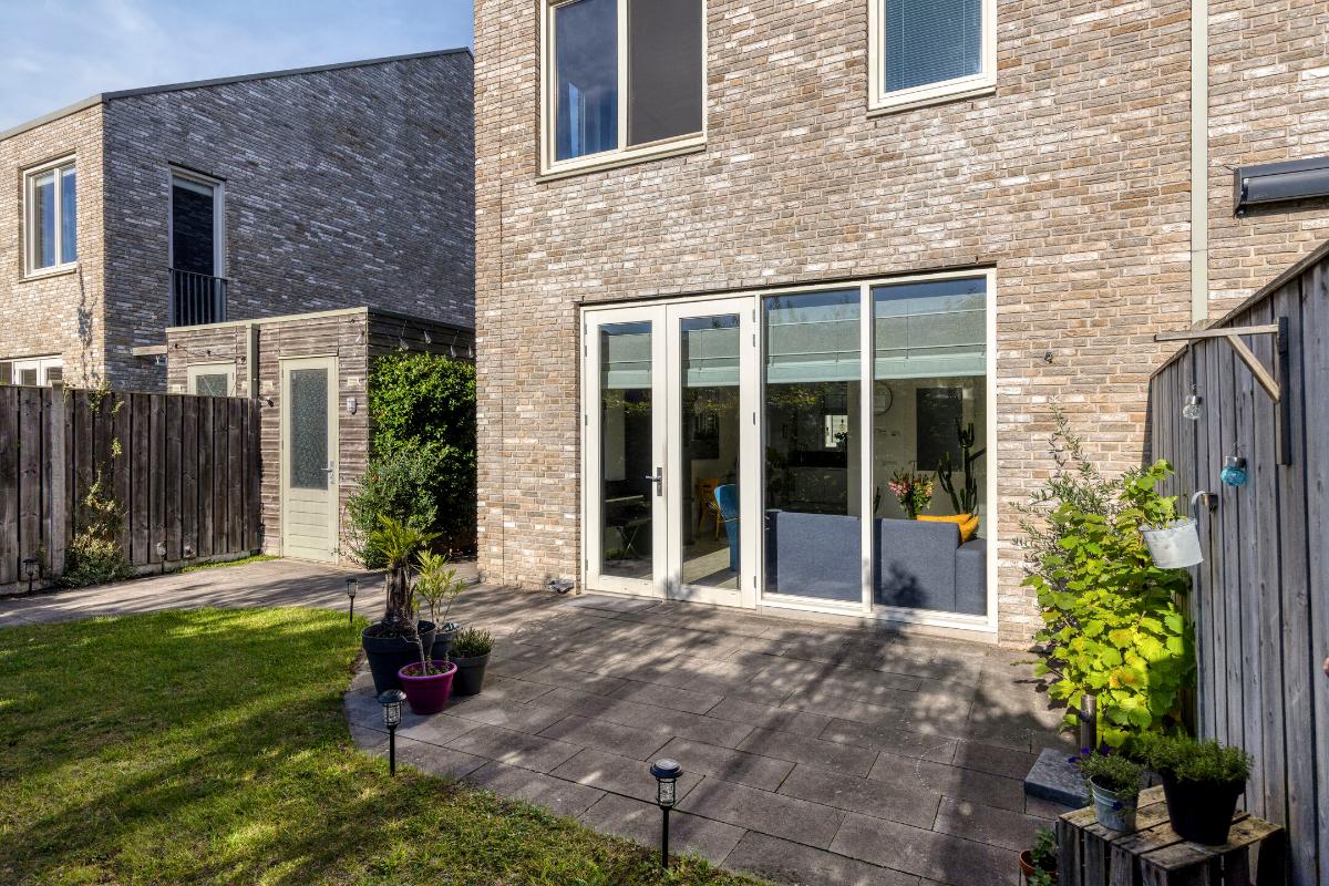 Een zonnige, privacy-rijke achtertuin op het zuidwesten, met terras, gazon, volwassen beplanting en een separate berging met overkapping. Dankzij de vrije ligging geniet je volop van rust, zon en privacy. De tuin is te bereiken via een achterom bij de eigen oprit.