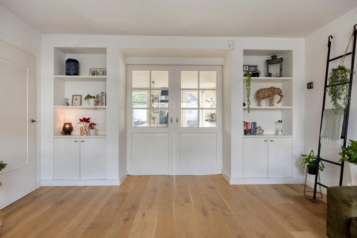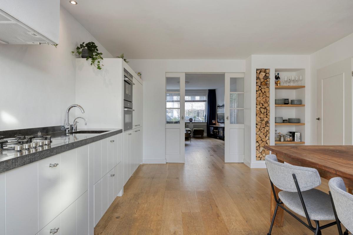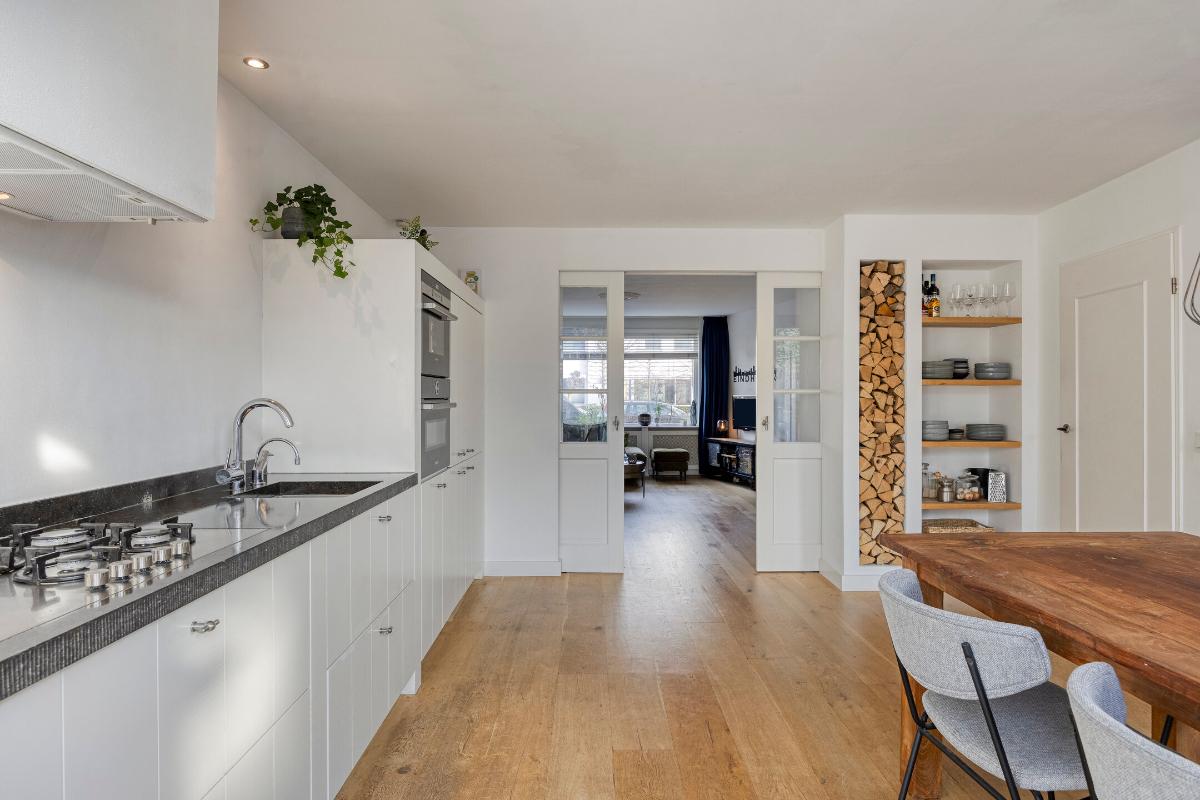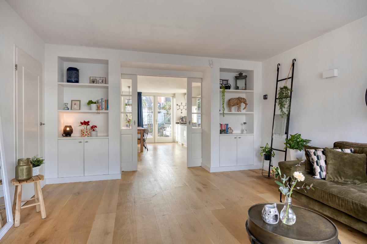 Aan de voorzijde gelegen sfeervolle woonkamer met massief houten vloer en praktische trapkast. Via fraaie en-suite deuren met vaste kasten is de woonkamer gescheiden van de leefkeuken.