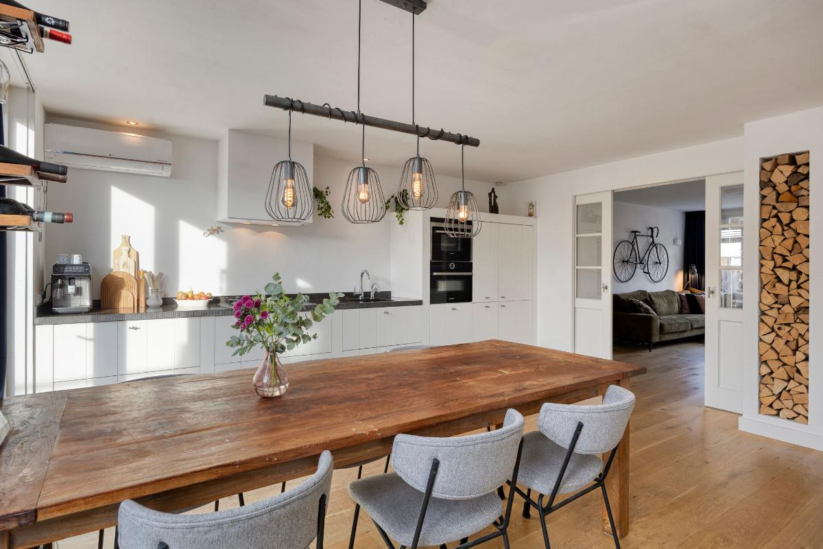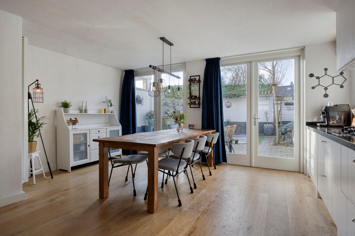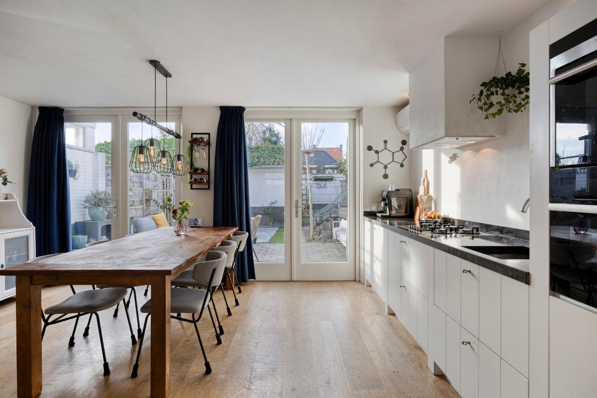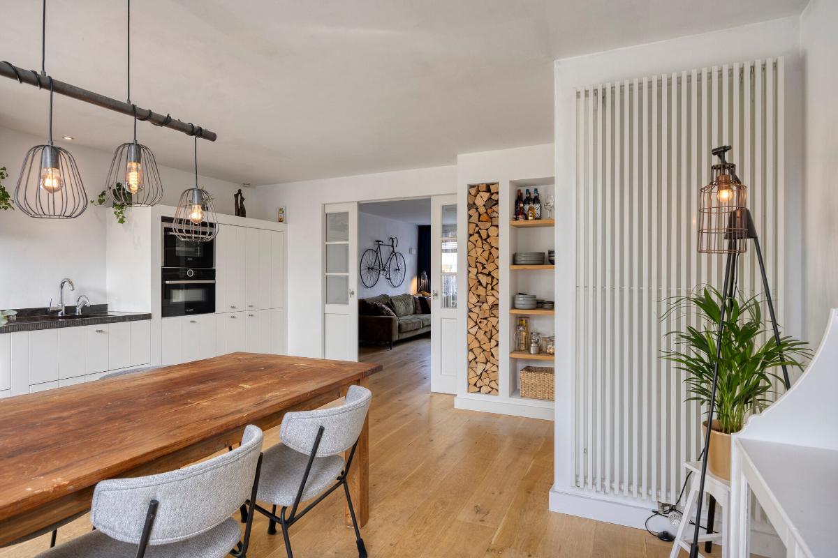 Aan de voorzijde gelegen sfeervolle woonkamer met massief houten vloer en praktische trapkast. Via fraaie en-suite deuren met vaste kasten is de woonkamer gescheiden van de leefkeuken.