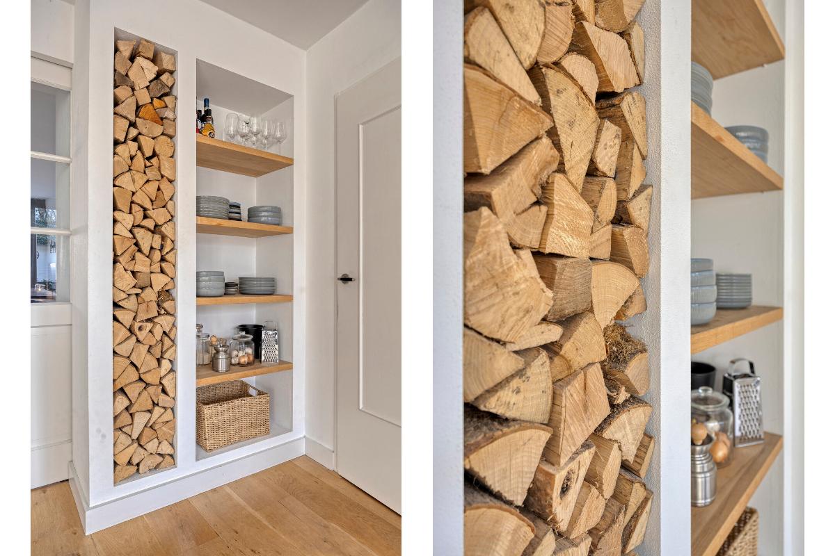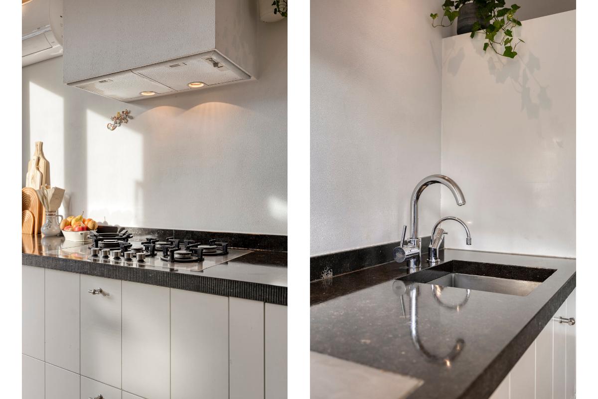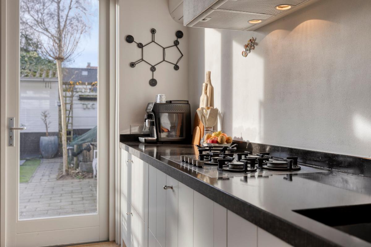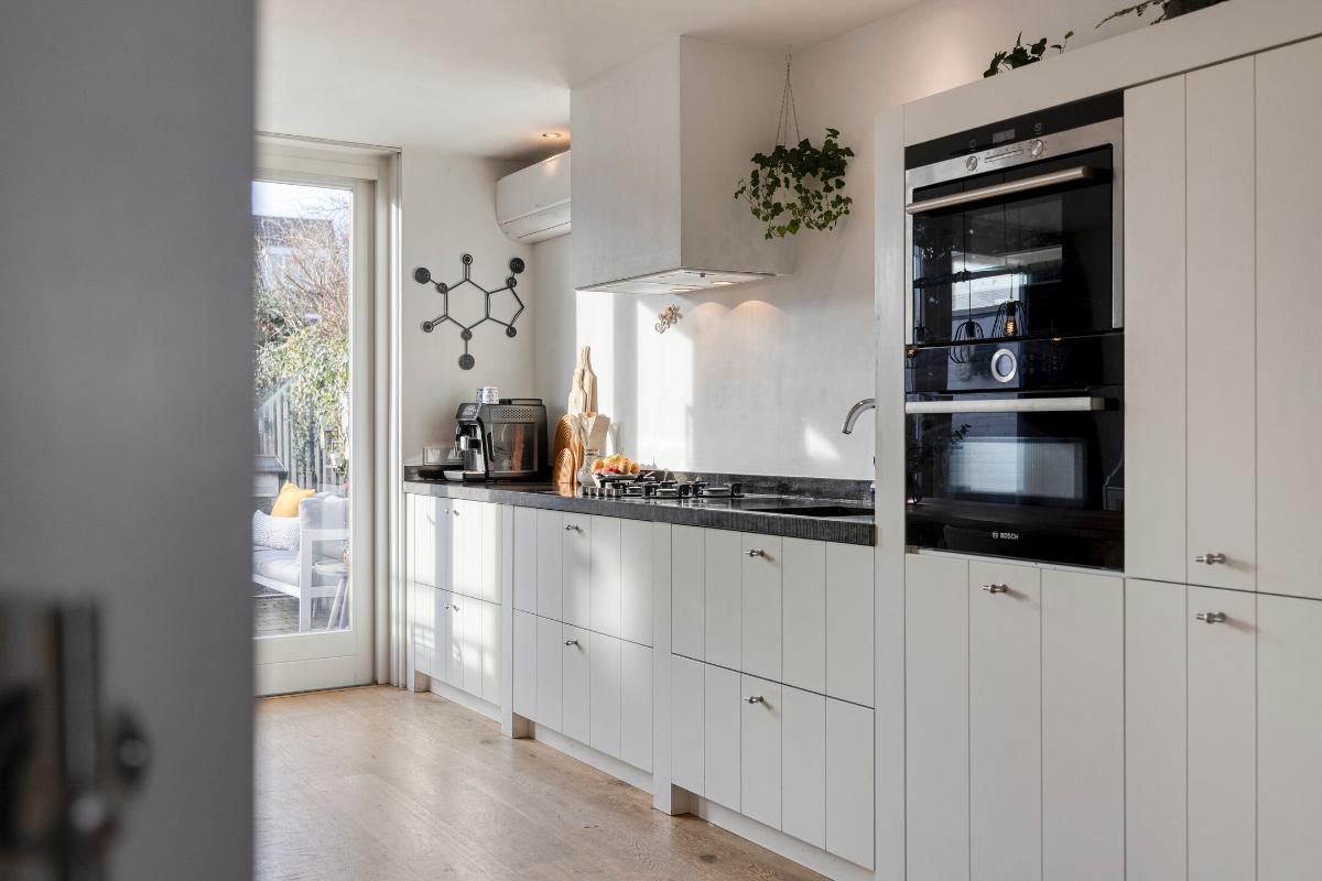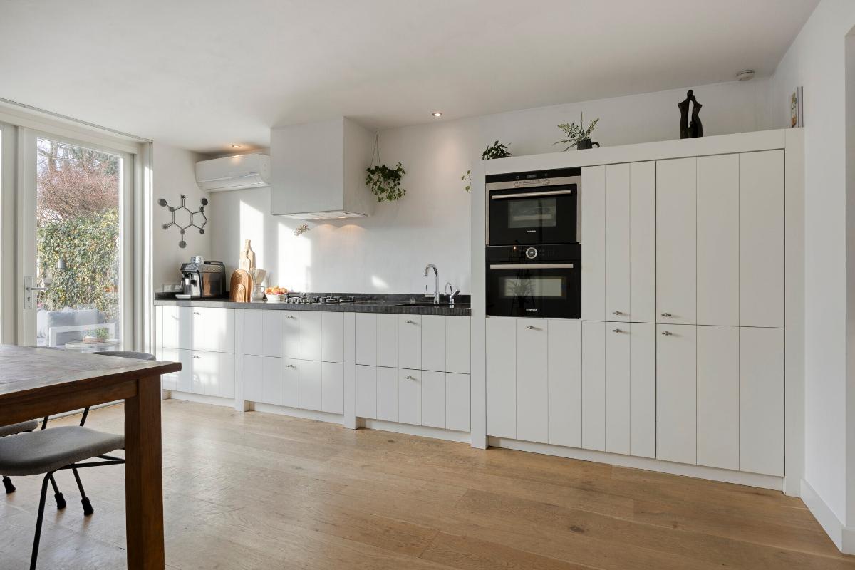 De royale leefkeuken aan de achterzijde is voorzien van een massief houten vloer, ingebouwde verlichting, airco en twee dubbele openslaande deuren naar de tuin. De luxe keukeninrichting beschikt over een Belgisch hardstenen werkblad met spoelbak, Quooker, ingebouwd gas-kookplateau, afzuigkap, vaatwasmachine, koelkast, combi-oven, stoomoven, apothekerskast en diverse laden en kasten.