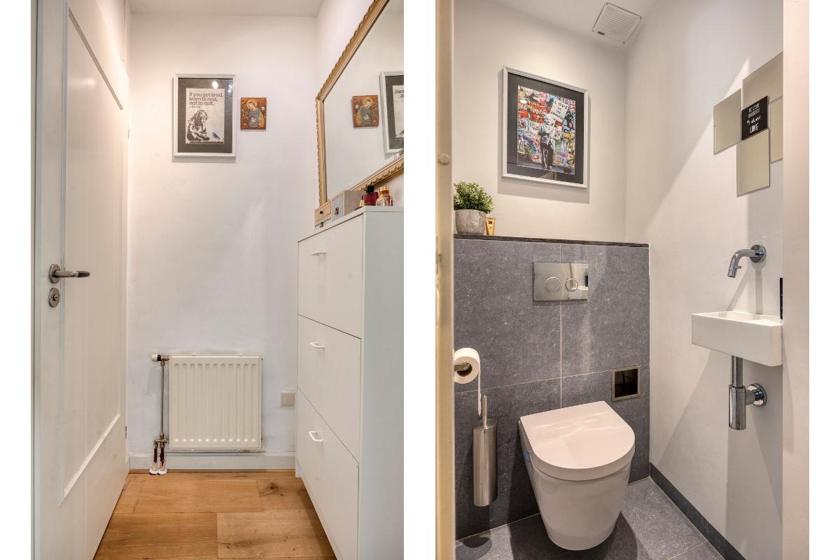 Via een portaal is de modern betegelde toiletruimte bereikbaar, voorzien van wandcloset en fonteintje.