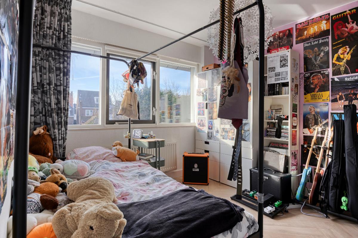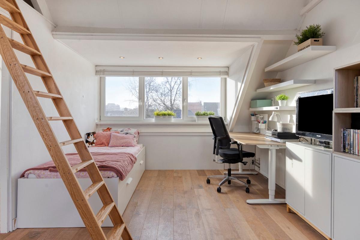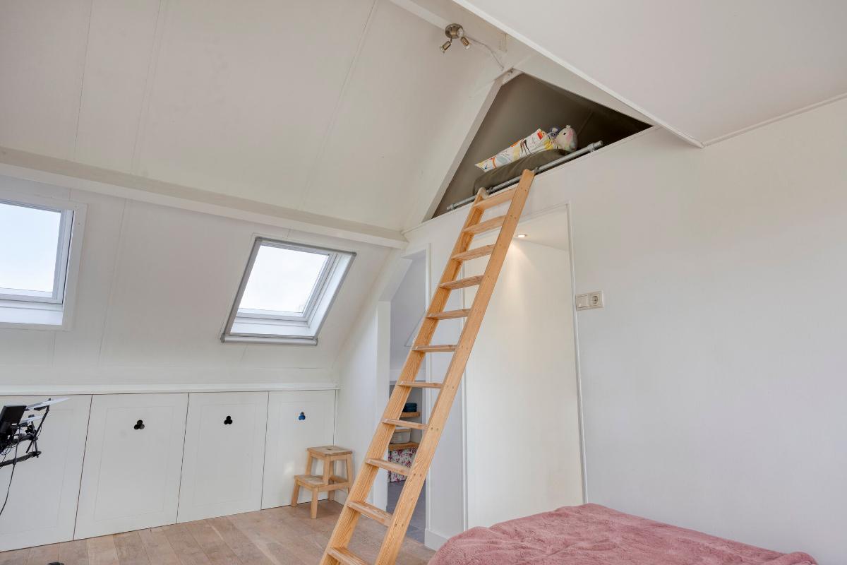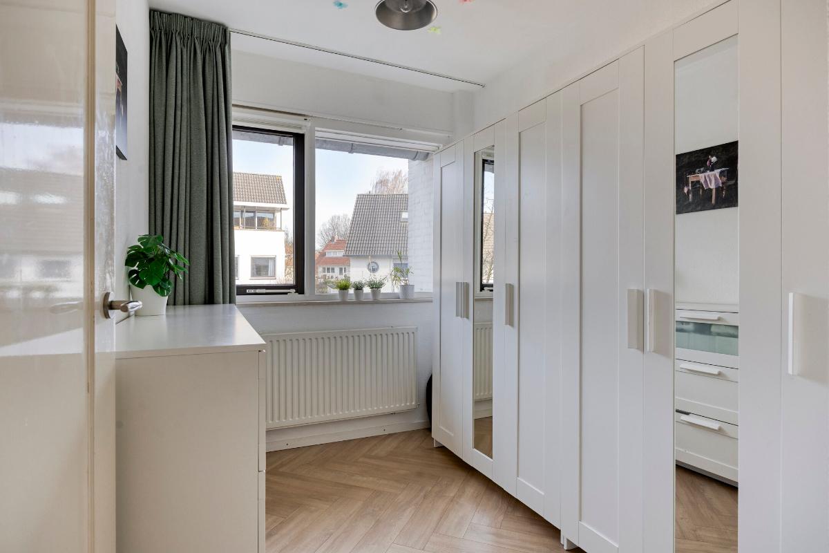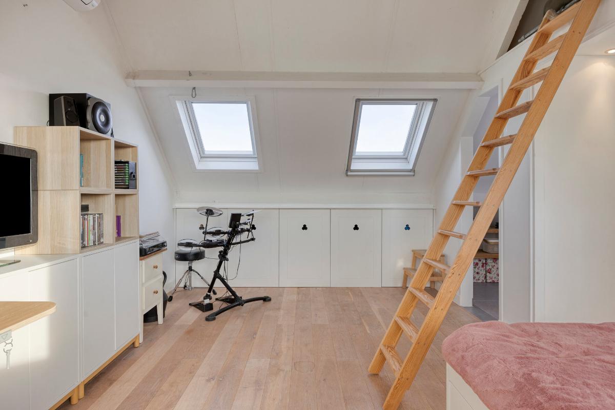De royale vierde slaapkamer is licht en ruim en beschikt over lamelparketvloer, ingebouwde verlichting, airco. twee Velux dakvensters waarvan één met hor, een grote dakkapel met hor, bergruimte in de knieschotten en een bergvide. Dankzij de vele ramen geniet deze kamer van een zeer prettige lichtinval.