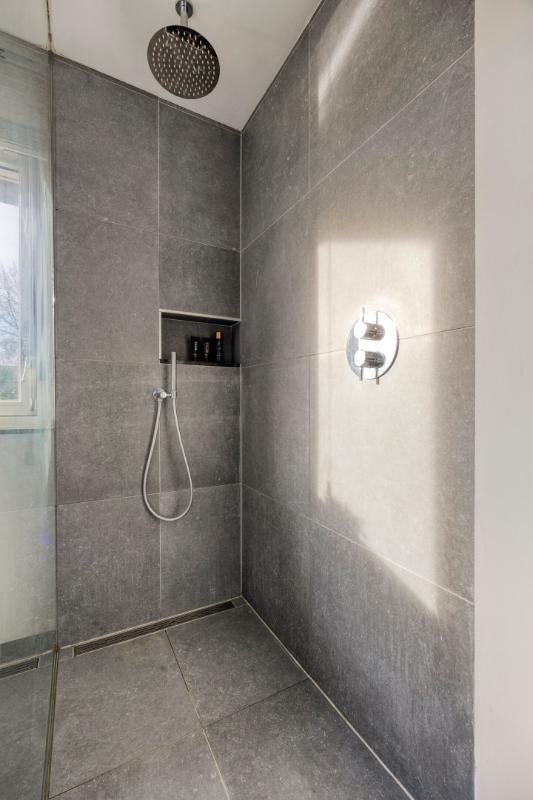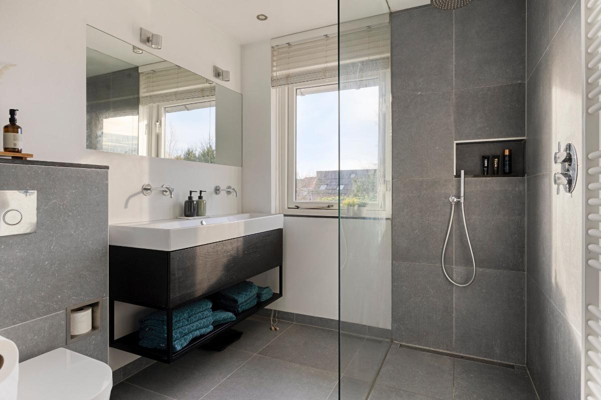 De moderne badkamer is geheel betegeld en uitgerust met een ruime inloopdouche met hand- en regendouche, een badkamermeubel met twee kranen, wandcloset en designradiator.