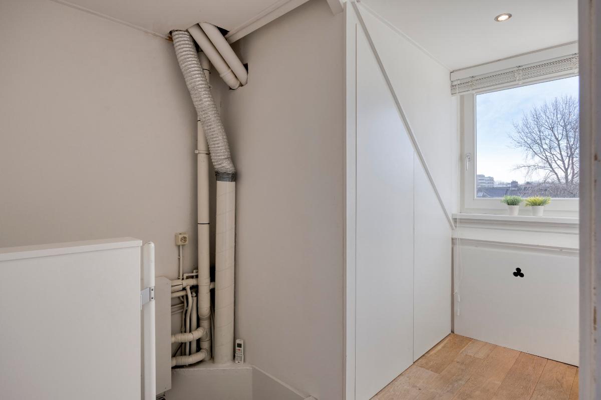 Tweede verdieping Overloop met lamelparketvloer, dakkapel en ingebouwde kasten met aansluiting voor wasapparatuur en opstelling van de cv-combiketel.