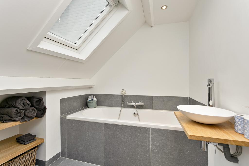 De tweede moderne badkamer is voorzien van een ligbad, waskom, designradiator, opbergruimte, ingebouwde verlichting en een Velux dakvenster.