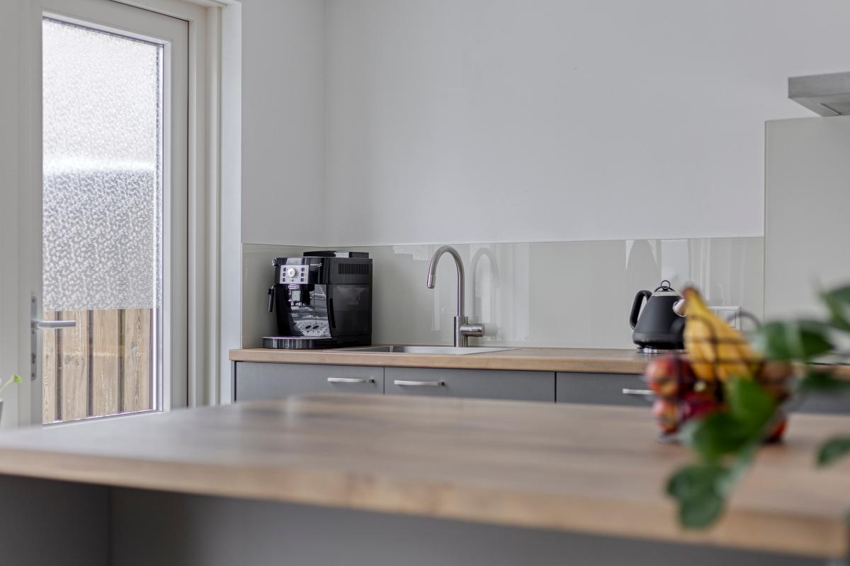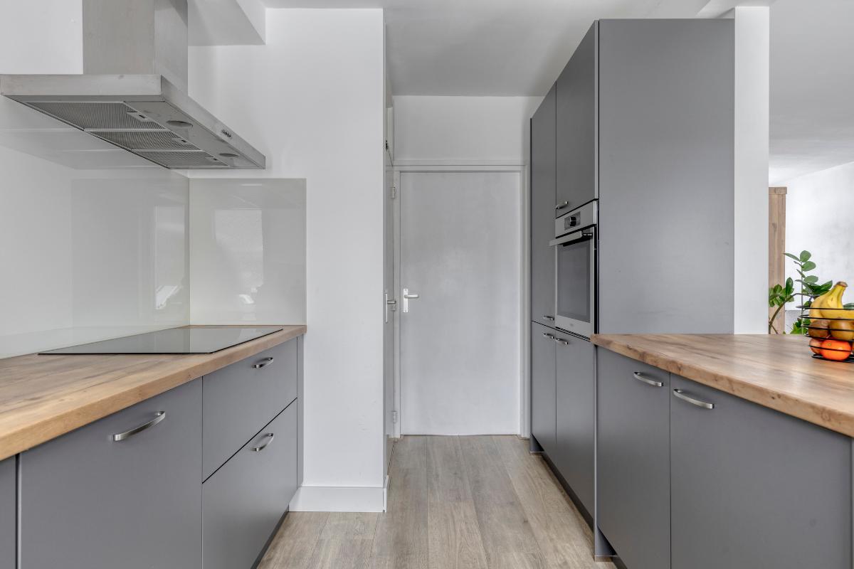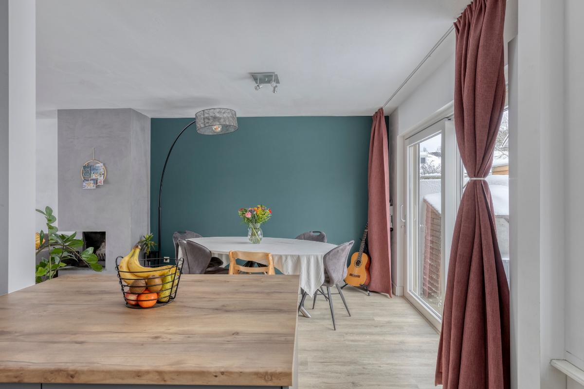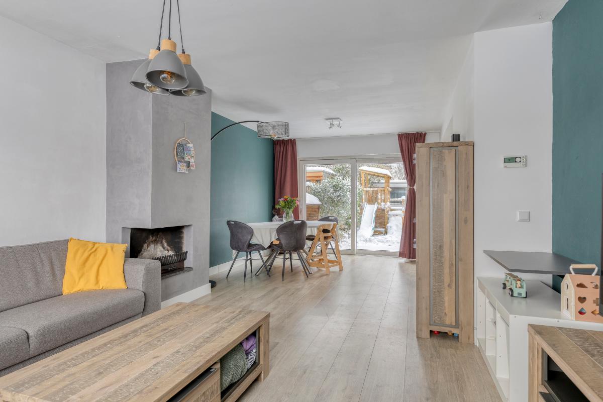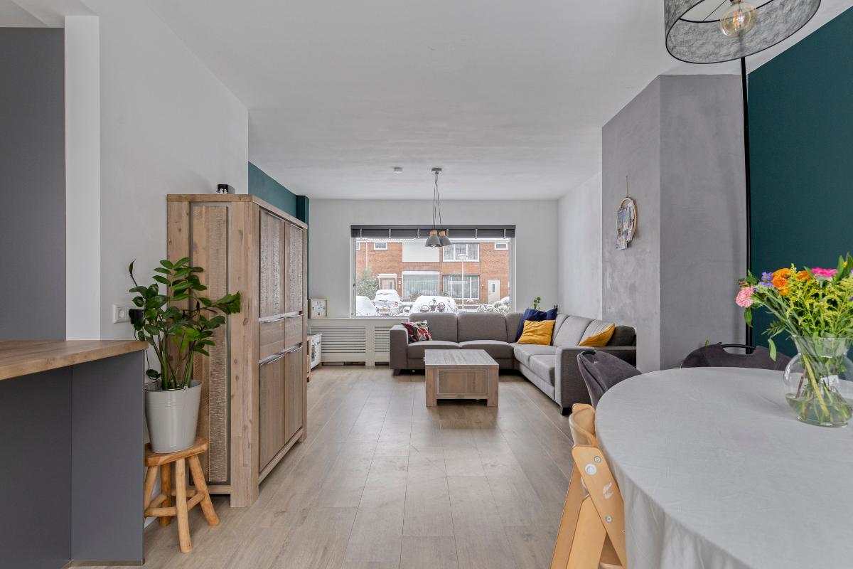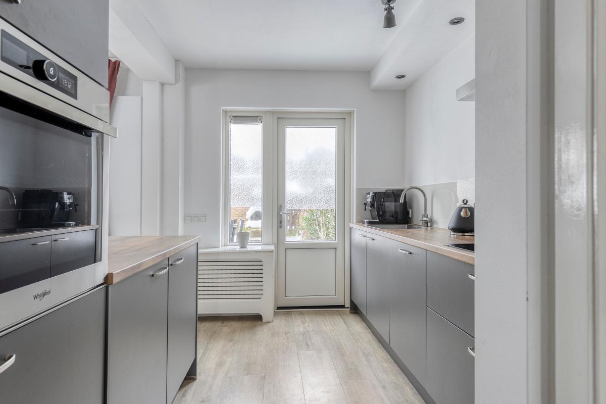 Woonkamer / keuken De ruime woonkamer biedt plaats aan zowel een comfortabele zithoek als een royale eethoek. Aan de voorzijde bevindt zich een sfeervolle houthaard. Aan de achterzijde zorgen een schuifpui en loopdeur voor direct tuincontact. Zowel aan de voor- als achterzijde geniet je van veel privacy. De open keuken (2022), uitgevoerd in parallelopstelling, is voorzien van diverse inbouwapparatuur. Aansluitend bevindt zich een praktische berg-/provisiekast met meterkast (vernieuwde groepenkast).