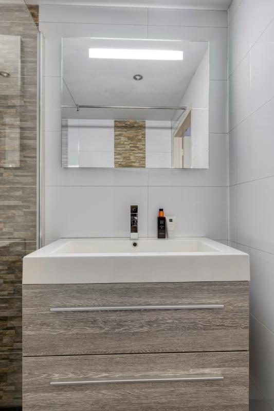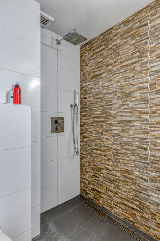 Badkamer De vergrote badkamer is ingericht met een inloopdouche met regendouche en glazen wand, wastafelmeubel en een Sanibroyeur.
