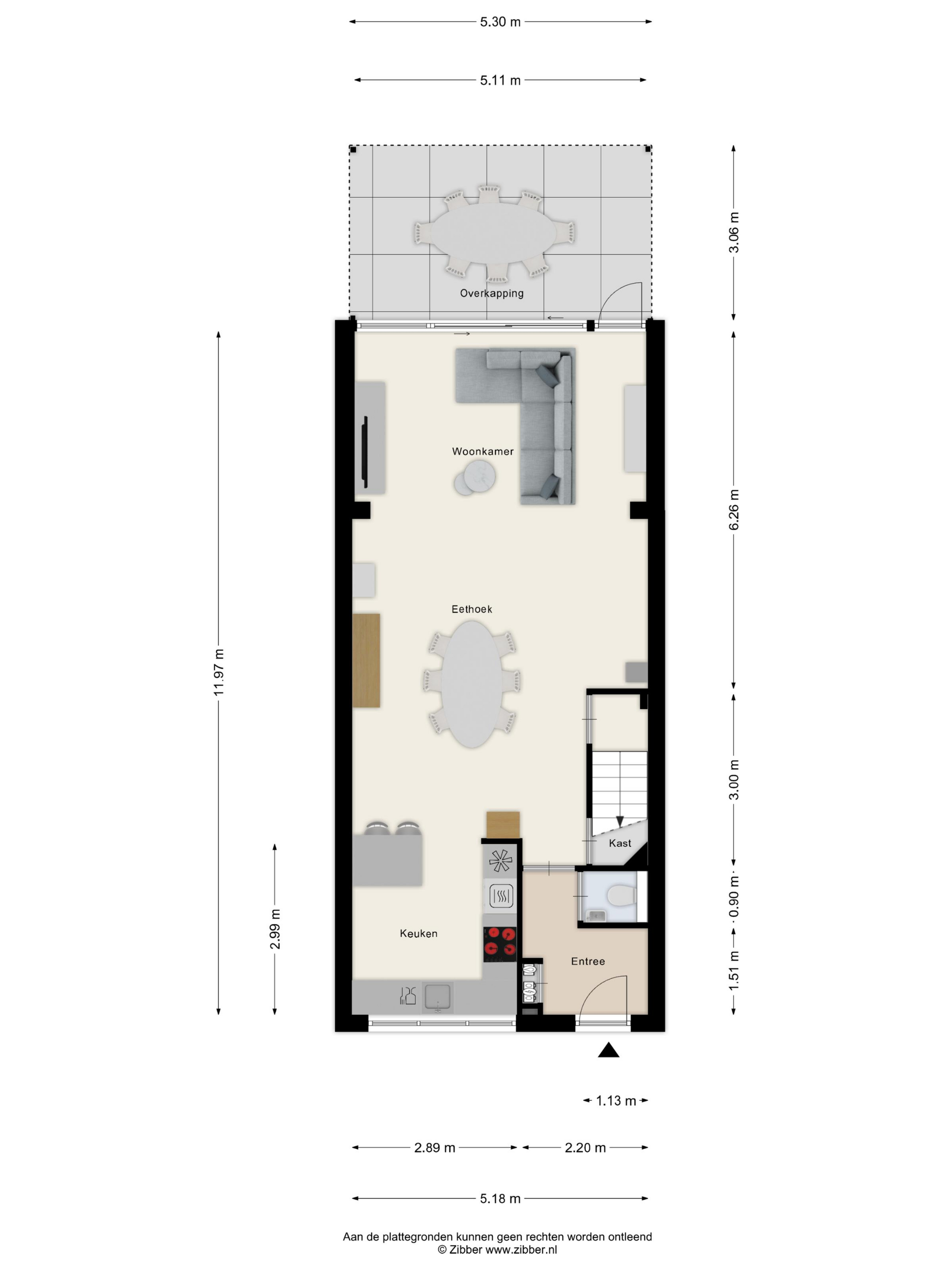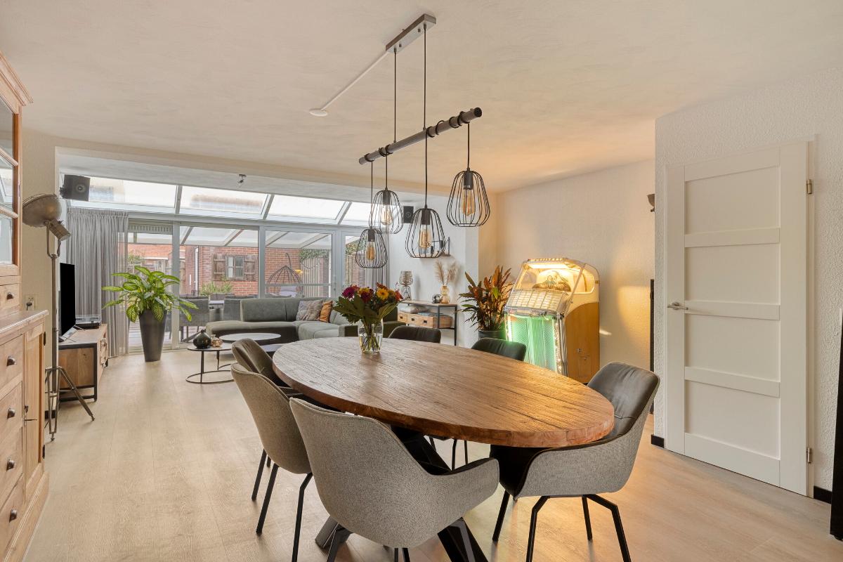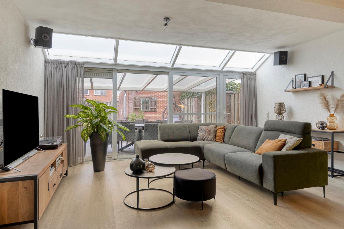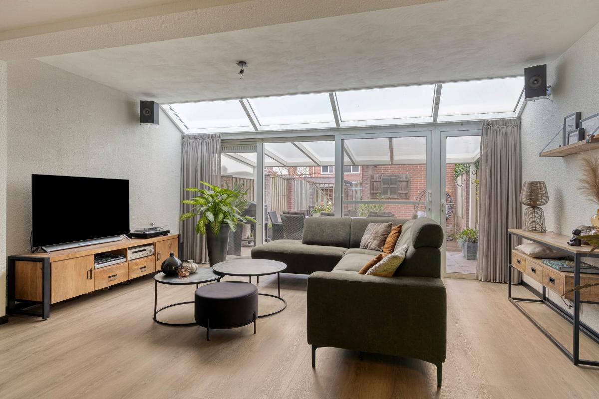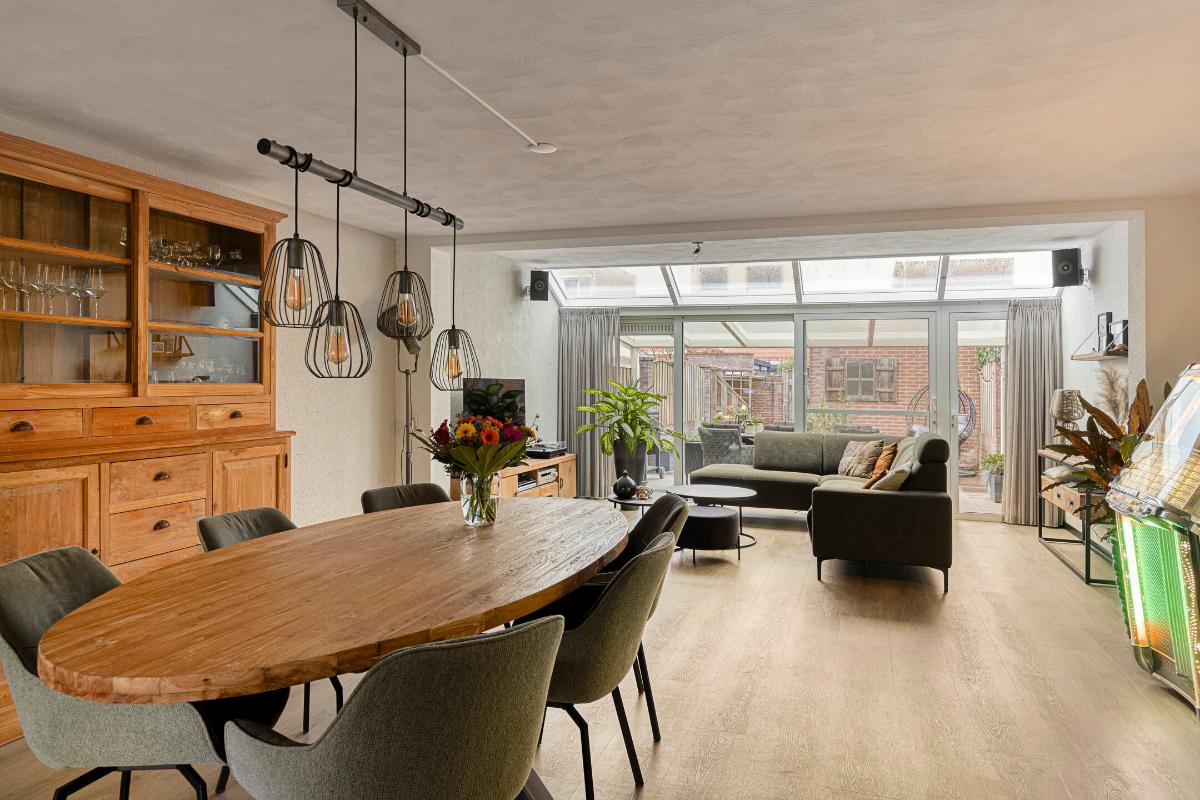WOONKAMER/KEUKEN Zeer ruime living met voldoende ruimte voor het plaatsen van een eet- en zithoek. De woning is aan de achterzijde over de volledige breedte uitgebouwd middels een aluminium serre. Grote raampartijen alsmede een lichtstraat zorgen voor een prettige lichtinval in de woning. Middels de geheel te openen pui trek je het buitengevoel naar binnen. Daarbij is er voorzien in een praktische loopdeur. Halverwege de woonkamer tref je een praktische berg-/provisiekast en tussenportaal met trapopgang naar de eerste verdieping.