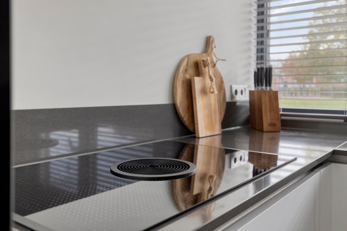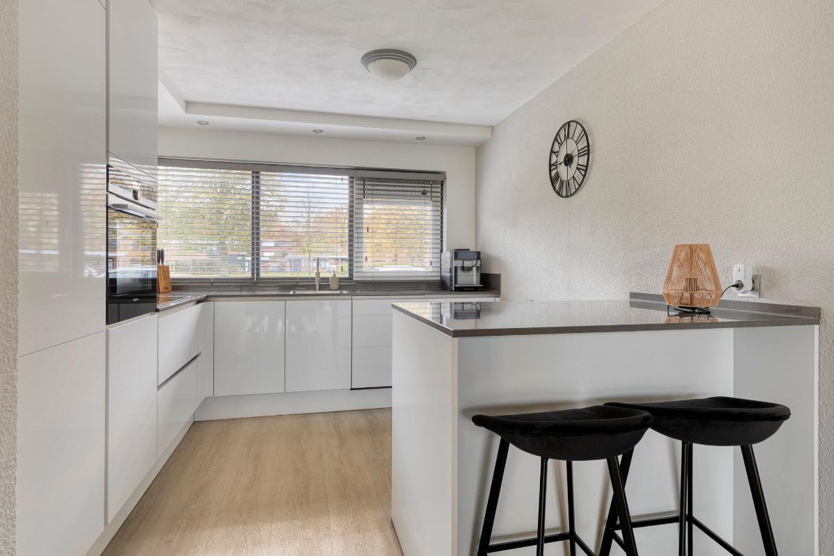 De in 2022 gerenoveerde keuken is gelegen aan de voorzijde van de woning. De luxe en hoogwaardig afgewerkte keuken is geplaatst in hoekopstelling en tevens is er voorzien in een zitbar. Daarbij is er inbouwapparatuur aanwezig, te weten: een combi-oven/magnetron, vaatwasmachine, inbouwkoelkast en vriezer, Bora inductiekookplaat met middenafzuiging en een Quooker, welke ter overname wordt aangeboden.