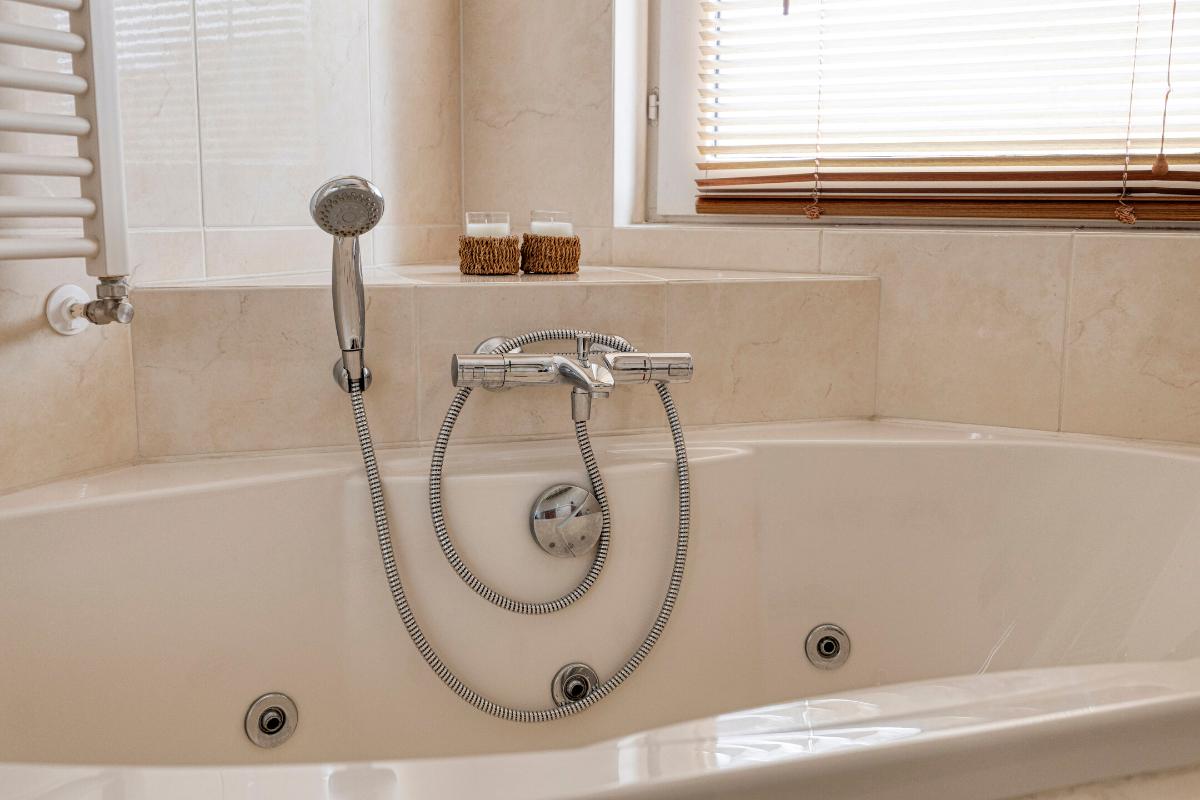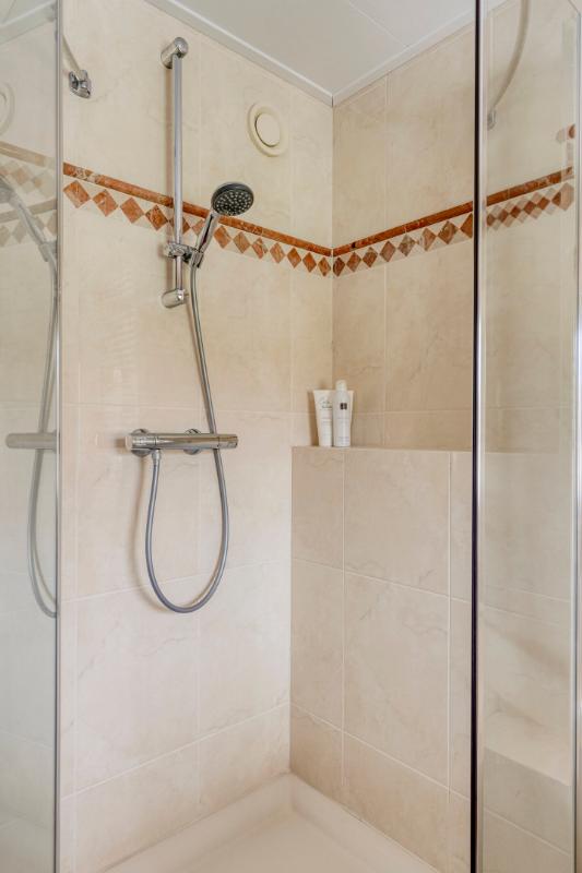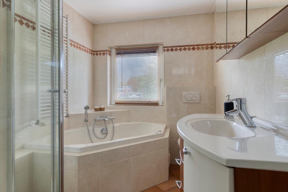 BADKAMER De badkamer is ingedeeld met een douchehoek, jacuzzi, wandcloset, dubbele wastafel in meubel en designradiator.